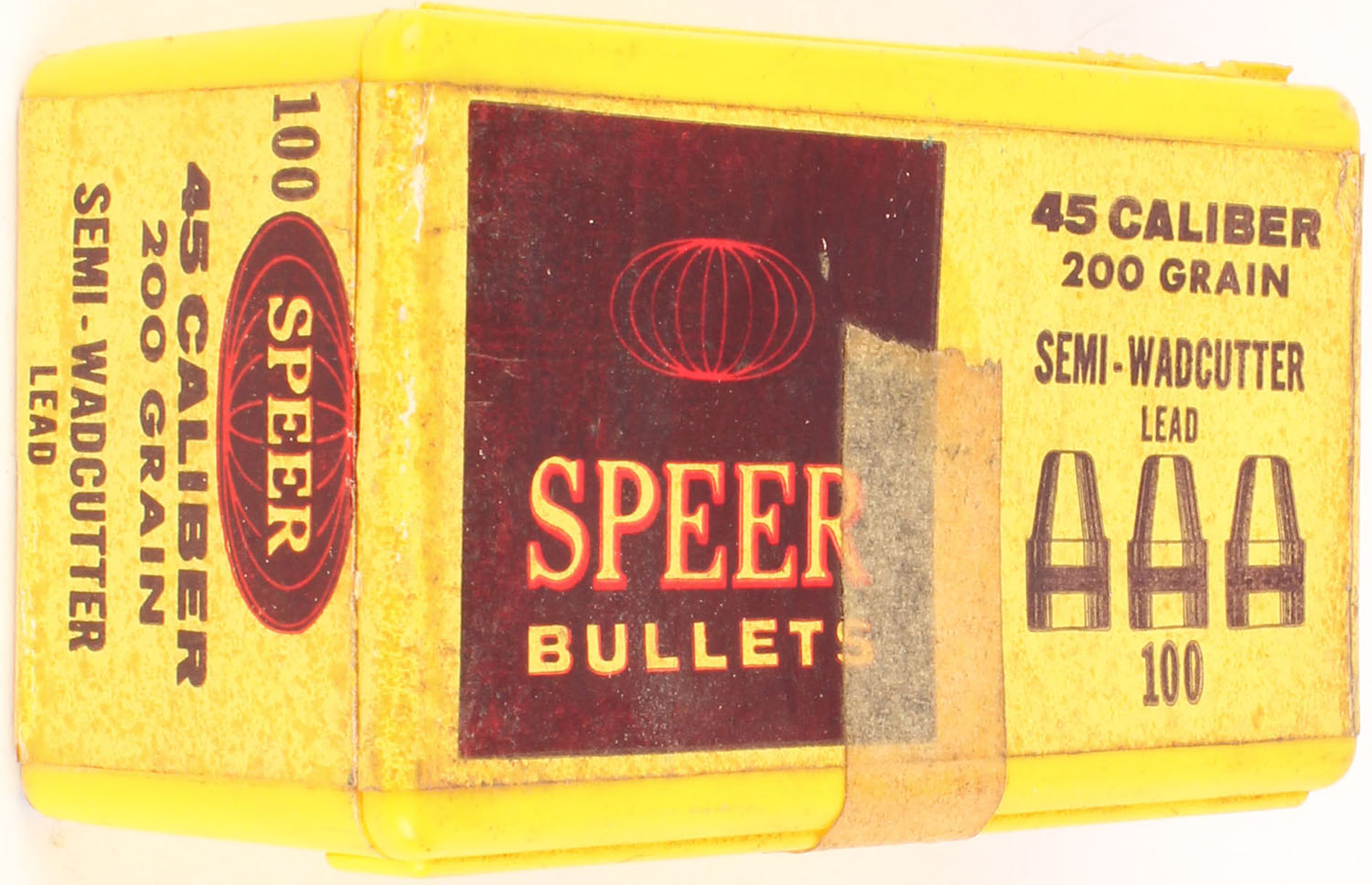 Speer, 45 Cal., 200 Grs. Semi-WadCutter Lead, Full, 1pc., multi-colored box, box is solid with very nice colors, Bullets are excellent. Grade: Excellent + - Value: 10 to 40