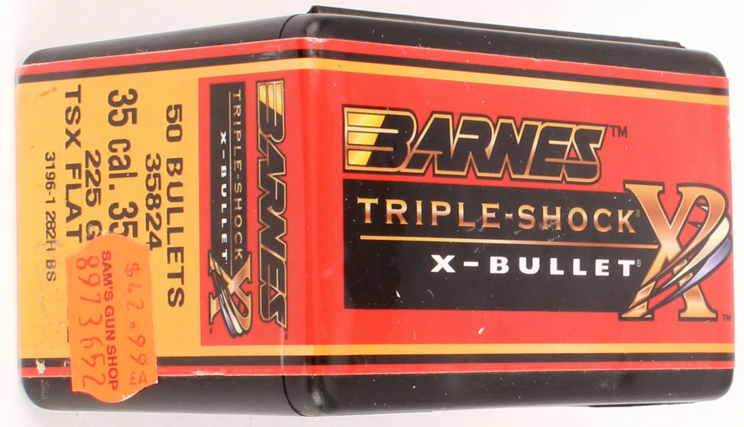 Barnes, Triple-Shock X-Bullet, 35 Cal., 225 Grs. TSX Flat Base, FULL & SEALED, 1pc., multi-colored box, box is solid with great colors. Grade: Excellent ++ - Value: 10 to 40