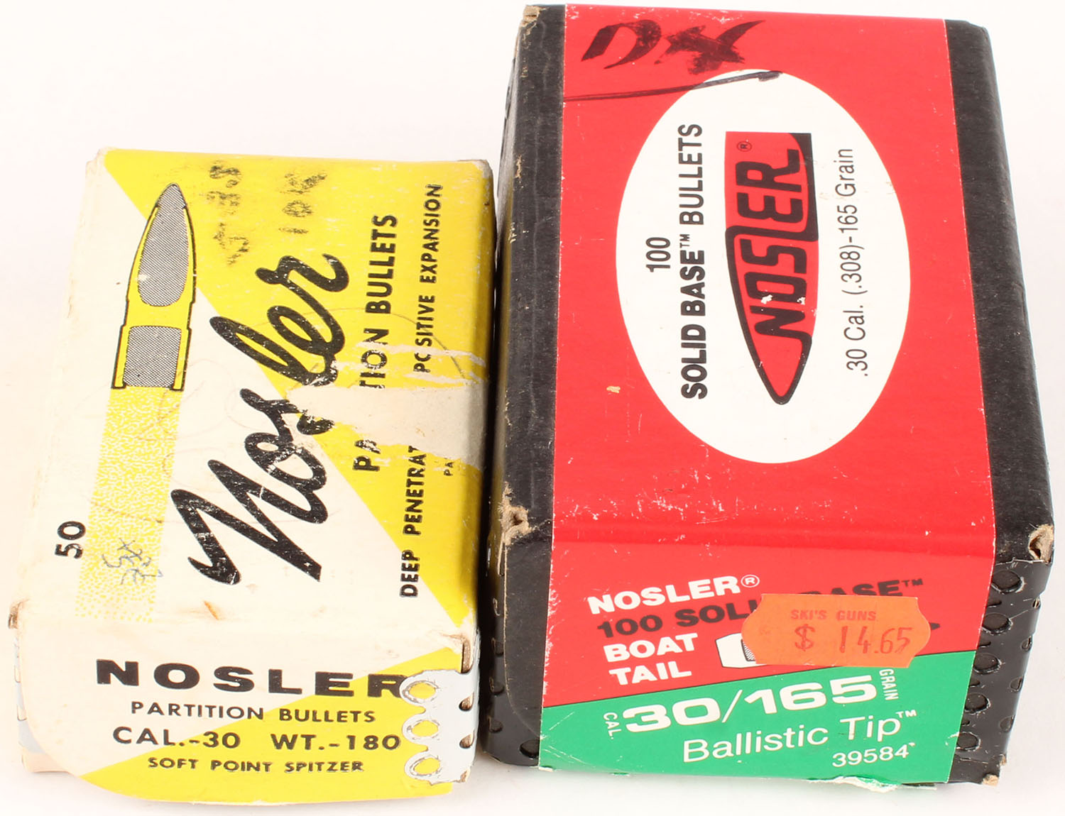 Lot of 2 Nosler, 30 Cal, 180/165 Grs. SP Spitzer/Green Ballistic Tip Boat Tail, Partial, 1pc., multi-colored box, box is solid with great colors, bullets are excellent. Grade: Excellent + - Value: 10 to 40