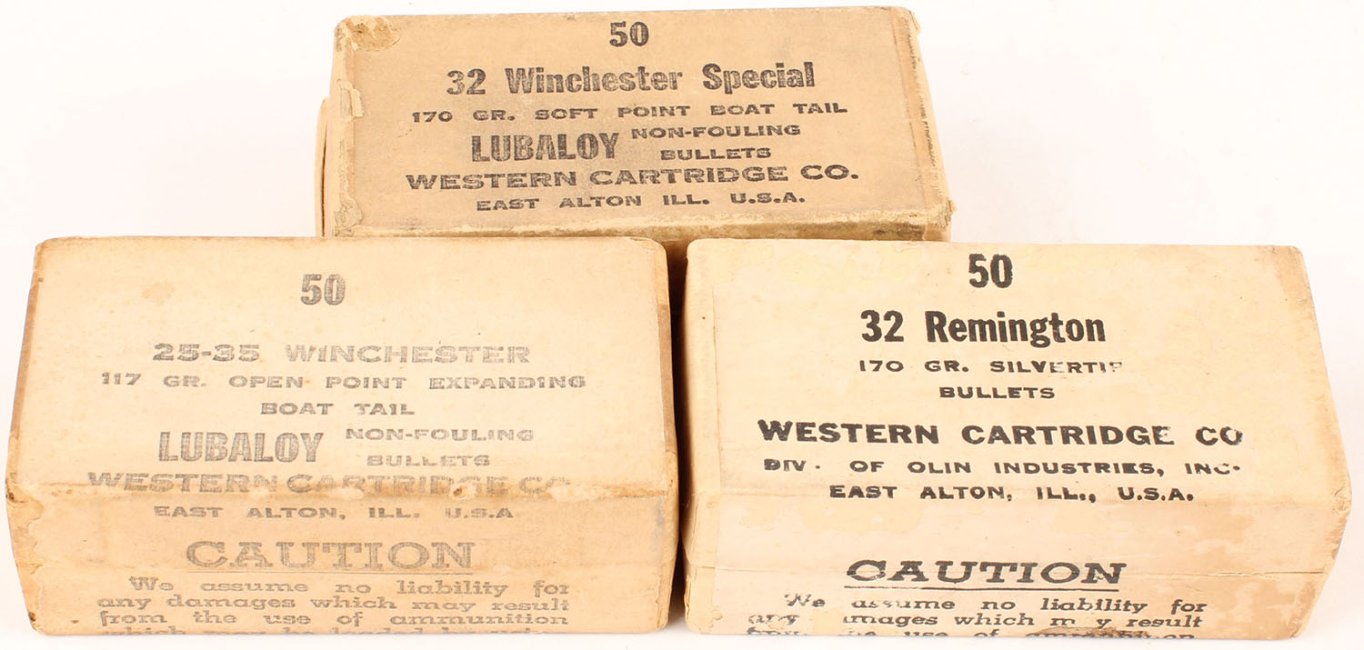 Western, 32Win/32Rem/25-35Win, 170/117 Grs. Soft Point Boat Tail/Silvertip/Open Point Expanding Boat Tail, FULL & SEALED/Full, 1pc., buff & black box, box is solid with great colors, bullets are excellent. Grade: Excellent + - Value: 10 to 40