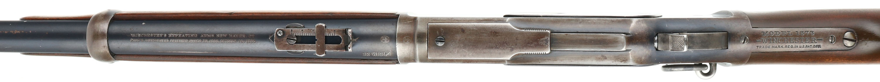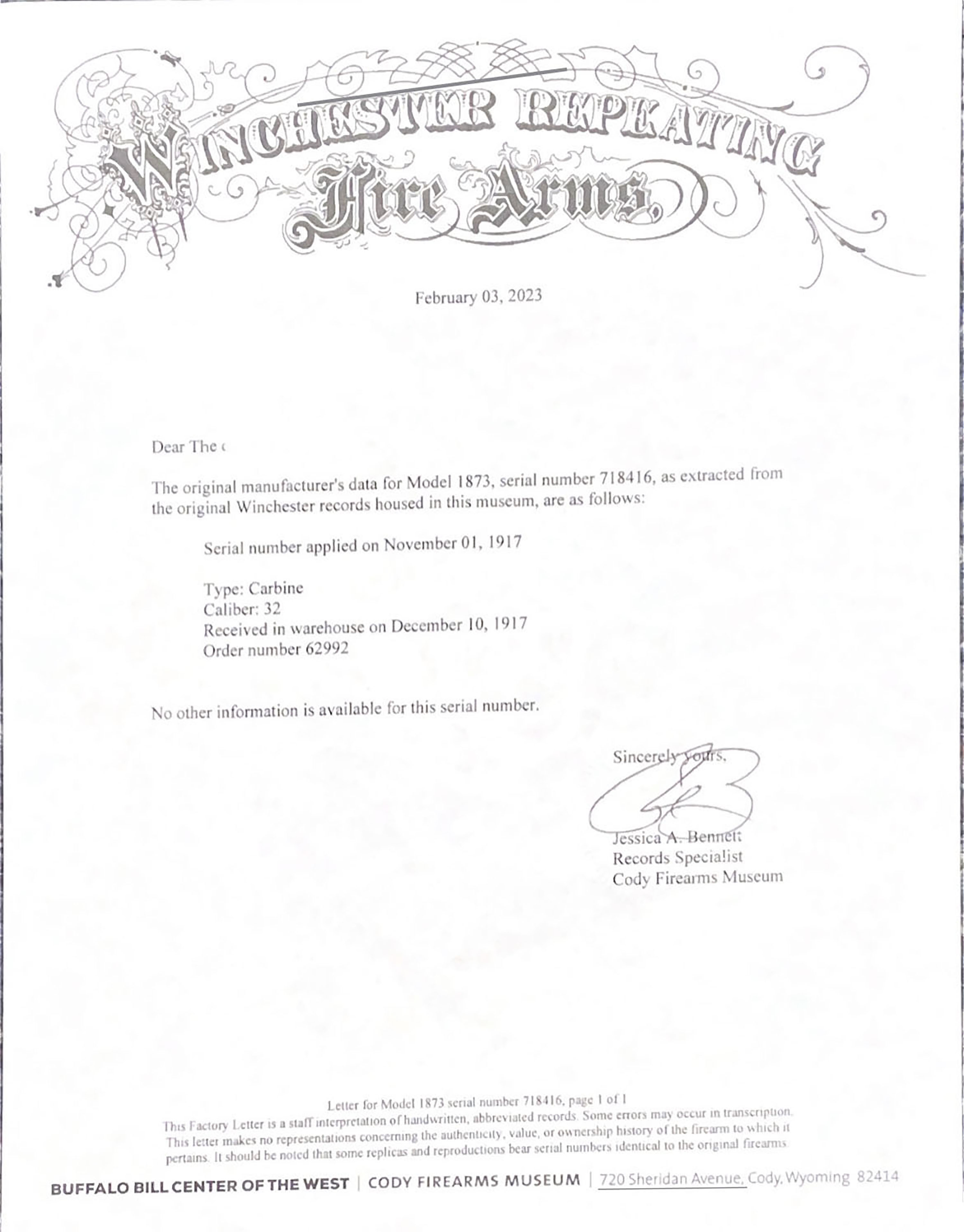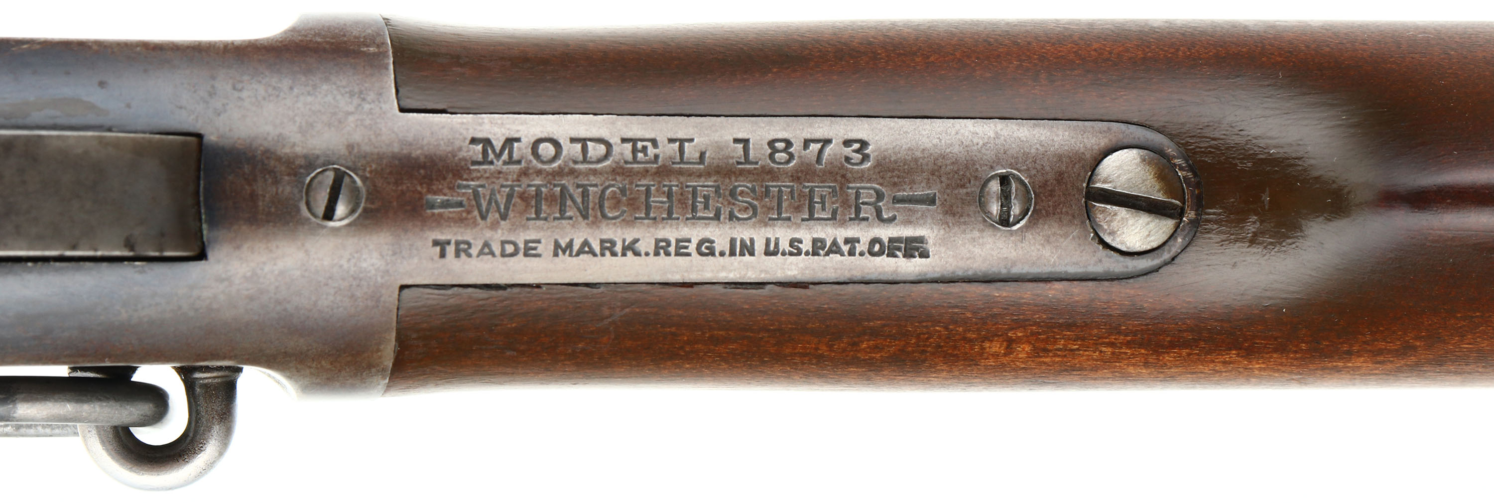 FANTASTIC Winchester, Model 1873 Saddle Ring Carbine, 3rd model, .32 WCF Cal., MFG: 1917, SN: 718416, Lever Action Carbine, 20'' Round barrel, Full mag. The original wood stocks are excellent & solid, having been cleaned, possibly lightly sanded & re-oiled. The wood has a nice aged or darkened rich chocolate brown appearance. There are a few minor handling marks & contusions. The original metal blue finish on the barrel & mag rates 85% overall. The receiver has worn mostly gun metal gray, with original blue remaining on the back half the receiver due to the protection of the side panels. Fitted with a flip-up ladder rear & box carbine front sights. Bore is very good, with some speckled roughness amongst strong rifling. Metal carbine butt. Original saddle ring. Very smooth tight action. With just over 720,000 Model 1873 guns produced, this is a very late production carbine. Comes with a Cody Factory Records Letter confirming configuration & dates. An excellent & desirable Model 1873 SRC in the rarer 32 WCF.* FFL or C&R Req. - Value: 9000 to 13000