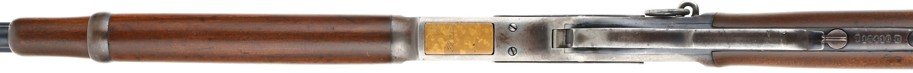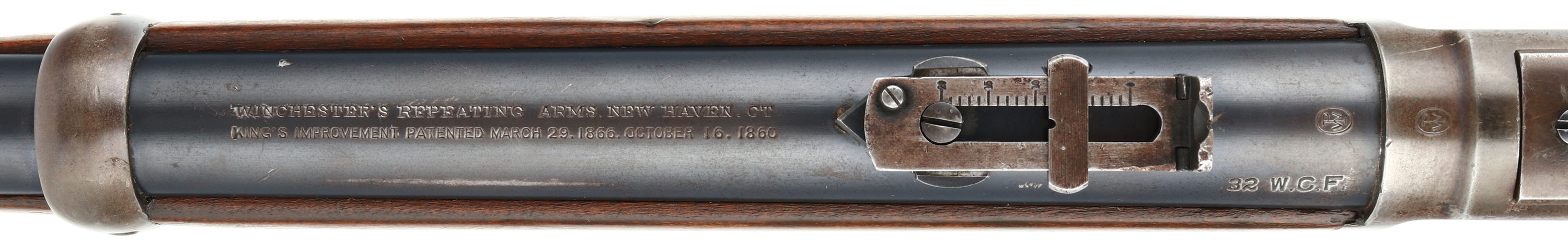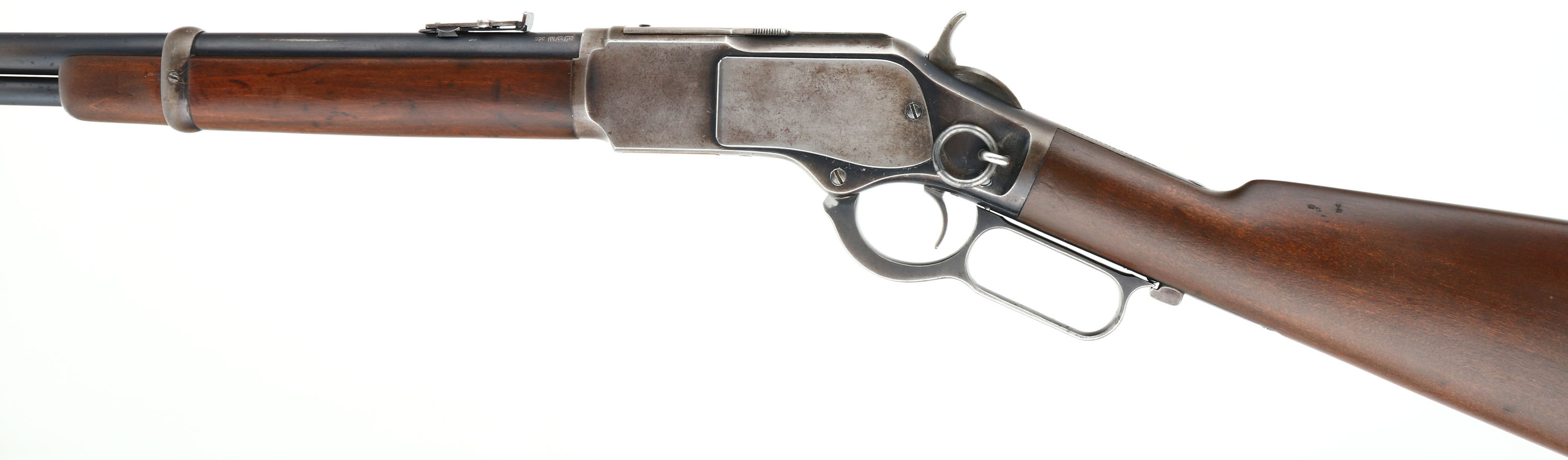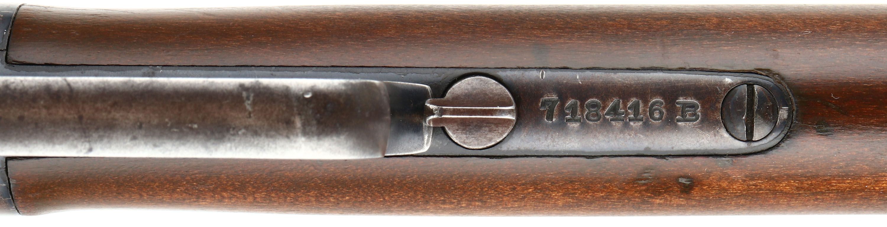 FANTASTIC Winchester, Model 1873 Saddle Ring Carbine, 3rd model, .32 WCF Cal., MFG: 1917, SN: 718416, Lever Action Carbine, 20'' Round barrel, Full mag. The original wood stocks are excellent & solid, having been cleaned, possibly lightly sanded & re-oiled. The wood has a nice aged or darkened rich chocolate brown appearance. There are a few minor handling marks & contusions. The original metal blue finish on the barrel & mag rates 85% overall. The receiver has worn mostly gun metal gray, with original blue remaining on the back half the receiver due to the protection of the side panels. Fitted with a flip-up ladder rear & box carbine front sights. Bore is very good, with some speckled roughness amongst strong rifling. Metal carbine butt. Original saddle ring. Very smooth tight action. With just over 720,000 Model 1873 guns produced, this is a very late production carbine. Comes with a Cody Factory Records Letter confirming configuration & dates. An excellent & desirable Model 1873 SRC in the rarer 32 WCF.* FFL or C&R Req. - Value: 9000 to 13000