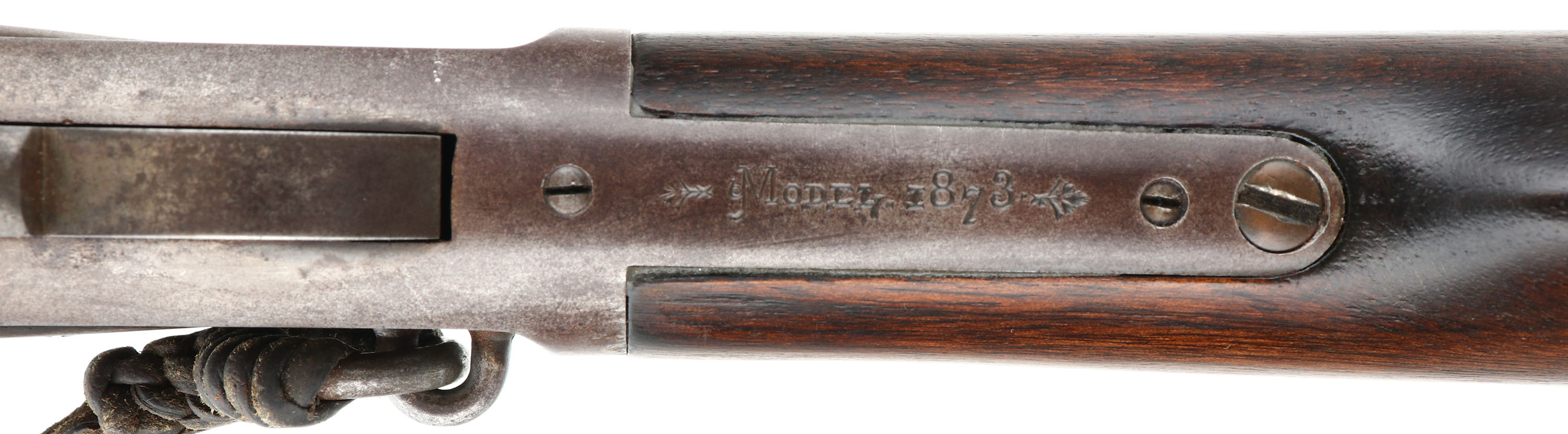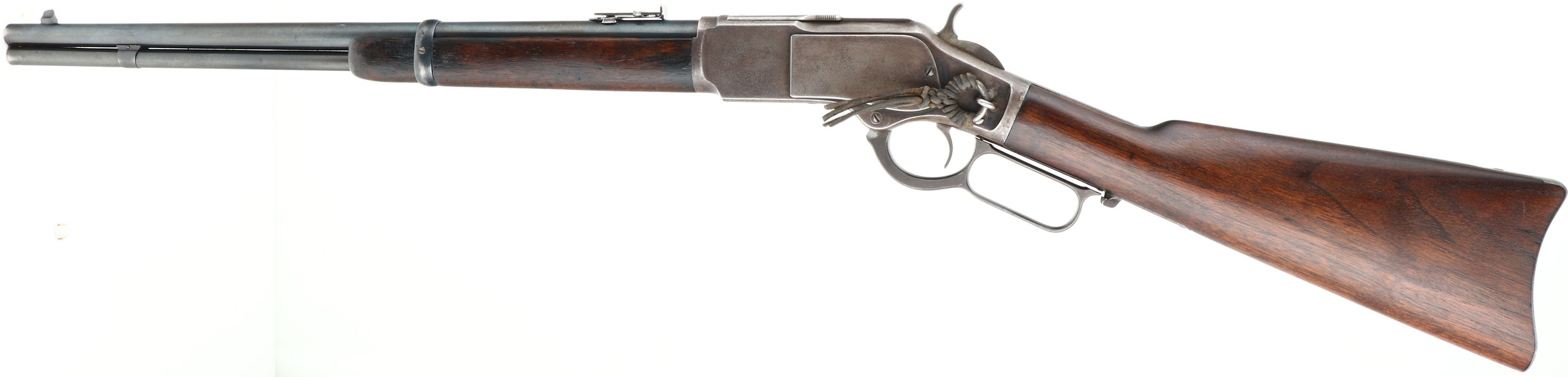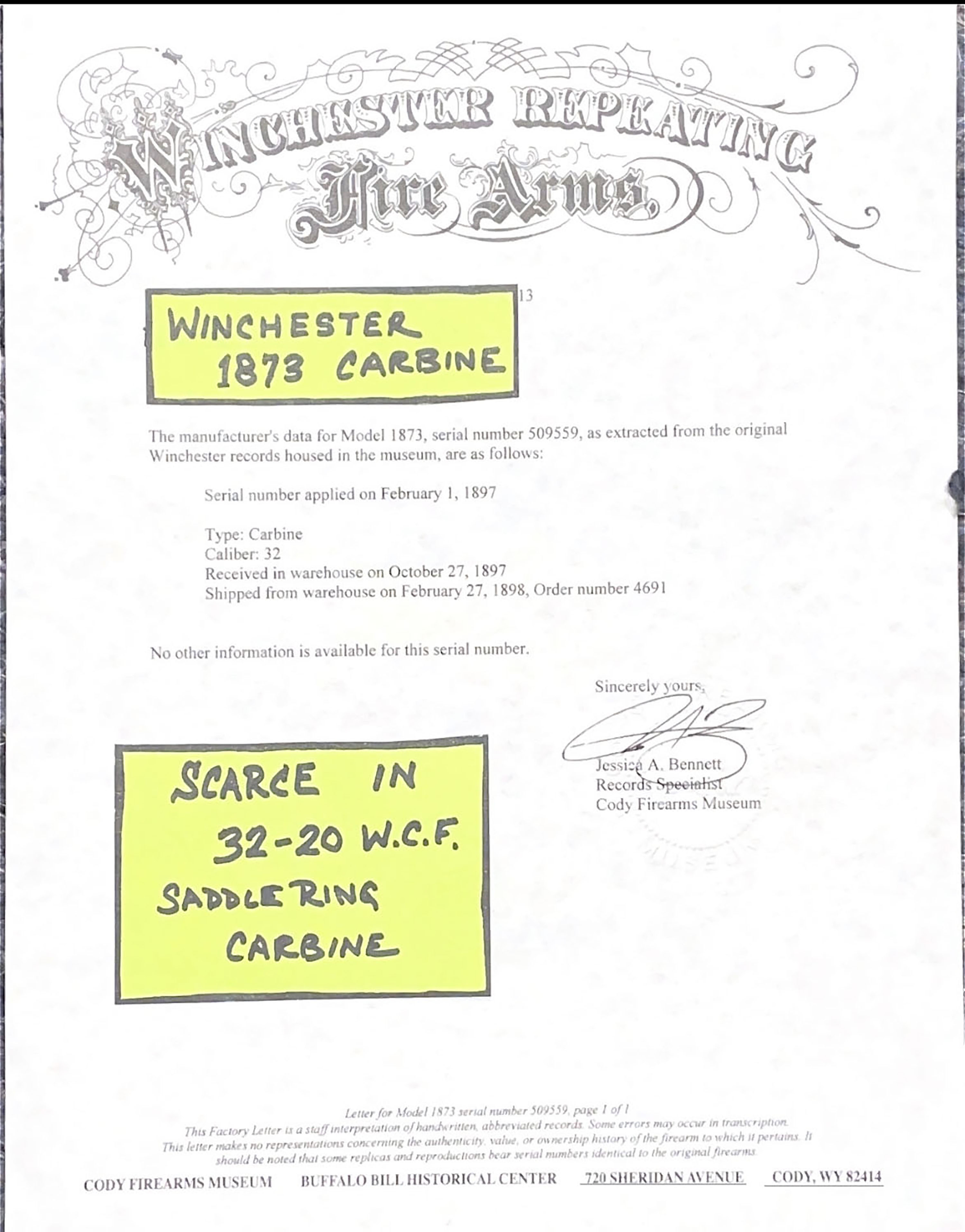 Winchester, Model 1873 Saddle Ring Carbine, 3rd model, .32 WCF Cal., MFG: 1897, SN: 509559B, Lever Action Carbine, 20'' Round barrel, Full mag. The original wood stocks are very good & solid, having been lightly sanded & refinished. The wood has a nice aged or darkened rich chocolate brown appearance. There are a few minor handling marks or rubs to the stock. The forend has a tight 4'' crack & a couple of tight 1'' grain cracks at the tip, along with minor contusions & scrapes. The original metal blue finish on the barrel & mag rates 85%. The receiver has worn gun metal gray, with a thin layer of brown patina present. Fitted with a flip-up ladder rear & box carbine front sights. Bore is excellent. Metal carbine butt. Original saddle ring, with leather lashing. Tight smooth action. Comes with a Cody Factory Records Letter confirming configuration & dates. A very nice & desirable Model 1873 SRC in the rarer 32 WCF.* Antique, No FFL Req. - Value: 5000 to 8000