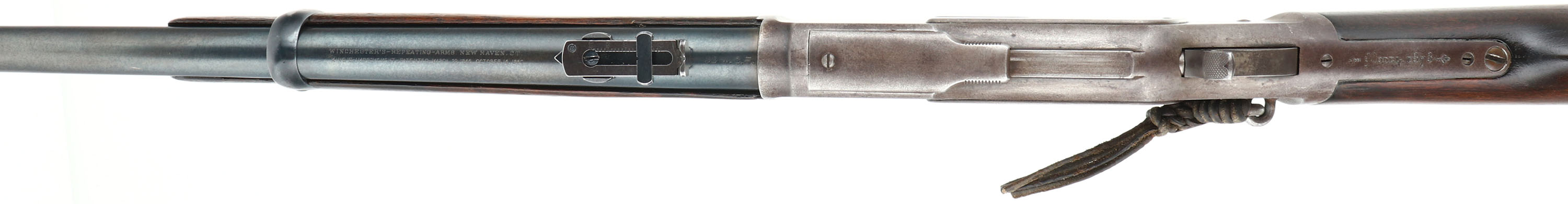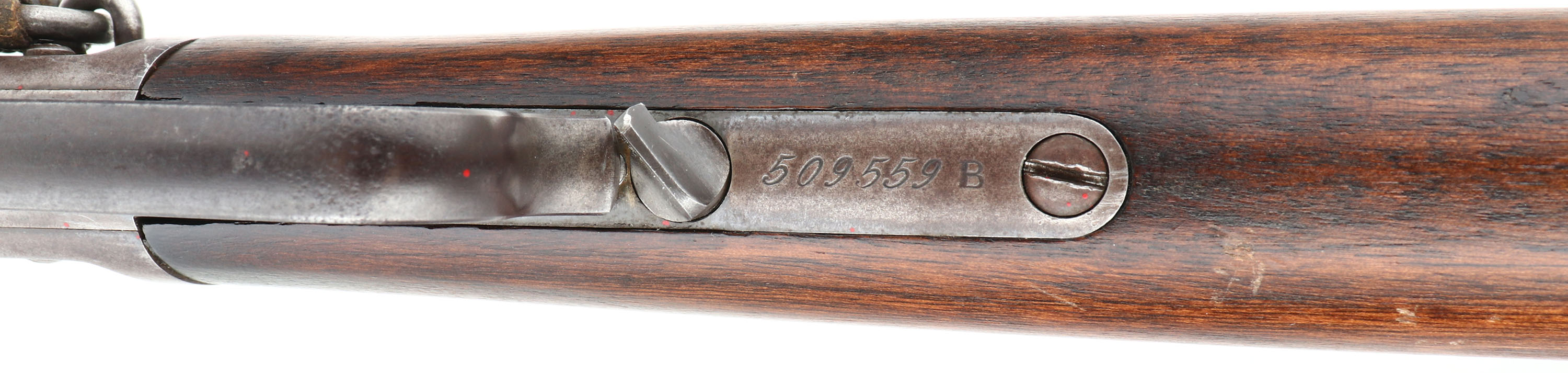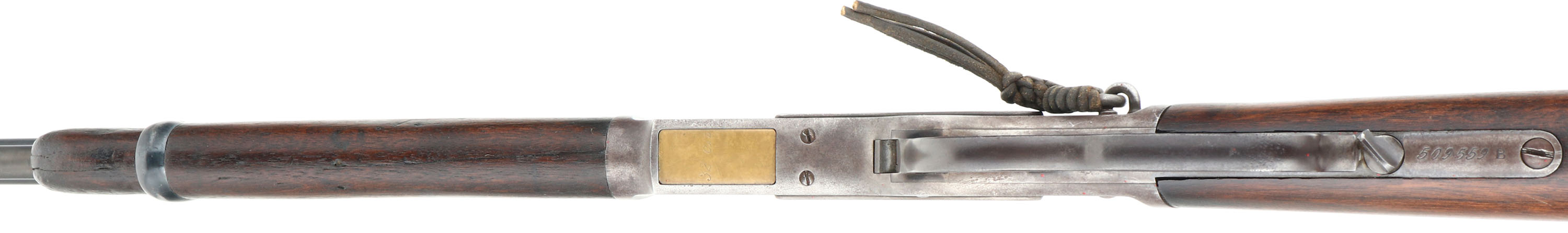 Winchester, Model 1873 Saddle Ring Carbine, 3rd model, .32 WCF Cal., MFG: 1897, SN: 509559B, Lever Action Carbine, 20'' Round barrel, Full mag. The original wood stocks are very good & solid, having been lightly sanded & refinished. The wood has a nice aged or darkened rich chocolate brown appearance. There are a few minor handling marks or rubs to the stock. The forend has a tight 4'' crack & a couple of tight 1'' grain cracks at the tip, along with minor contusions & scrapes. The original metal blue finish on the barrel & mag rates 85%. The receiver has worn gun metal gray, with a thin layer of brown patina present. Fitted with a flip-up ladder rear & box carbine front sights. Bore is excellent. Metal carbine butt. Original saddle ring, with leather lashing. Tight smooth action. Comes with a Cody Factory Records Letter confirming configuration & dates. A very nice & desirable Model 1873 SRC in the rarer 32 WCF.* Antique, No FFL Req. - Value: 5000 to 8000