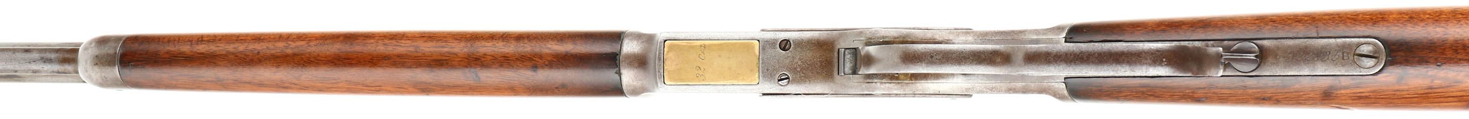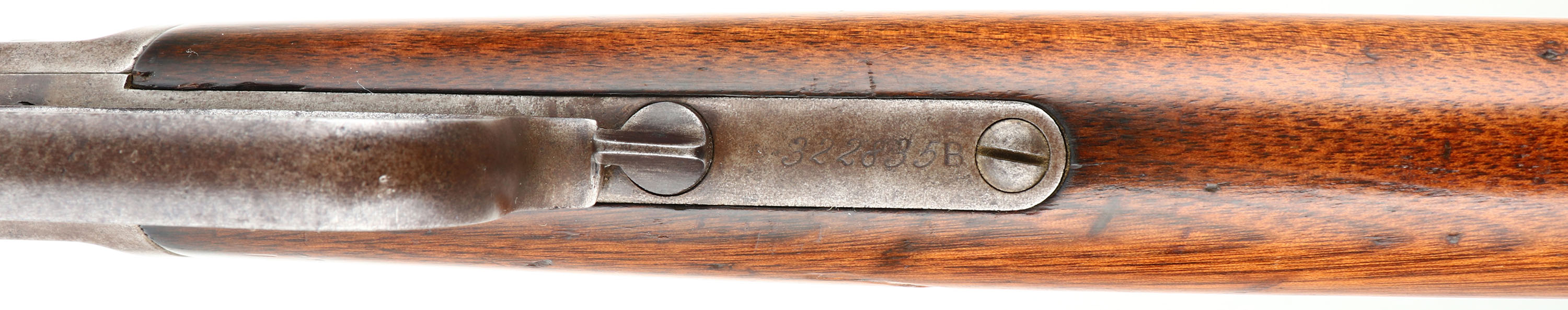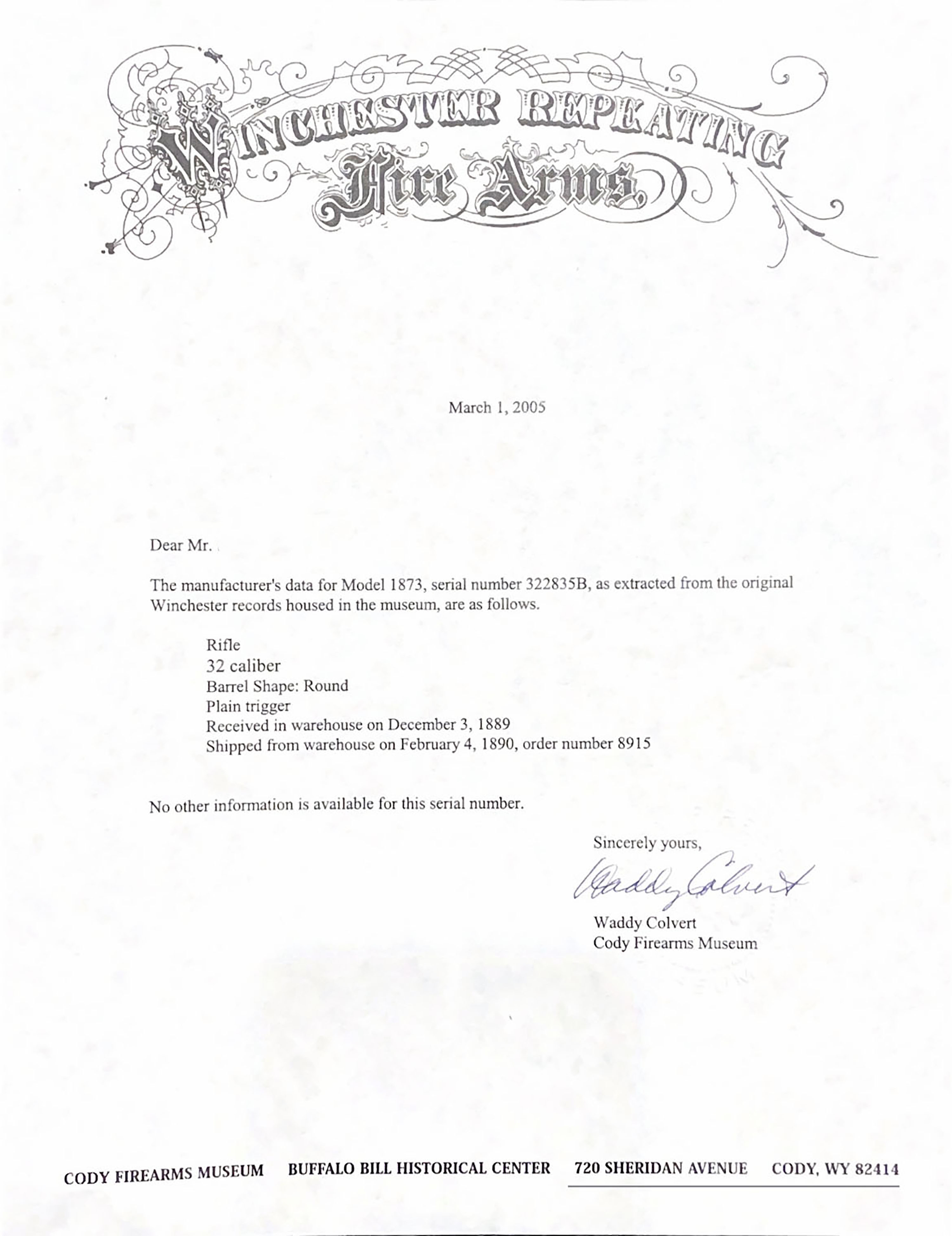 Winchester, Model 1873, 3rd Variation, Marked .32 W.C.F. Cal., MFG: 1889, SN: 322835B, Lever Action Rifle, 24'' Round barrel, Full mag. The original straight grip wood stock & forend are very good, having an added layer of finish over the original finish. There are several small contusions & minor scratches or scrapes. The metal blue finish has worn away to mostly gun metal gray, with a thin layer of brown patina. Bore is fair, appears dark, with pitting & roughness amongst thin rifling. The barrel holds an adjustable rear sight & pinched silver blade front sight. Stock carries a smooth crescent metal buttplate. Dust cover needs to be manually pulled to the rear for the lever to close & the rifle to fire. The rifle needs to visit a gunsmith for adjustment or repair before use, & is therefore selling AS-IS, with no returns. Comes with a Cody Winchester Factory Records Letter, which confirms dates & configuration. A solid & antique 1873, with a nice appearance. Antique, No FFL Req. - Value: 1500 to 3000