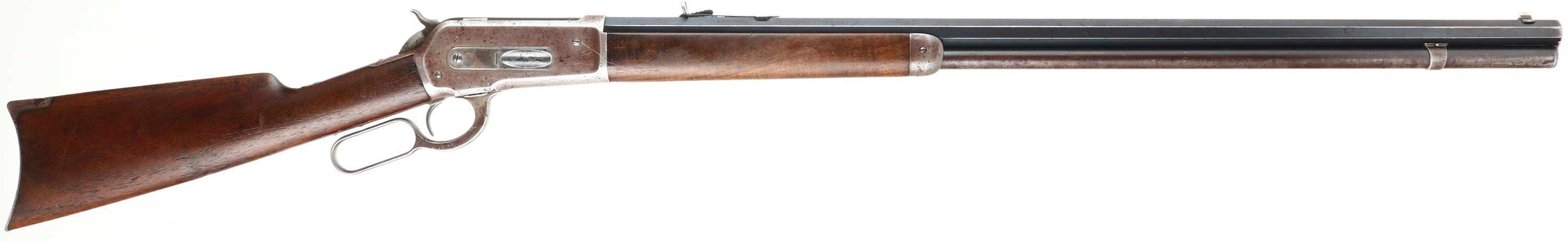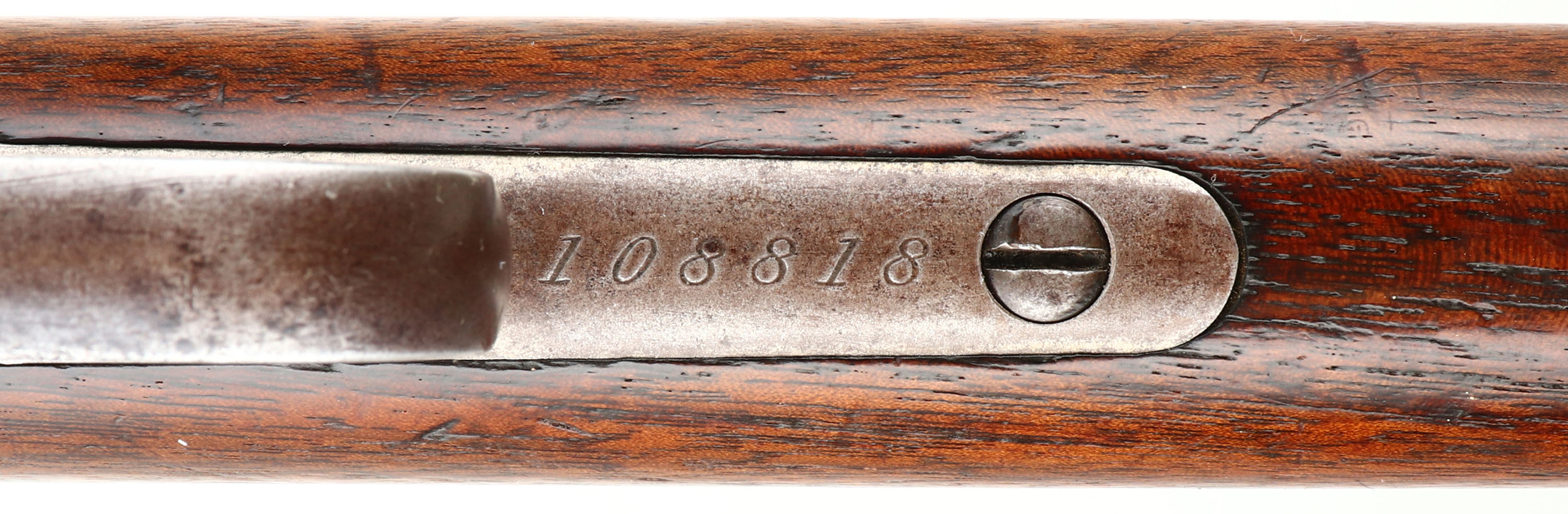 Winchester, Model 1886, 45-90 W.C.F., MFG. 1896, SN: 108818, Lever Action Rifle, SPECIAL ORDER length 30'' Octagon barrel, Full mag. The original straight grip stocks are excellent, retaining the majority of the original finish, with a number of small contusions or scrapes. The original metal blue finish on the barrel rates 85%, with loss due to thinning wear at the edges of flat toning to a brown patina. The mag shows a mix of 40% blue, with the rest a thinning brown patina. The case-hardened receiver, lever & hammer have all faded to a gun metal gray, with a thin & spotty brown patina. The sliding bolt retains a full 90% of its original bright blue. The barrel is fitted with an adjustable rear sight & pinched blade front sight. Bore is very good. Stock carries a crescent metal buttplate. Comes with a Cody Winchester Factory Records Letter, which confirms special order configuration & production dates. An excellent original example of a special order & collectible 1886.* FFL or C&R Req. - Value: 4000 to 6000