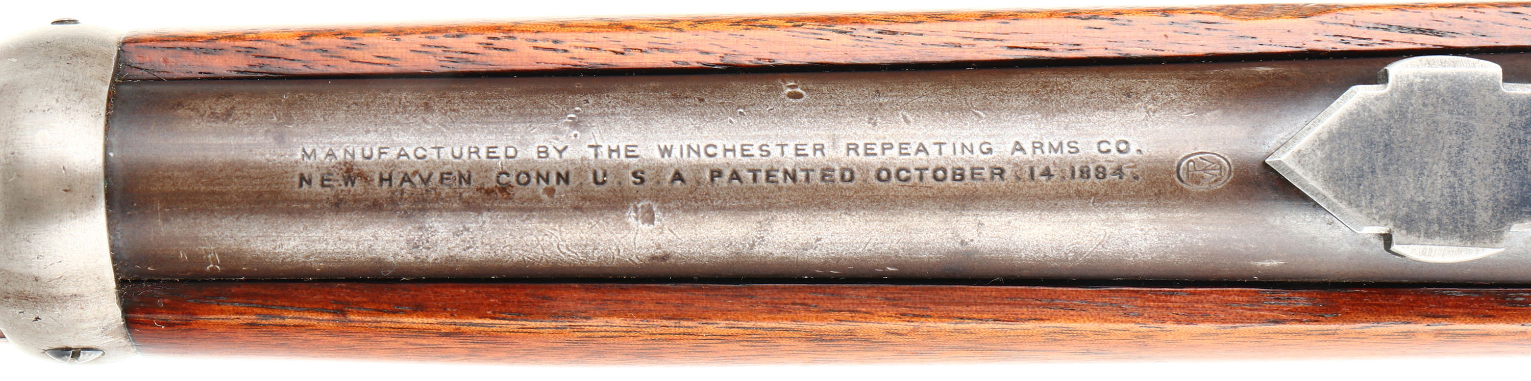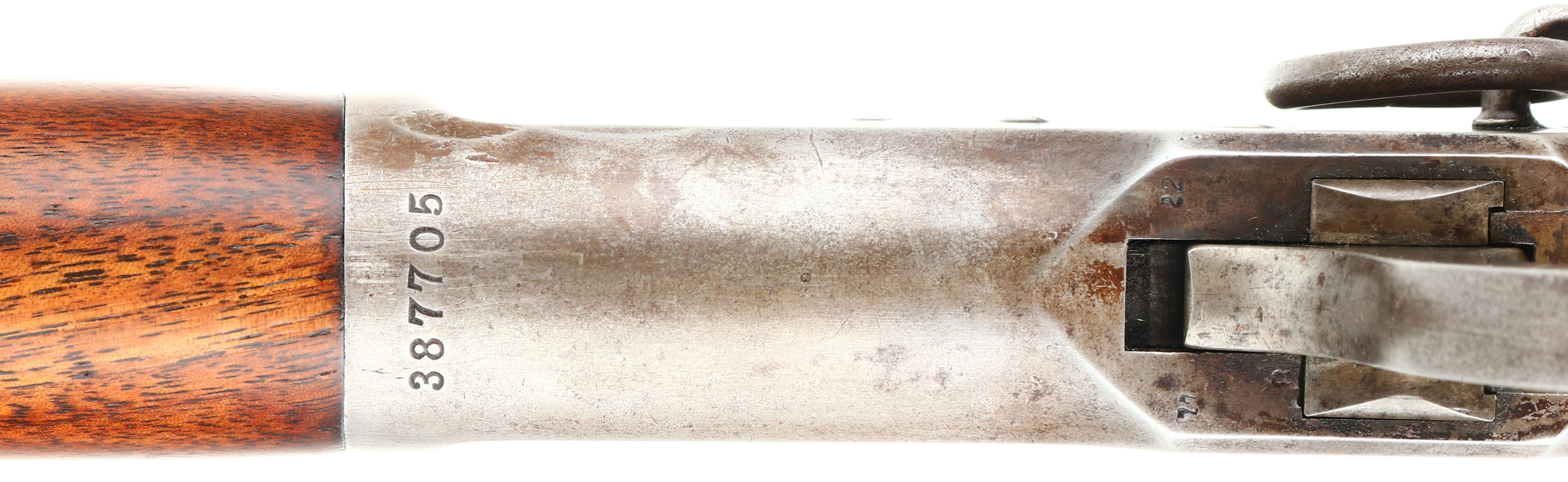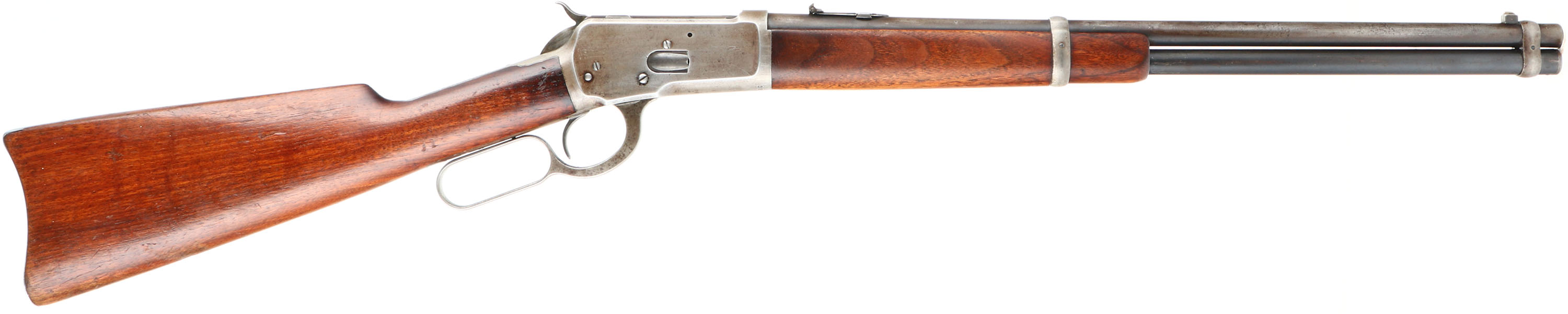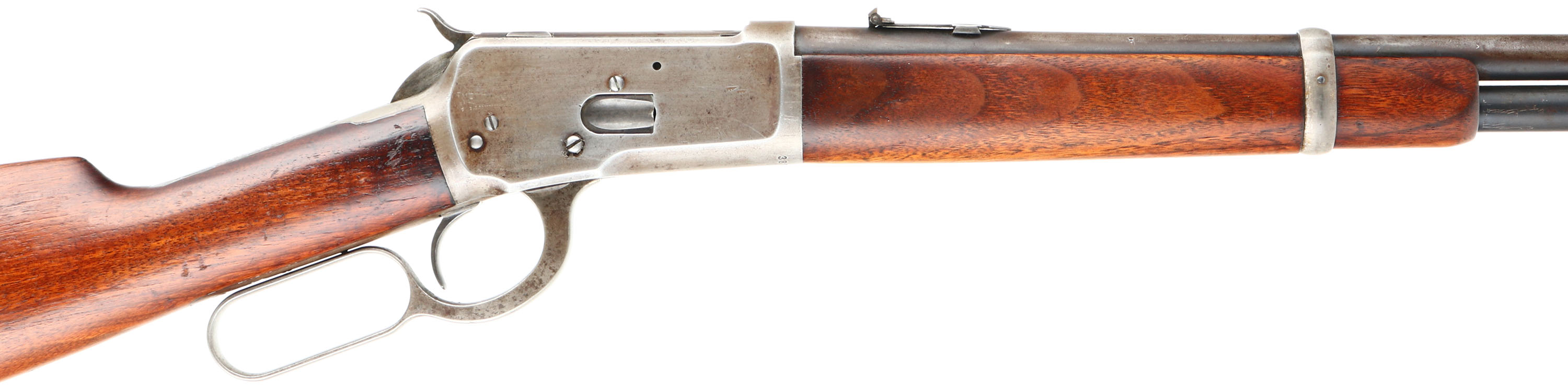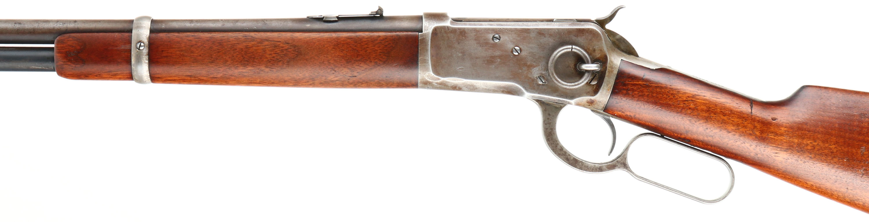Winchester, Model 92 SRC, marked 44 WCF, MFG. 1907, SN: 387705, Lever Action Rifle, 20'' Round Barrel, Full mag. The original wood stocks are excellent & solid. They carry the original finish, with some minor handling blemishes, contusions or scuffs & a couple of larger contusions or scrapes on the belly of the stock. The original meal blue finish remains at 70% on the mag with the rest thinned to a brown patina. The barrel has mostly toned to a thin brown patina, remains of blue in more protected areas. The receiver has worn mostly gun meatal gray, with a thin spotty brown patina. Bore is very good, but with spotty areas of roughness amongst strong rifling. Fitted with a 50', 100', 200' folding leaf rear sight & carbine box front sight. Metal carbine buttplate. Original staple saddle ring. Tight action. A fantastic original condition little carbine & very collectible in the desired 44 caliber. FFL or C&R Req. - Value: 2000 to 4000