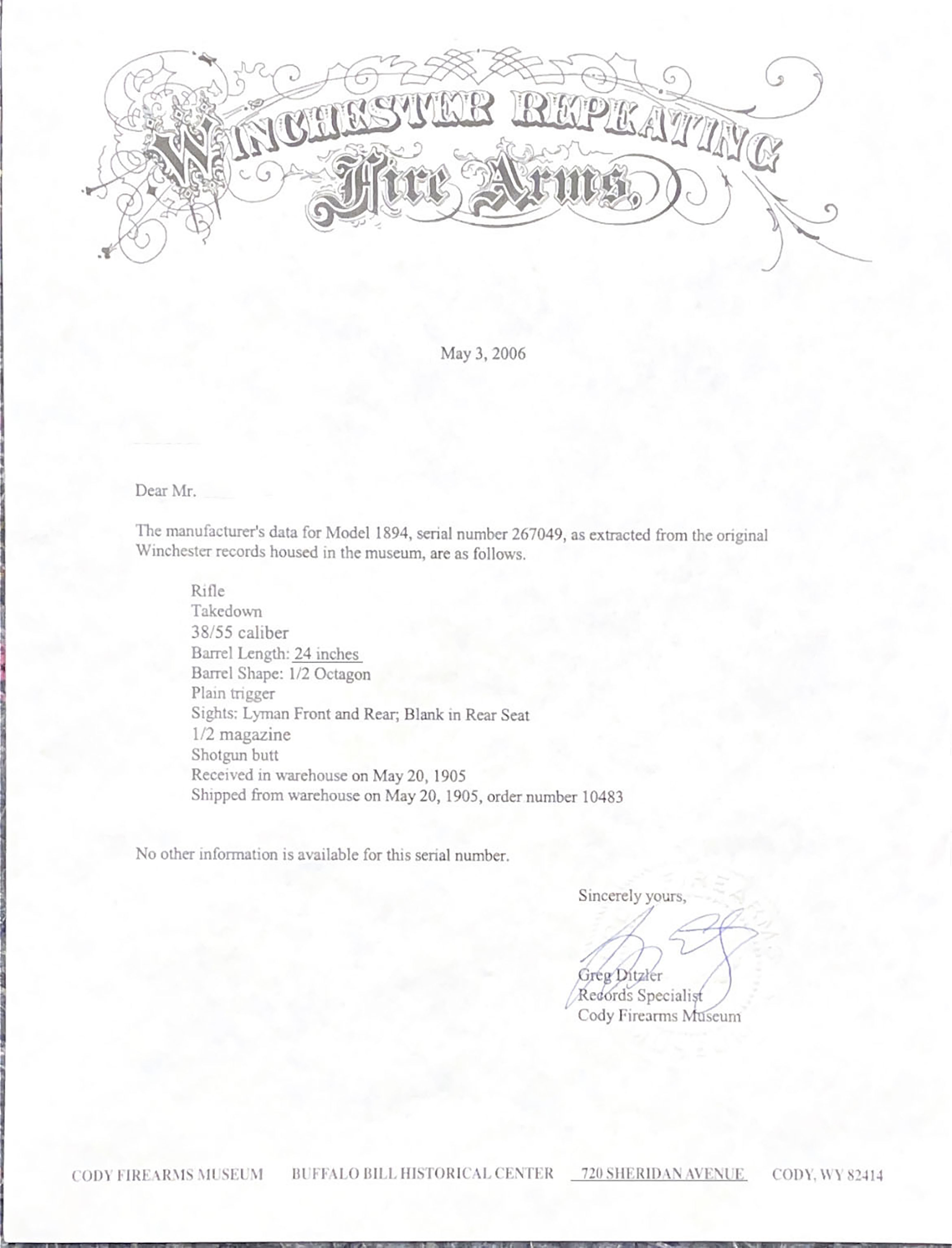 Winchester, Model 1894 TAKE-DOWN, CAL: 38-55, MFG: 1905, SN: 267049, Lever Action Rifle, 24 1/4'' 1/2 Octagon 1/2 Round Barrel. 2/3rds Mag. The factory straight grip wood stocks are very good & solid. They carry a thinning original finish, with numerous small handling marks, scrapes & contusions, mostly located on the stock. The original metal blue finish on the barrel & mag rates 95%, 60% on the receiver, with most of the loss being splotchy loss on the right side of receiver & on belly. Blue remains on bolt, with some on the buttplate & forend cap. Case-hardened lever & hammer display faded case-colors. Bore is excellent. The receiver carries a Lyman flip-up tang sight, while the barrel holds a blank filled rear dovetail & Lyman front blade sight. Buttstock carries a metal widows peak shotgun buttplate. Comes with a Cody Winchester Factory Records Letter, which confirms dates & configuration. This is a sharp looking original rifle, with special features & sights.* FFL or C&R Req. - Value: 3500 to 5500