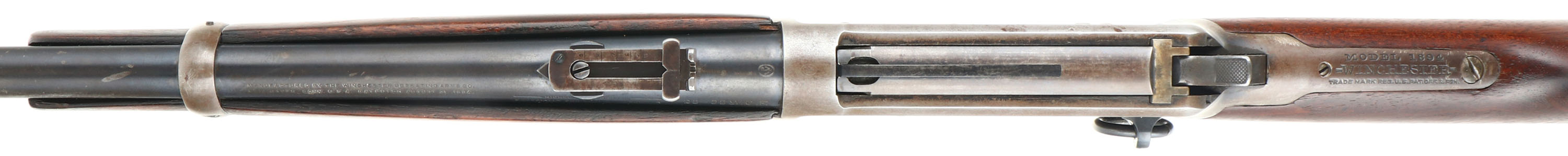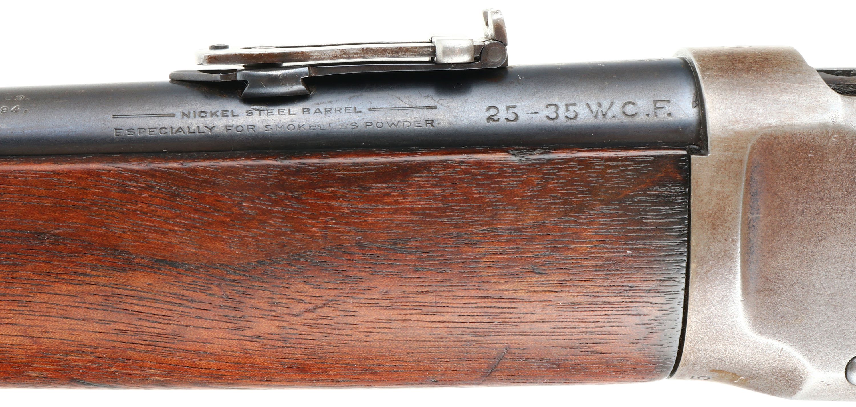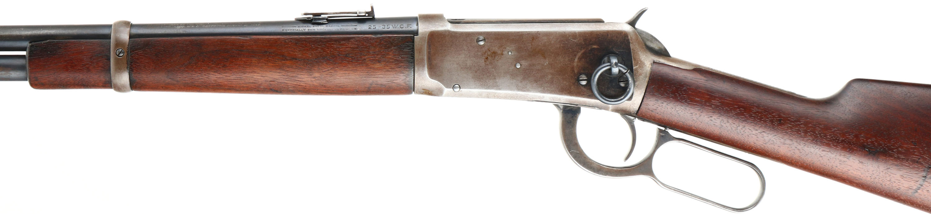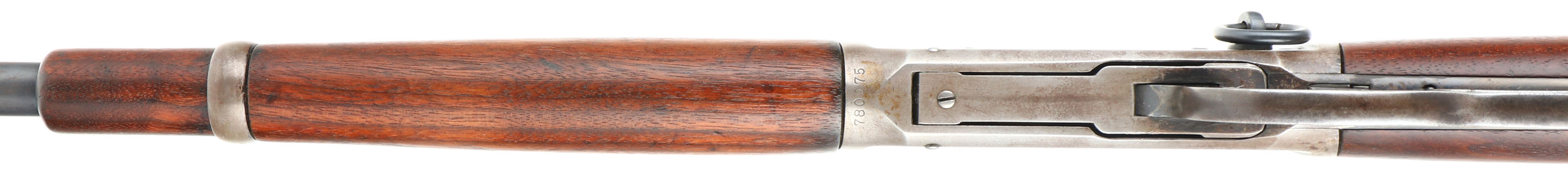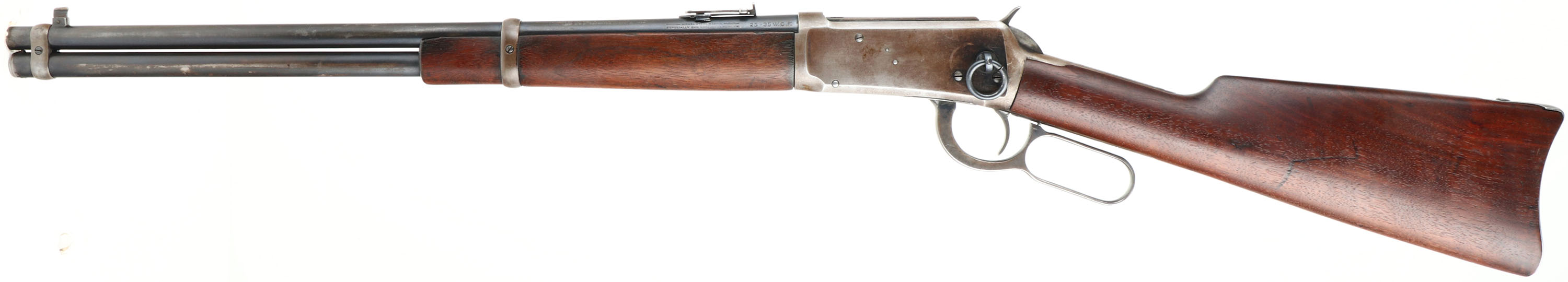 Winchester, Model 94 Carbine, CAL: 25-35 WCF, MFG: 1915, SN: 780075, Lever Action Carbine, 20'' Round barrel, Full mag. The straight grip wood stock & forend are excellent, displaying small surface scrapes, minor contusions & scratches. The metal blue finish rates 80% on barrel, 70 on mag, while the receiver has worn mostly gun metal gray, with a thin layer of brown patina. Bore is very good, with strong rifling. Fitted with a carbine ladder rear sight & carbine box front sight. Buttstock carries a carbine metal buttplate. FFL or C&R Req. - Value: 2000 to 3000
