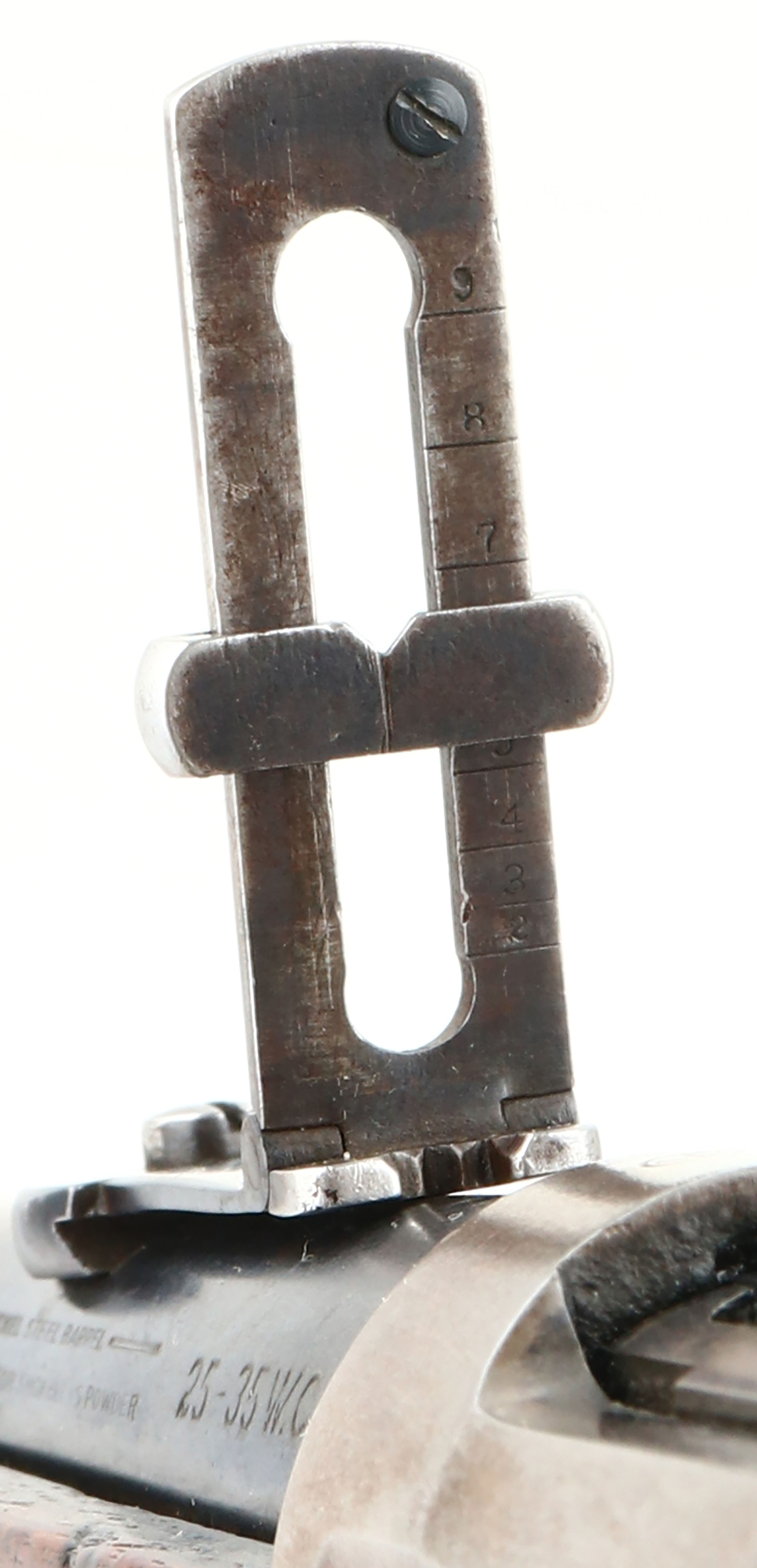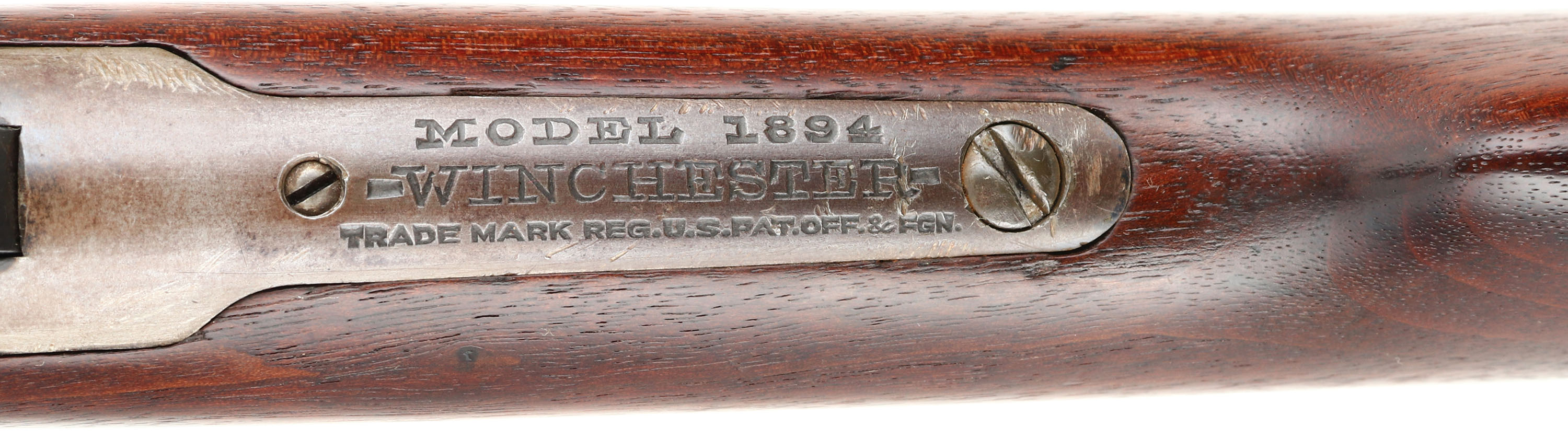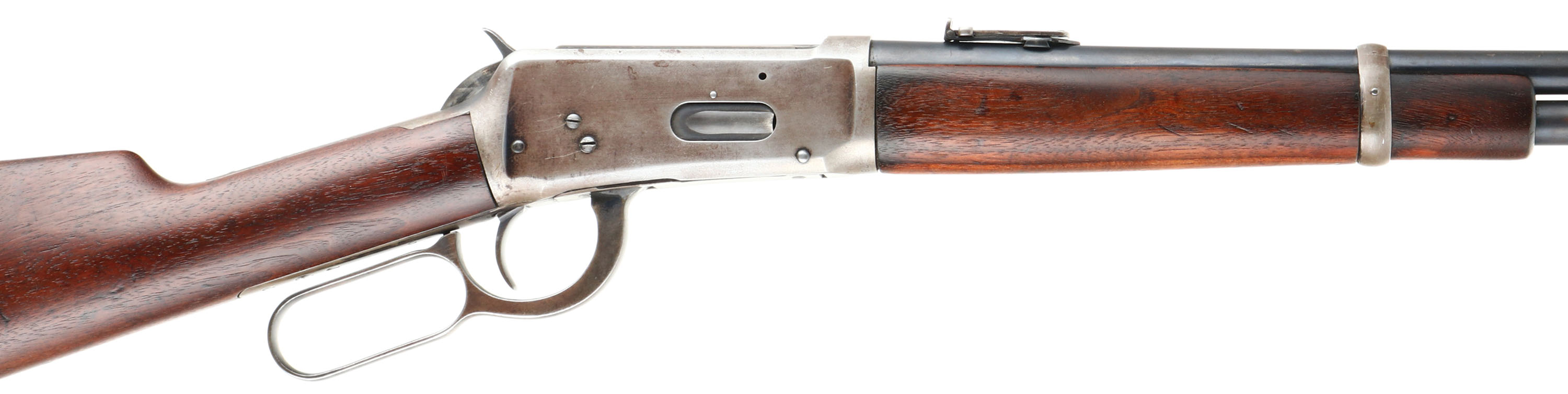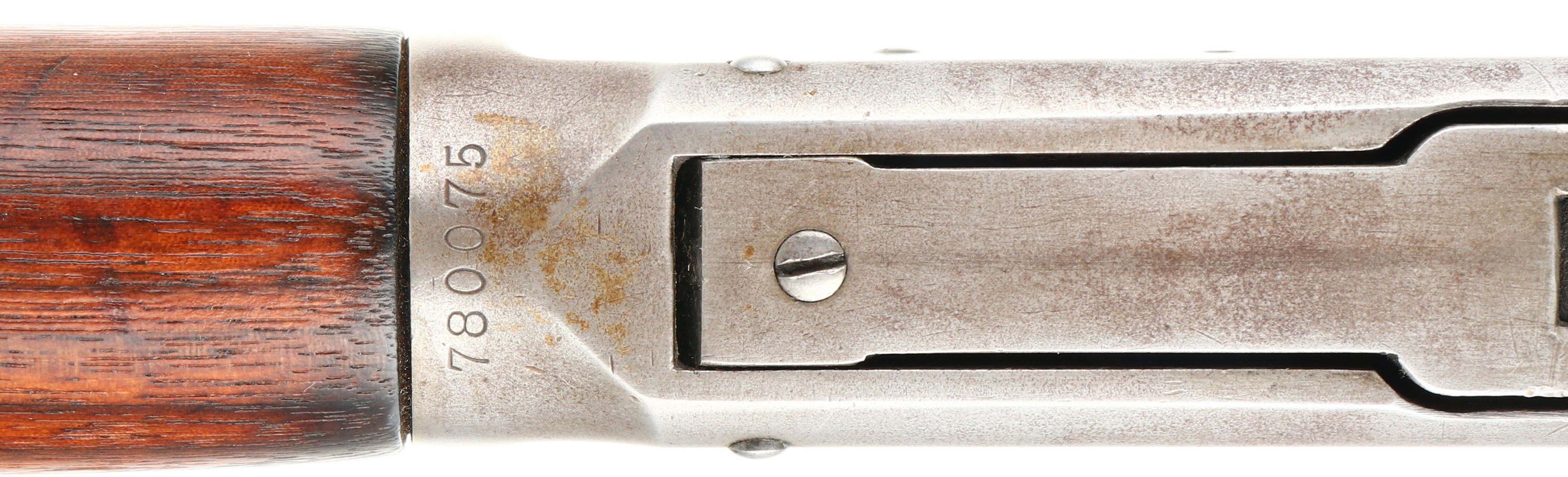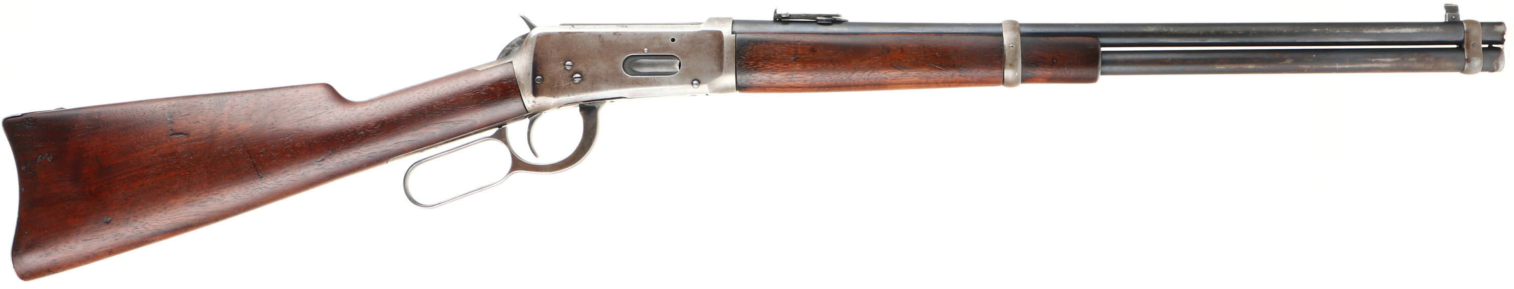 Winchester, Model 94 Carbine, CAL: 25-35 WCF, MFG: 1915, SN: 780075, Lever Action Carbine, 20'' Round barrel, Full mag. The straight grip wood stock & forend are excellent, displaying small surface scrapes, minor contusions & scratches. The metal blue finish rates 80% on barrel, 70 on mag, while the receiver has worn mostly gun metal gray, with a thin layer of brown patina. Bore is very good, with strong rifling. Fitted with a carbine ladder rear sight & carbine box front sight. Buttstock carries a carbine metal buttplate. FFL or C&R Req. - Value: 2000 to 3000