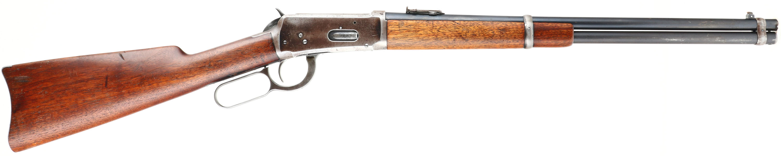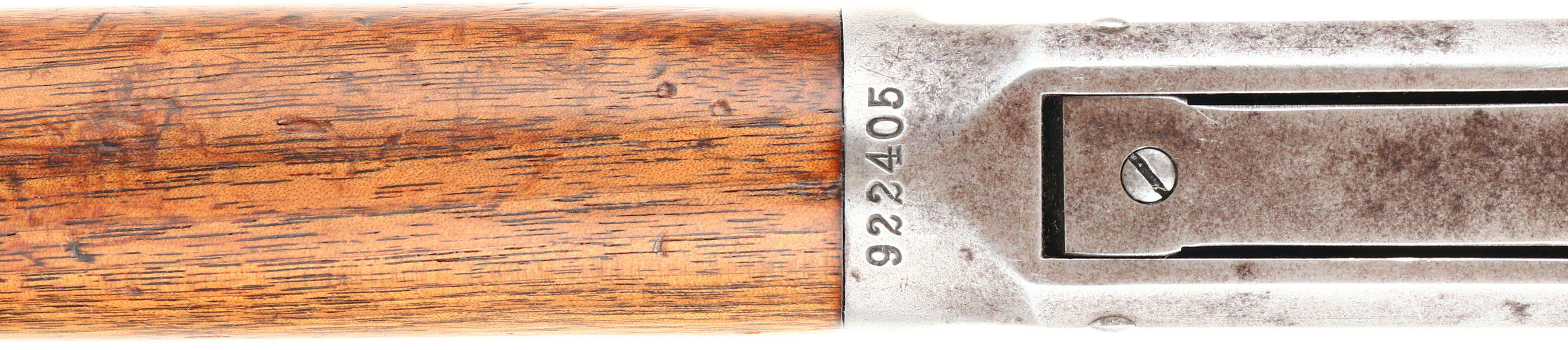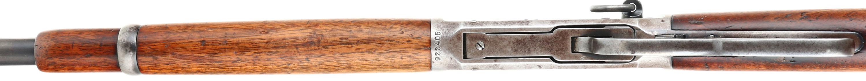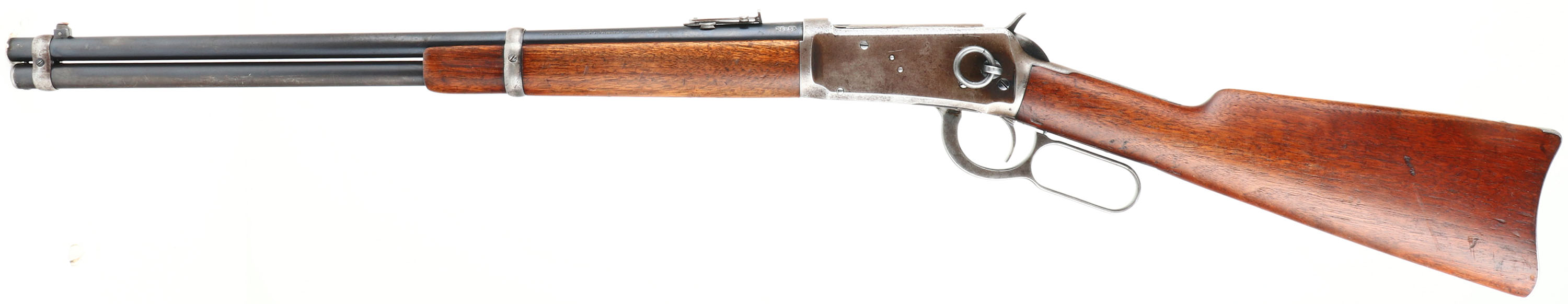 Winchester, Model 1894 SRC, CAL: 38-55, MFG: 1920, SN: 922405, Lever Action Rifle, 20'' Round barrel. Full mag. The straight grip wood stock & forend are excellent, with several minor surface scrapes & small contusions to the original finish. The metal blue finish on the barrel rates 90%, 85% on the mag tube. The receiver has mostly worn or faded to a gun metal gray, with a thin brown patina & some original blue remaining in more protected areas. Bore is excellent. The barrel holds a flip-up rear ladder sight & carbine block blade front sight. Buttstock carries a smooth carbine metal buttplate. Original saddle ring. Smooth tight action. A very nice all original SRC. FFL or C&R Req. - Value: 2000 to 3000