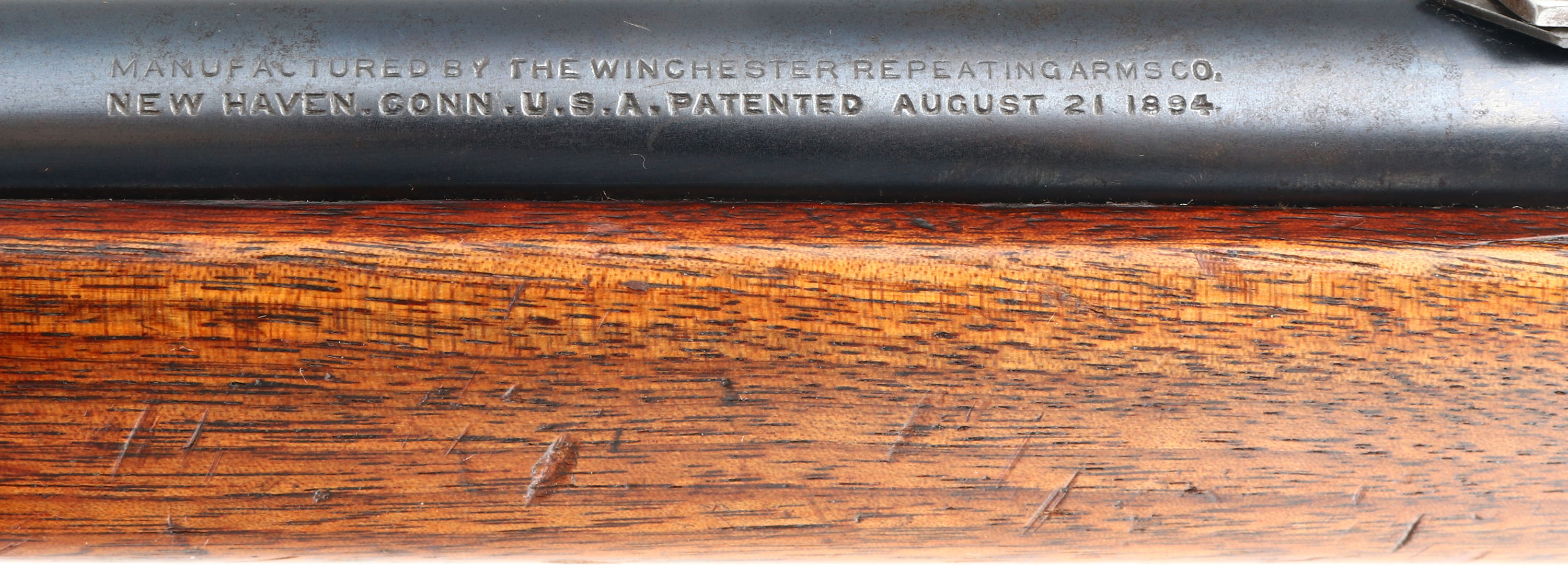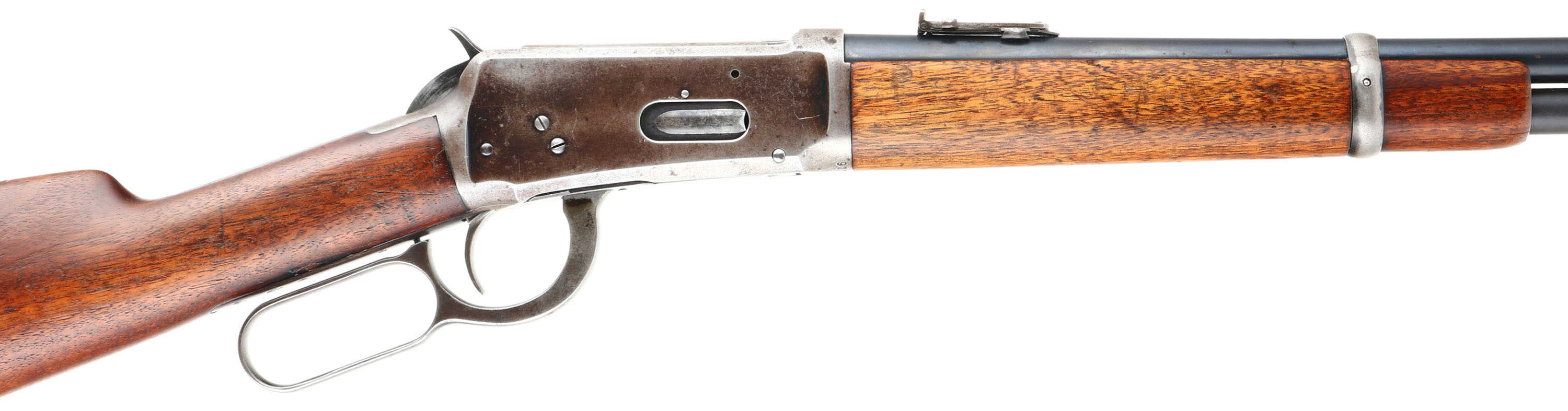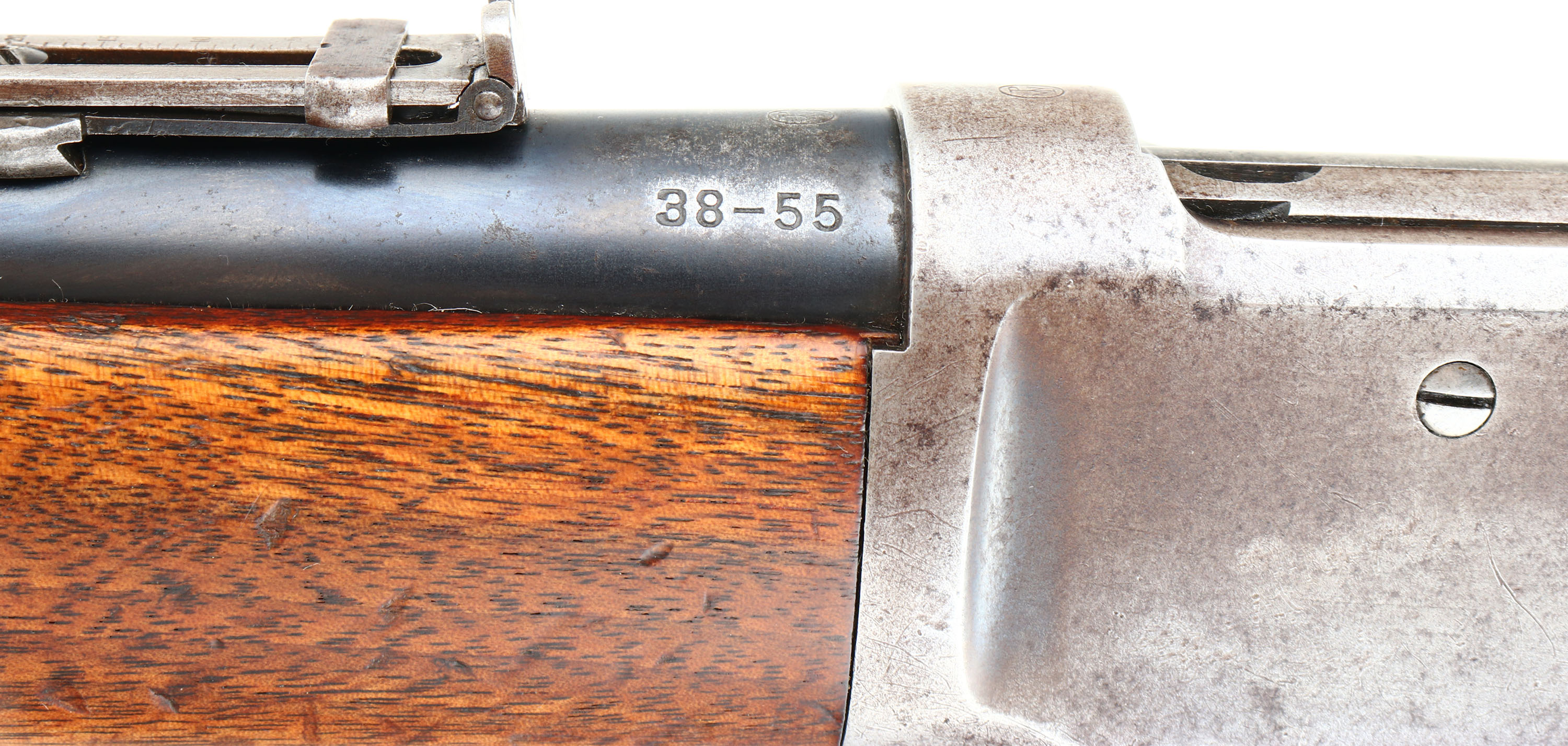 Winchester, Model 1894 SRC, CAL: 38-55, MFG: 1920, SN: 922405, Lever Action Rifle, 20'' Round barrel. Full mag. The straight grip wood stock & forend are excellent, with several minor surface scrapes & small contusions to the original finish. The metal blue finish on the barrel rates 90%, 85% on the mag tube. The receiver has mostly worn or faded to a gun metal gray, with a thin brown patina & some original blue remaining in more protected areas. Bore is excellent. The barrel holds a flip-up rear ladder sight & carbine block blade front sight. Buttstock carries a smooth carbine metal buttplate. Original saddle ring. Smooth tight action. A very nice all original SRC. FFL or C&R Req. - Value: 2000 to 3000