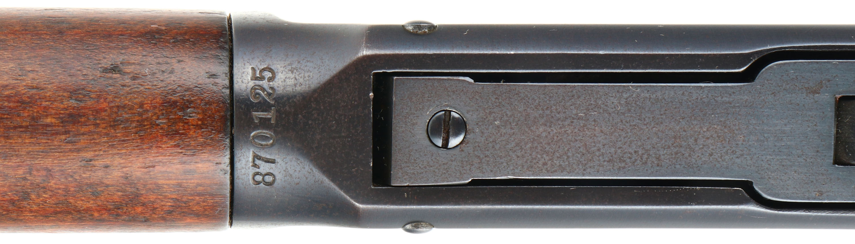 Winchester, Model 94 Saddle Ring Carbine, CAL: 30 WCF, MFG: 1917, SN: 870125, Lever Action Carbine, 20'' Round barrel, Full mag. The straight grip wood stocks are excellent & solid, however the stock appears to be a later Winchester 94 stock. There are missing slivers on both sides at the upper shoulder where the wrist meets the receiver. The stock has very few light handling marks to the original finish. The original forend has minor scratches, scrapes, & contusions to the original finish. The restored metal blue finish rates 98%, with the barrel having a bit of a plum tone. Bore is excellent. The barrel holds an adjustable Marbles buckhorn rear sight & carbine box front sight. Stock carries a checkered metal shotgun buttplate. Original saddle ring. Smooth tight action. Has a very nice overall appearance & should be a great shooter. FFL or C&R Req. - Value: 600 to 1200