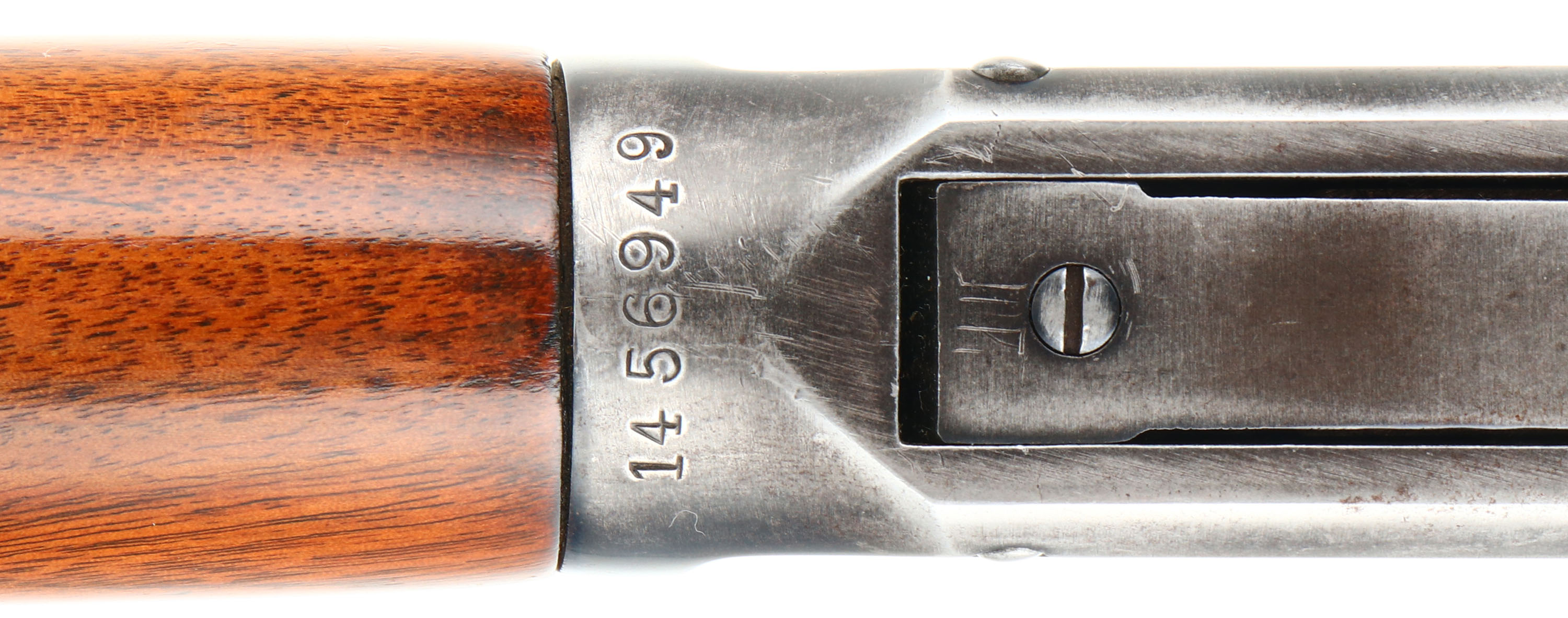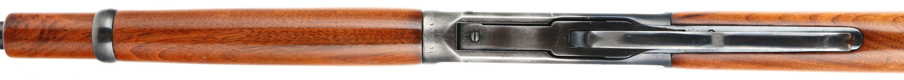 Winchester, Model 94 Carbine, CAL: 32 Win. SPL., MFG: 1947, SN: 1456949, Lever Action Carbine, 20'' Round barrel, Full mag. The straight grip wood stocks are excellent & solid, as lightly sanded & nicely refinished. There is a small corner chip at the top right shoulder, a small chip at the toe & a 1 1/2'' grain crack at buttend on right side. There are very few other handling marks or light scratches on the refinish. The original metal blue finish rates 95% on barrel & mag, 85% on receiver. Bore is excellent. The barrel holds an adjustable rear sight & a hooded ramp front sight. Stock carries a checkered metal shotgun buttplate. Smooth tight action. Carbine has a very nice overall appearance. FFL or C&R Req. - Value: 500 to 1000