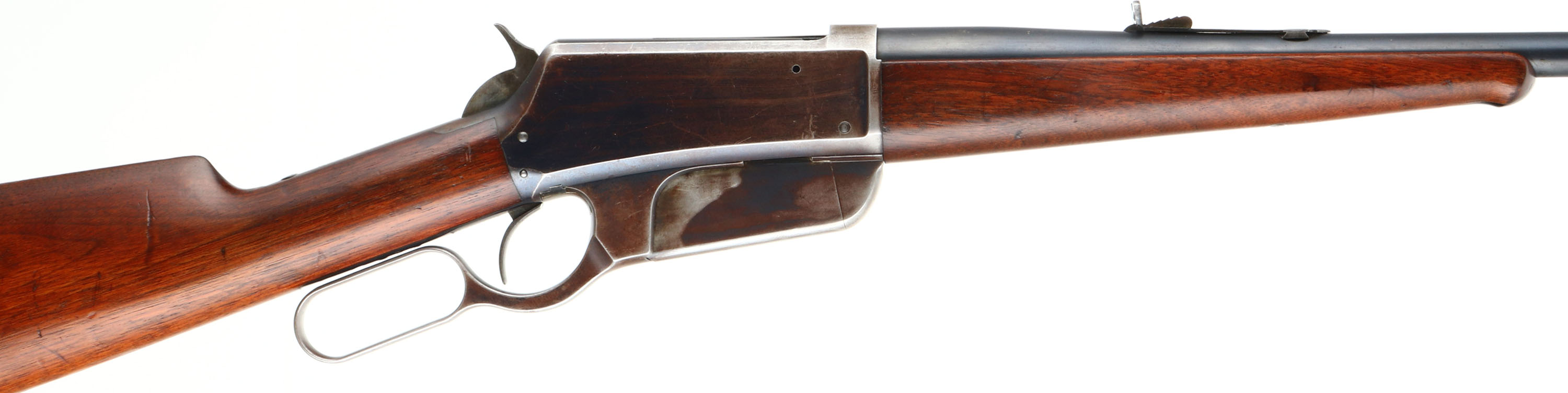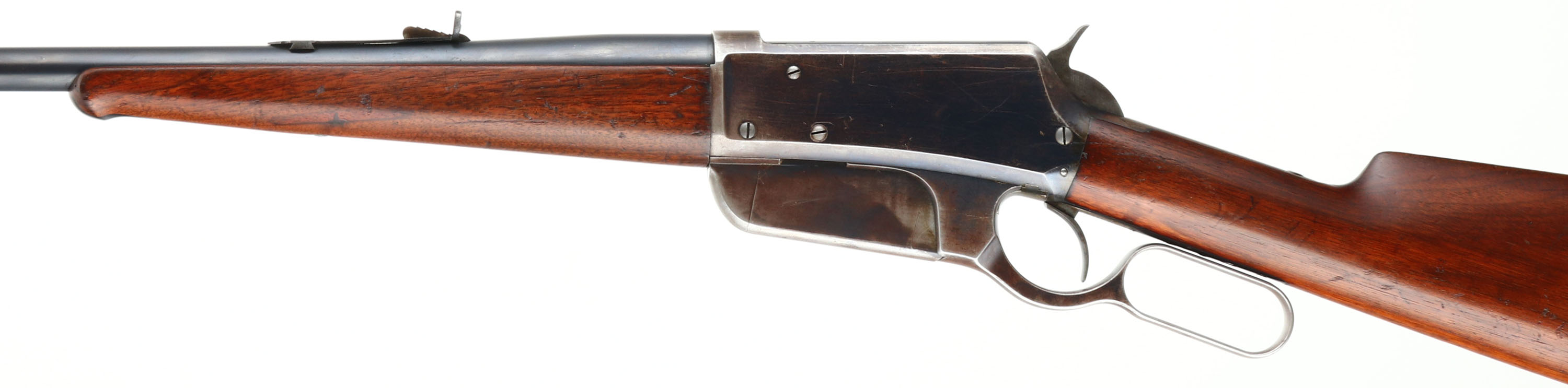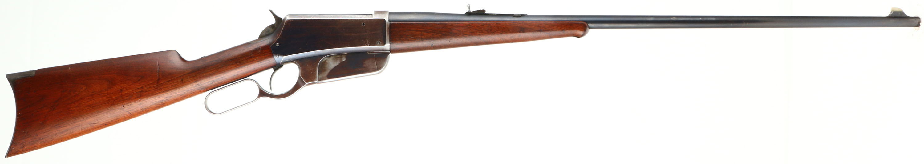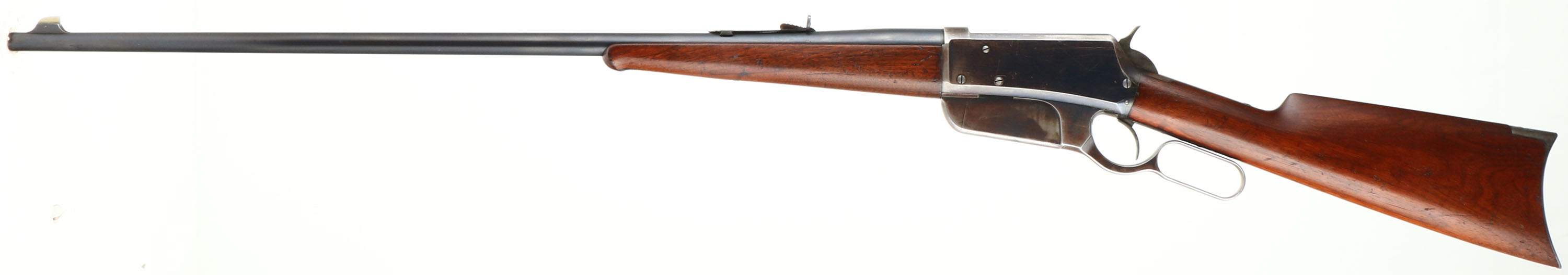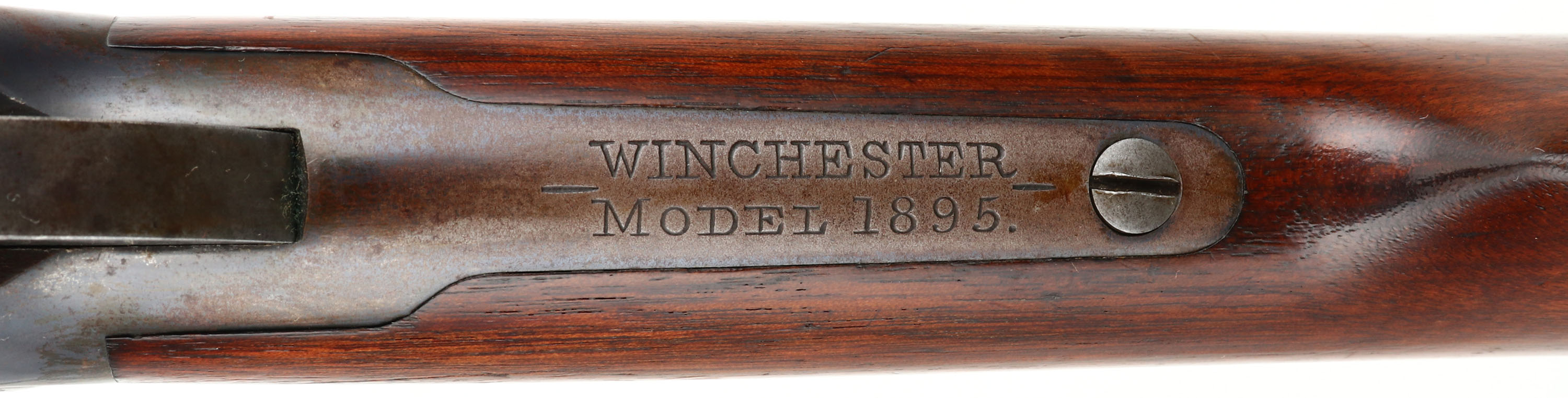 RARE, Winchester Model 1895 Flat-side, CAL: marked 30 U.S., MFG: 1897, SN: 4310, Lever Action Rifle, 28'' barrel. This is one of the 5,000 rare early production flat side 1895 rifles produced from 1895-97. The factory straight grip & ebony tipped wood stocks on this example are excellent. They display the original factory finish with minor handling marks, scrapes & contusions which don't detract much from the overall condition. The metal blue finish rates 90% on the barrel, 40% on the receiver. Bore is excellent. Barrel fitted with an adjustable rear sight & silver blade front sight. Buttstock carries a crescent metal buttplate. The original rifle is very collectible as a rare 1895 flatside.* Antique, No FFL Req. - Value: 6000 to 8000