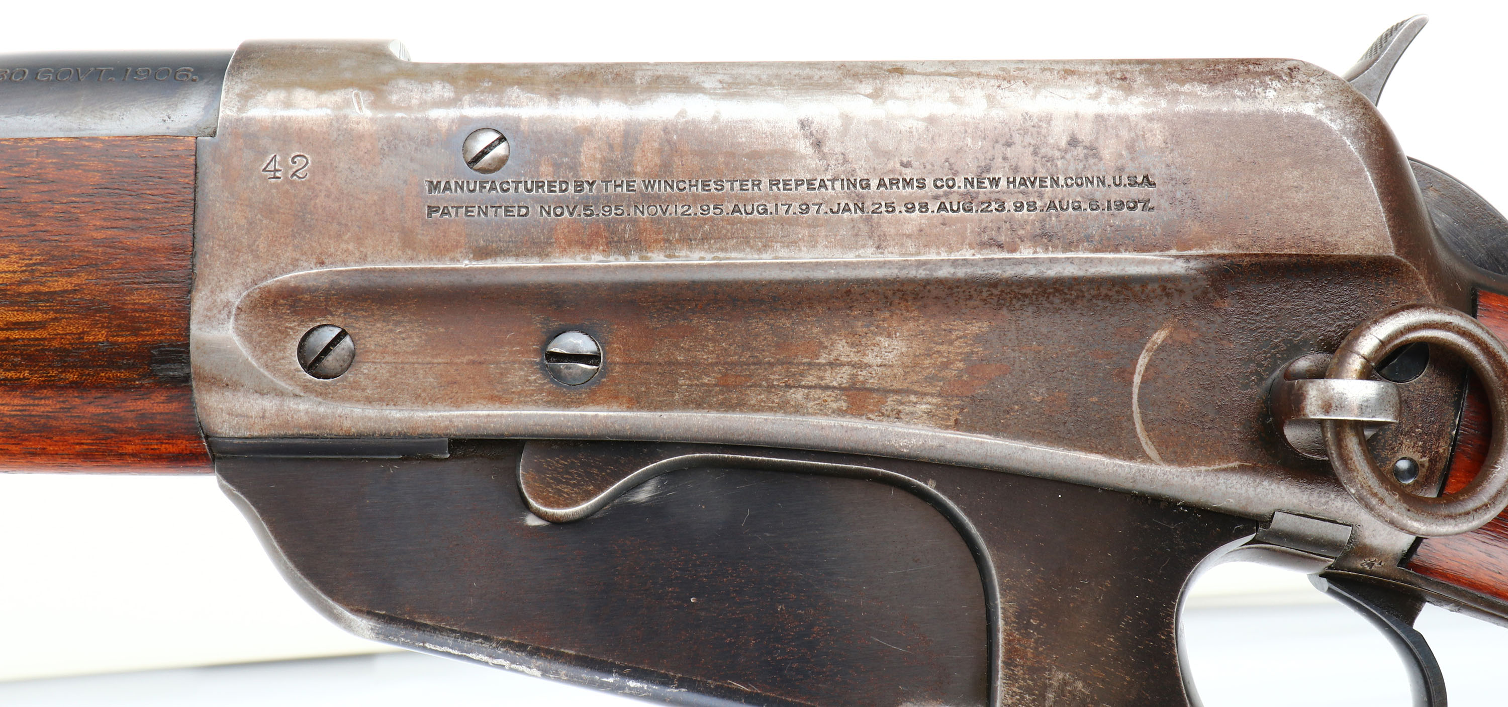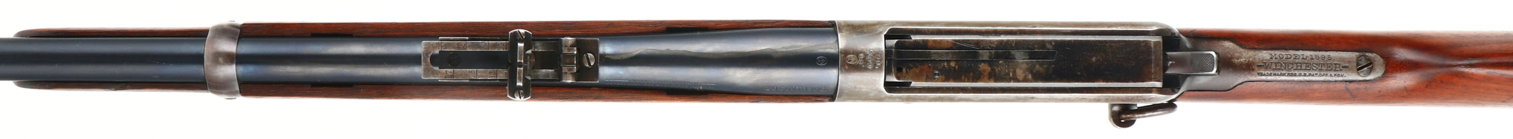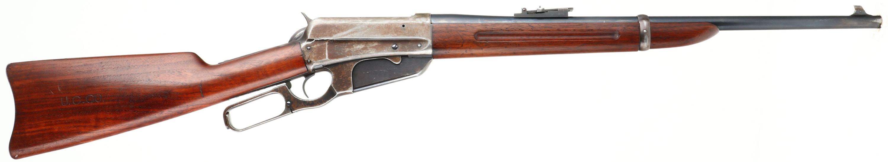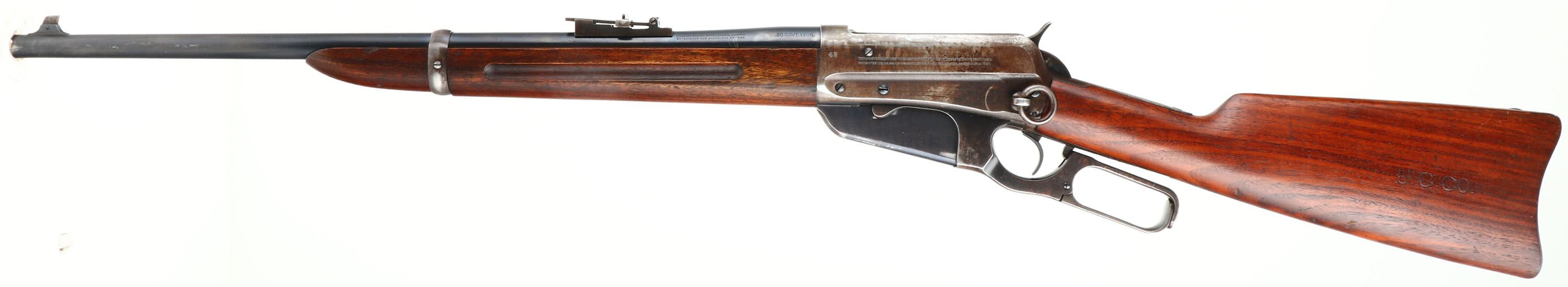 RARE Winchester, Model 1895 SRC, CAL: .30 GOV'T.1906., MFG: 1915, SN: 191724 , Lever Action Rifle, 21 3/4'' Tapered round barrel. This rifle is stamped on both sides of the stock with ''U.C.CO.'' & the left side of the receiver is stamped with the rack # ''42''. Other auctions have attributed these rifles to be from the United Copper Company. The original wood stock & forearm are excellent. They carry all the original finish, with a few minor scrapes or contusions. The original metal blue finish on the barrel rates 95%, 80% on the mag box, while the receiver has worn mostly gun metal gray, with a thinning brown patina & some remains of blue in protected areas. Bore is excellent & bright. The barrel holds a military style rear ladder sight & pinned blade front sight. Stock carries a sliding trapdoor metal carbine buttplate. It carries the desirable saddle ring. This is an excellent original condition rifle, with an unknown history. FFL or C&R Req. - Value: 2000 to 3500