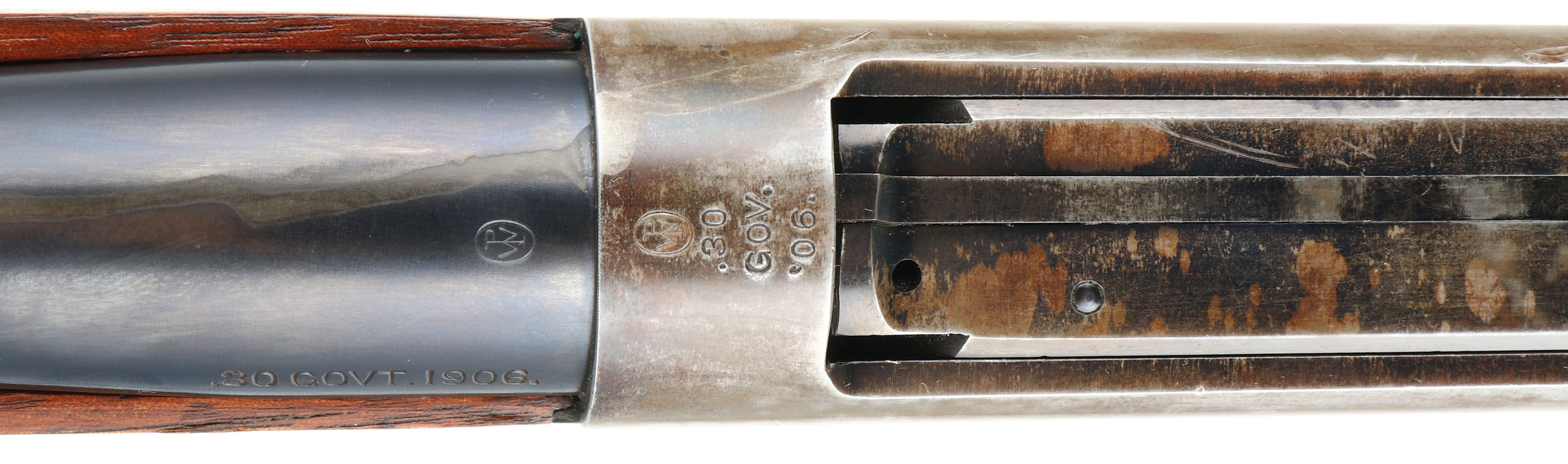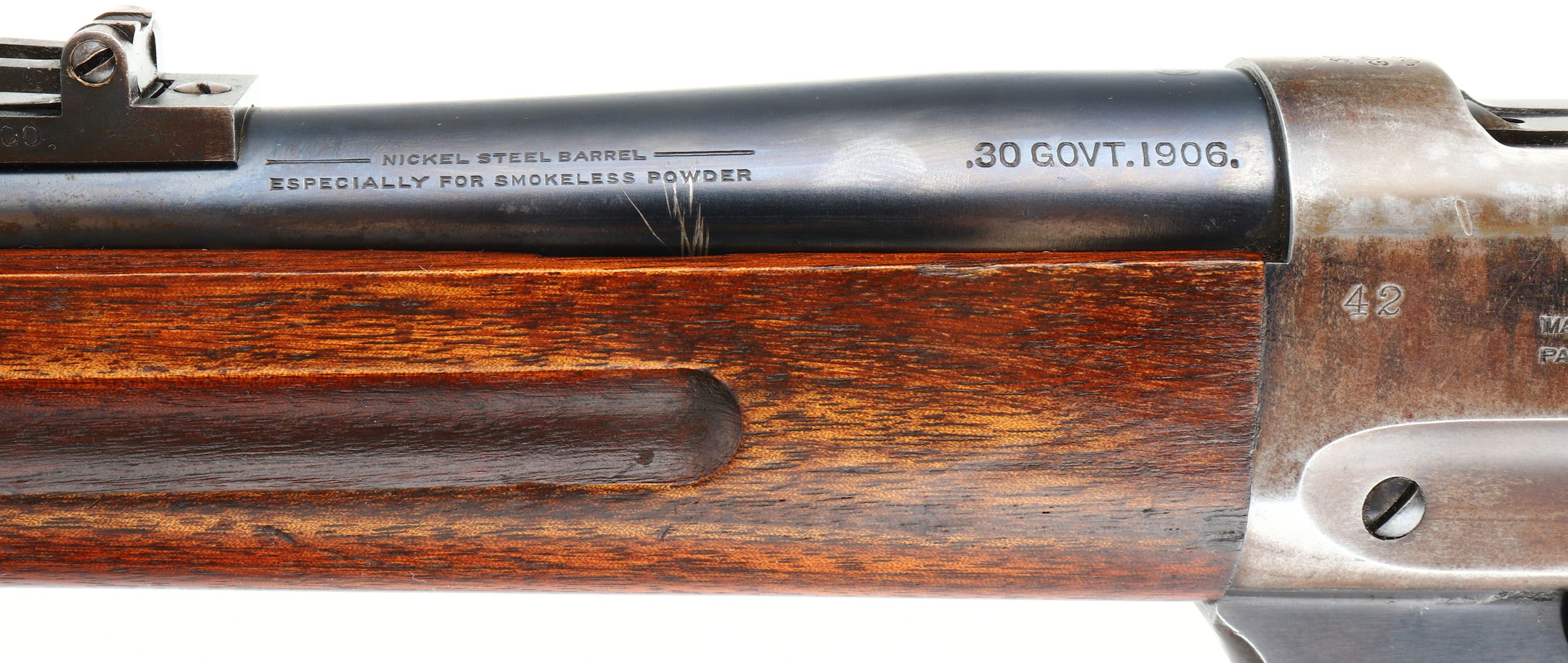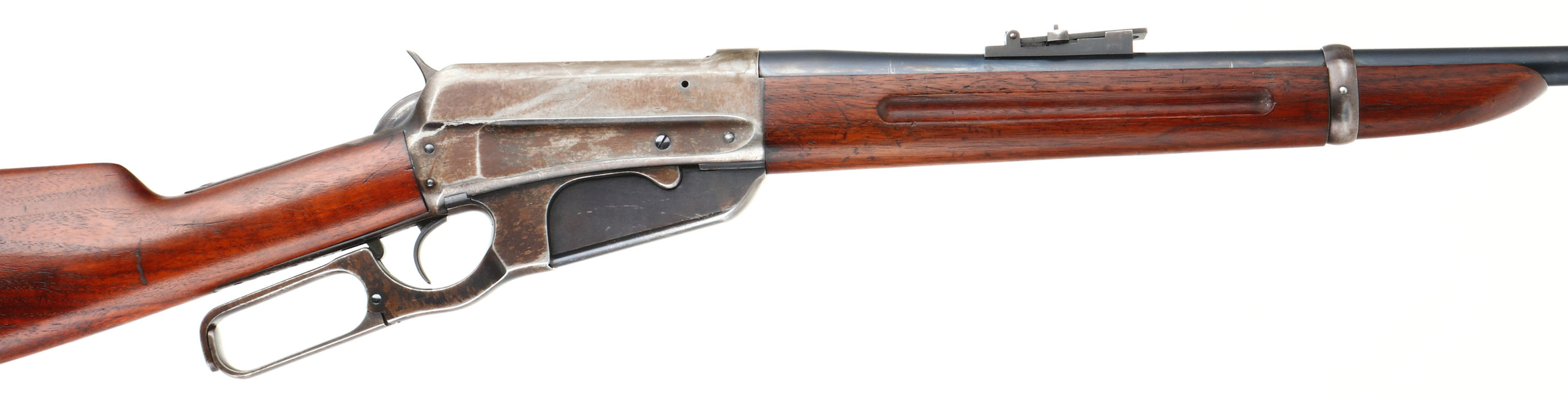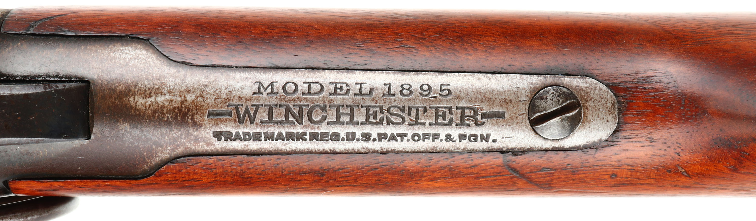 RARE Winchester, Model 1895 SRC, CAL: .30 GOV'T.1906., MFG: 1915, SN: 191724 , Lever Action Rifle, 21 3/4'' Tapered round barrel. This rifle is stamped on both sides of the stock with ''U.C.CO.'' & the left side of the receiver is stamped with the rack # ''42''. Other auctions have attributed these rifles to be from the United Copper Company. The original wood stock & forearm are excellent. They carry all the original finish, with a few minor scrapes or contusions. The original metal blue finish on the barrel rates 95%, 80% on the mag box, while the receiver has worn mostly gun metal gray, with a thinning brown patina & some remains of blue in protected areas. Bore is excellent & bright. The barrel holds a military style rear ladder sight & pinned blade front sight. Stock carries a sliding trapdoor metal carbine buttplate. It carries the desirable saddle ring. This is an excellent original condition rifle, with an unknown history. FFL or C&R Req. - Value: 2000 to 3500