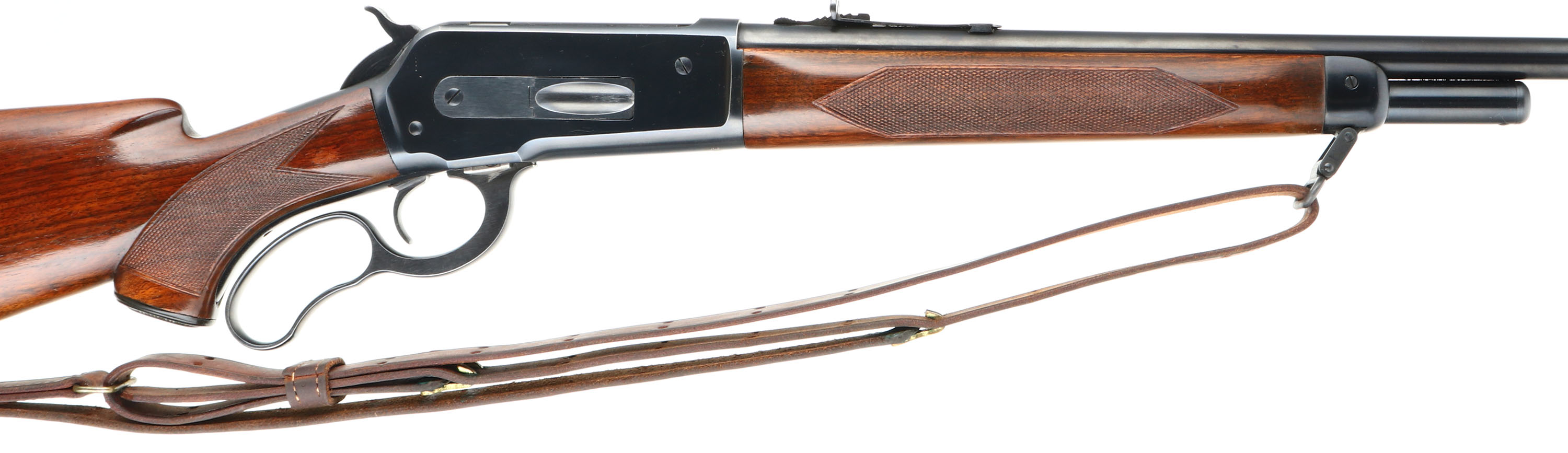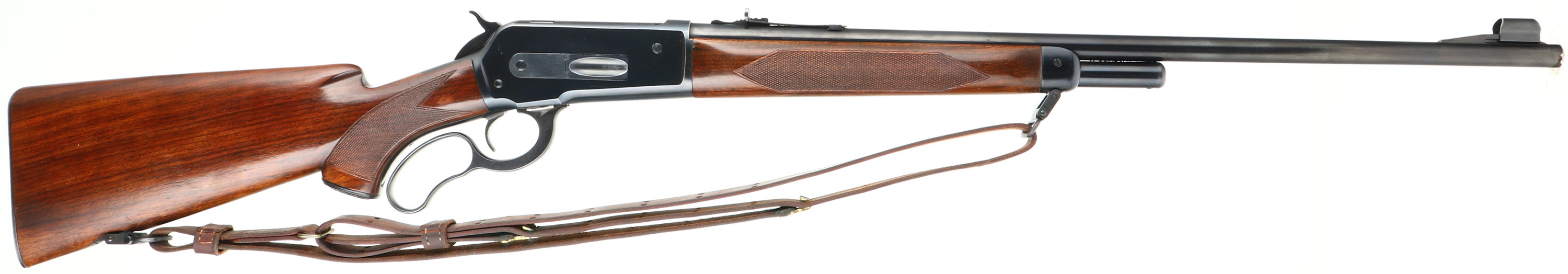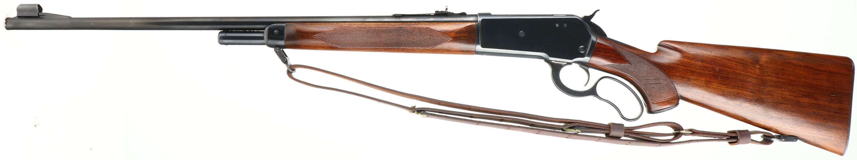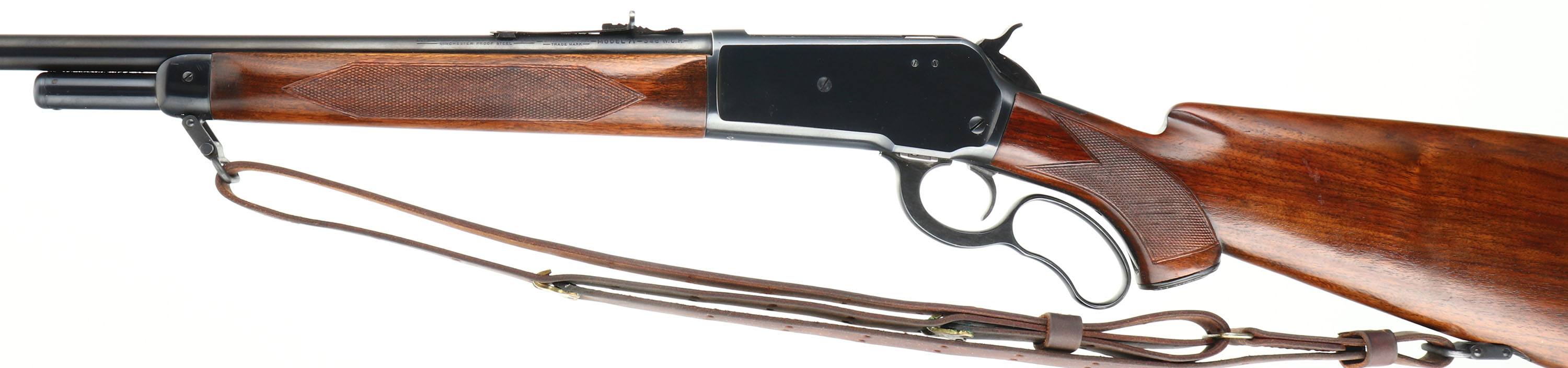 Winchester Model 71 Deluxe, CAL: marked 348 WCF, MFG: 1953, SN: 37234, Lever Action Rifle, 24'' Round barrel, Short tang. The original checkered & capped pistol grip wood stock is excellent, with very few tiny handling marks to the original finish. The original metal blue finish rates 99% overall. Bore is excellent. The barrel carries an adjustable rear & a hooded ramp blade front sights. Buttstock carries a checkered metal buttplate. Original sling provisions, swivels & correct period leather sling. An overall excellent example & highly collectible in this condition.* FFL or C&R Req. - Value: 4000 to 5500