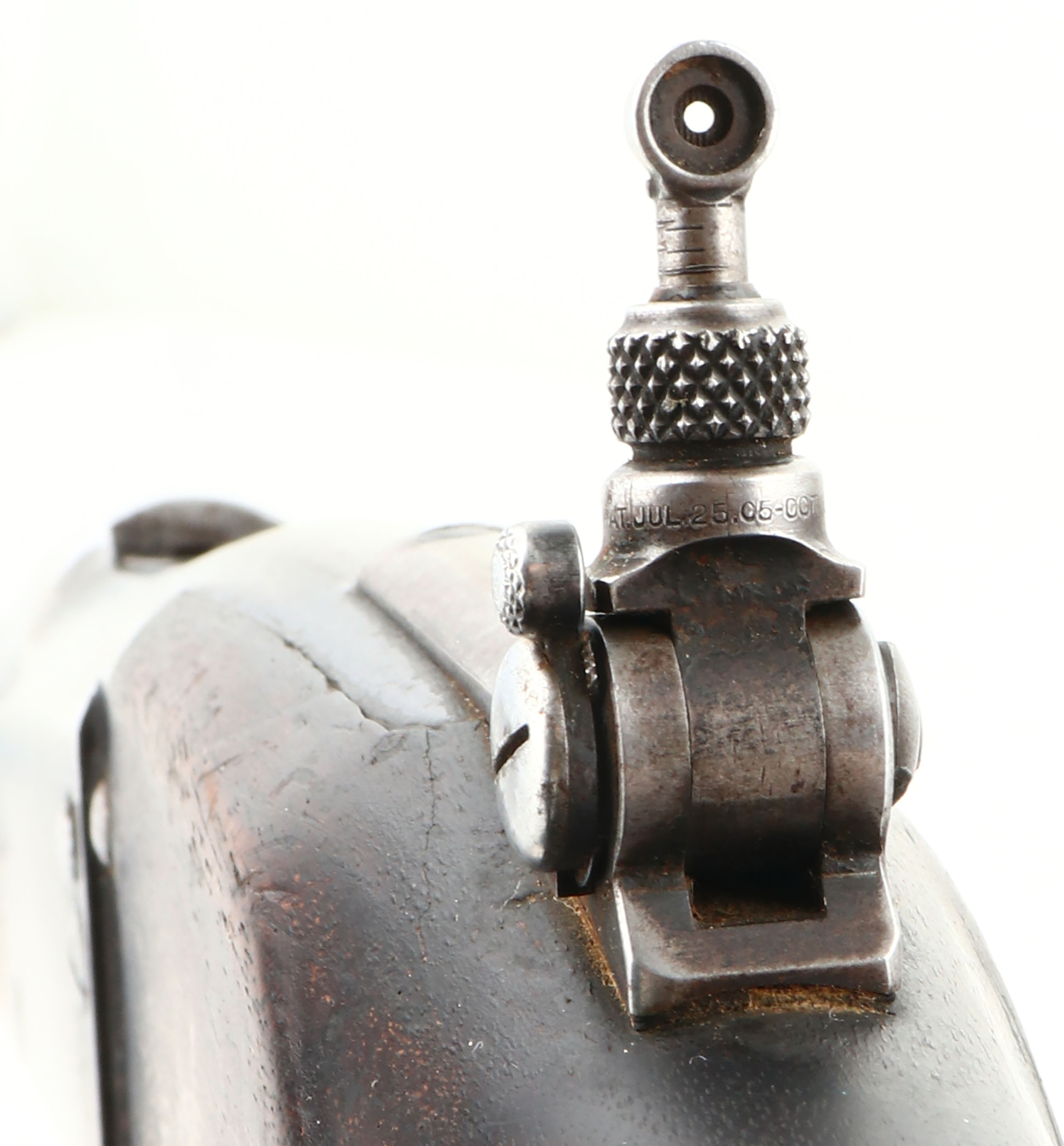 Savage Model 1899, CAL: 30-30, MFG: 1908, SN: 84064, Lever Action Rifle, 20'' Round barrel. The straight grip wood stocks are very good & solid. The stocks carry worn original finish, with numerous small scratches, contusions & scrapes. The metal blue finish has worn mostly gun metal gray, with some remains of blue in protected areas & speckling. Bore is excellent. The receiver carries a Lyman tang sight, while the barrel holds an ivory blank filled rear dovetail & long blade front sight. Crescent metal buttplate. Smooth action. A good old vintage hunting rifle. FFL or C&R Req. - Value: 500 to 1000