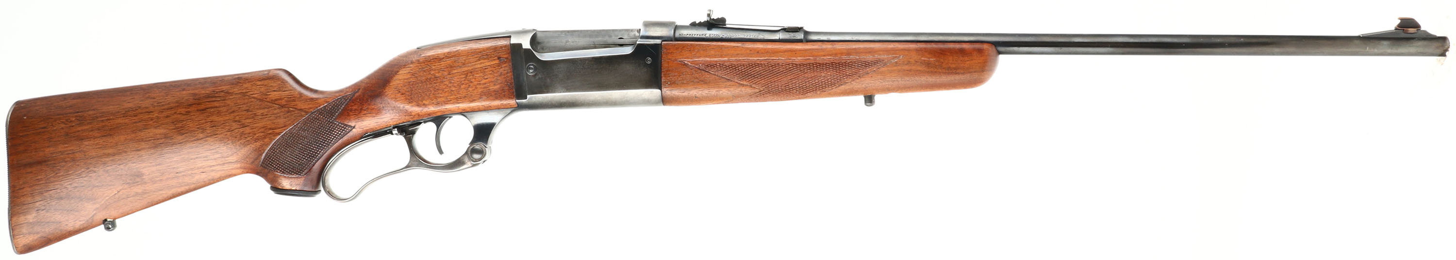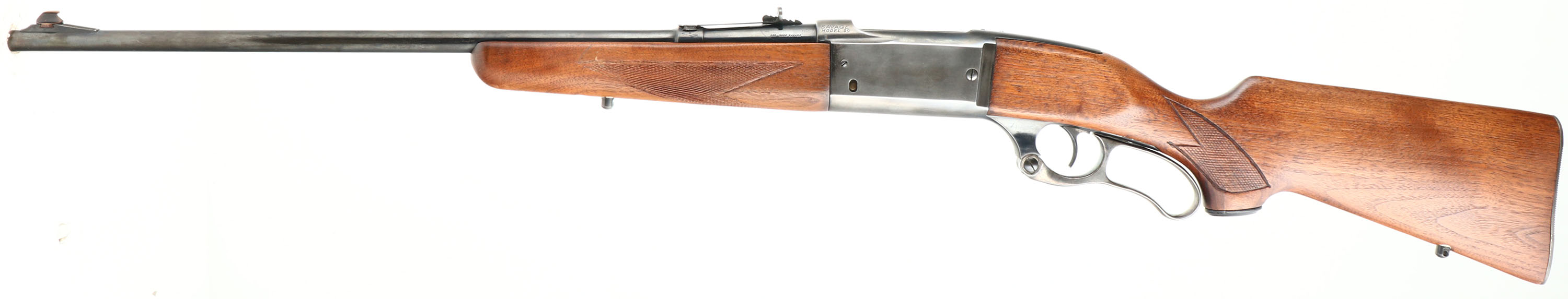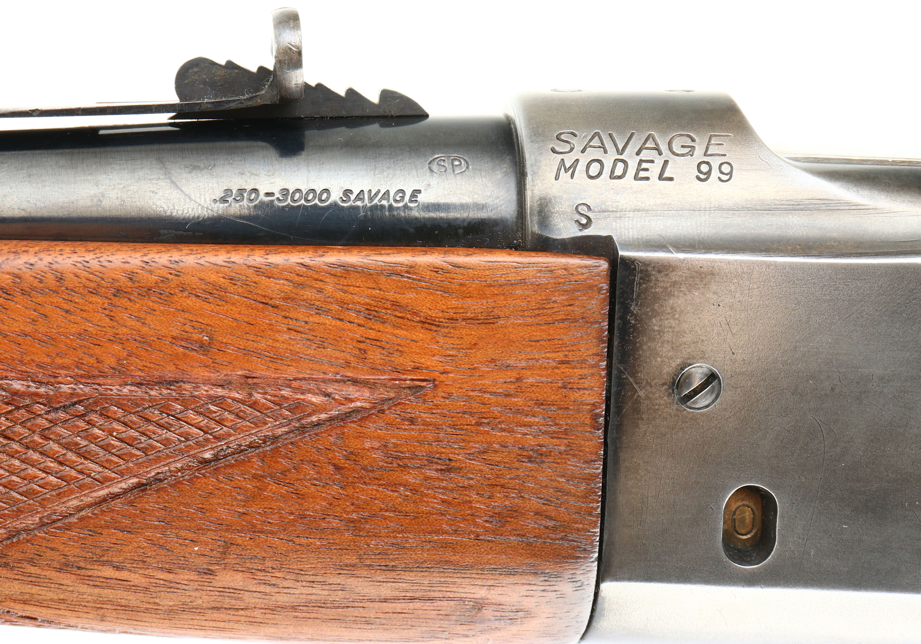 Savage, Model 99, CAL: 250-3000, MFG: 1956, SN: 776361, Lever Action Rifle, 22'' round barrel. The original checkered & capped pistol grip wood stocks are very good & solid, despite large crack repairs & having been sanded & refinished. The stock has a 9'' tight crack repair that runs from the toe to the pistol grip on the right side & another tight 4'' crack repair from comb through to the checkering in the wood. After the repairs, the stock was thinned & reshaped along the belly & comb, especially to the right side. It was then sanded & nicely refinished. There are very few handling marks remaining to the current finish & overall appearance is excellent. The metal blue finish is a combination of original finish & applied finish, with 95% coverage on the barrel, 50% on the receiver. The case-hardened lever has faded mostly gun metal gray. Bore is excellent. The barrel holds an adjustable rear sight & ramp elevated blade front sight. Grooved metal buttplate. Sling studs. Great overall appearance. FFL or C&R Req. - Value: 300 to 600