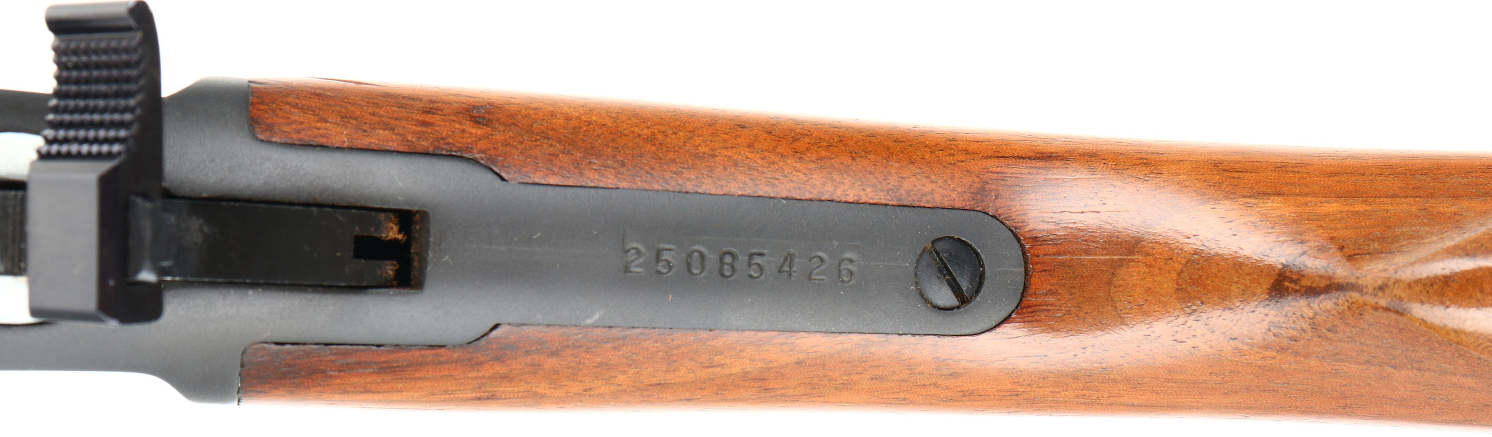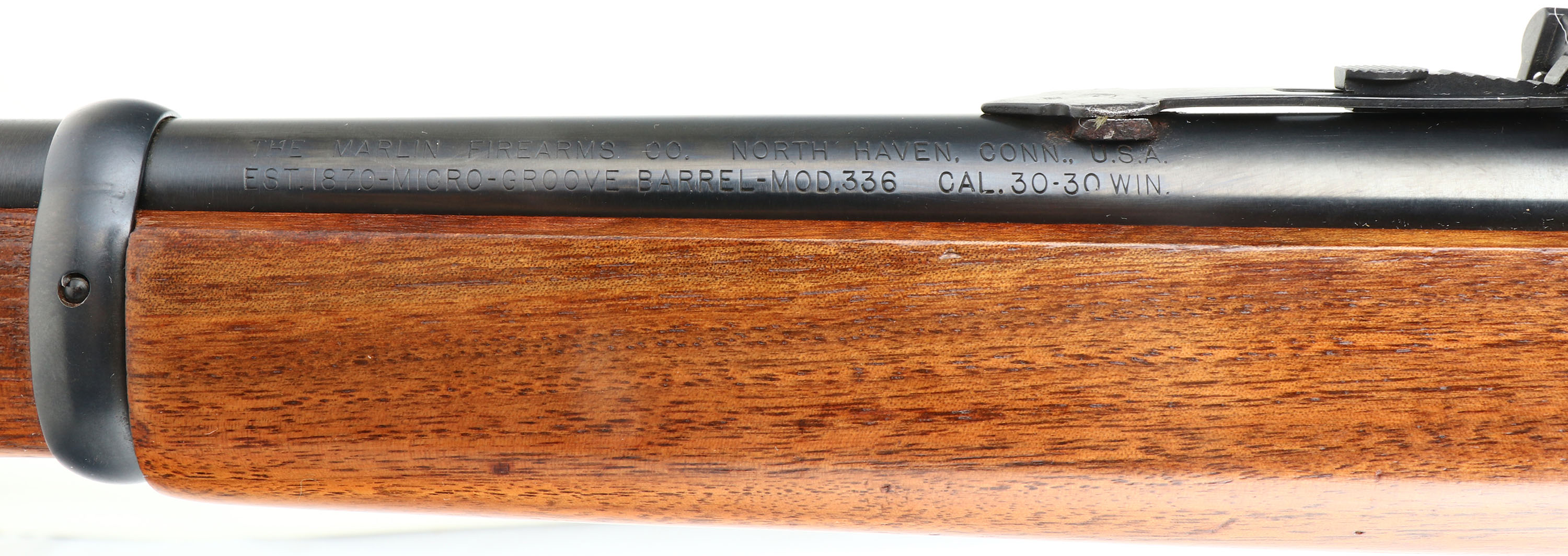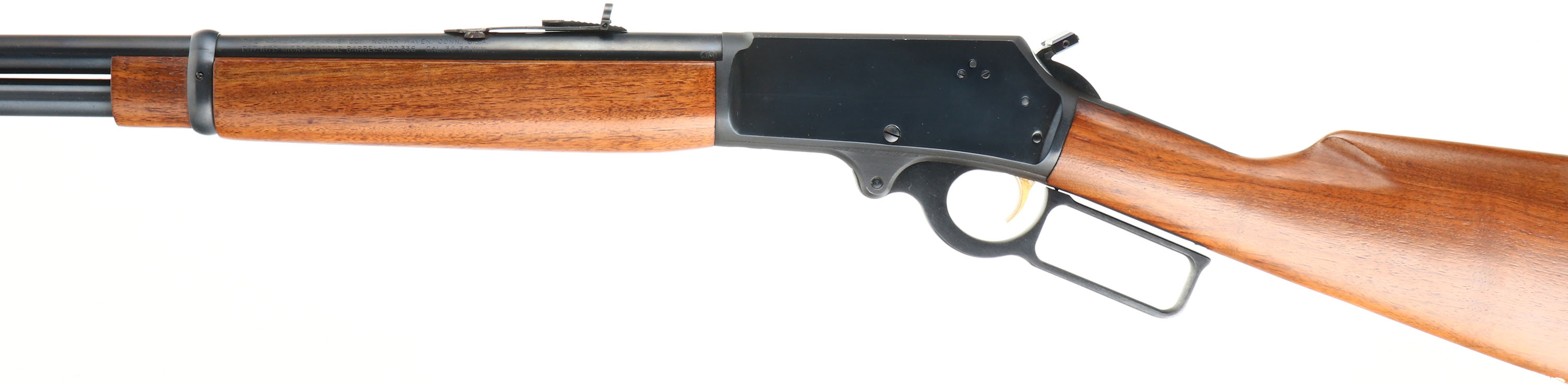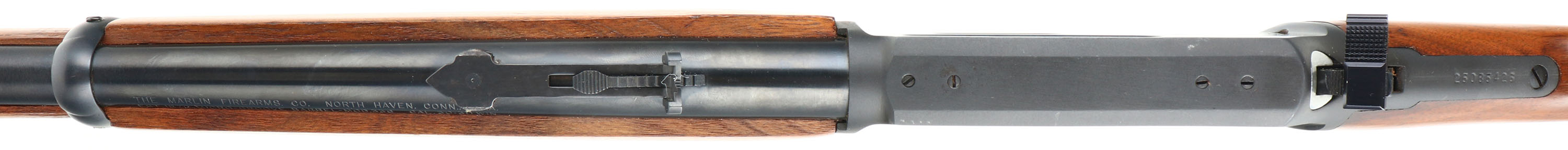 Marlin, Model 336, CAL: 30-30, MFG:1975, SN: 25085426, Lever Action Rifle, 20'' barrel, Full Mag. The smooth & straight grip wood stocks are excellent, with very few tiny handling marks to the original finish. The metal blue finish rates 99% overall. Bore is excellent, with strong rifling. The barrel carries the original adjustable rear & ramp elevated hooded front sights. Receiver is factory tapped & drilled for potential scope mounts. Stock carries a Marlin checkered plastic buttplate. Factory trademark bullseye in belly of the stock. Gold tone trigger. An excellent lever action hunting rifle. FFL Req. - Value: 400 to 800