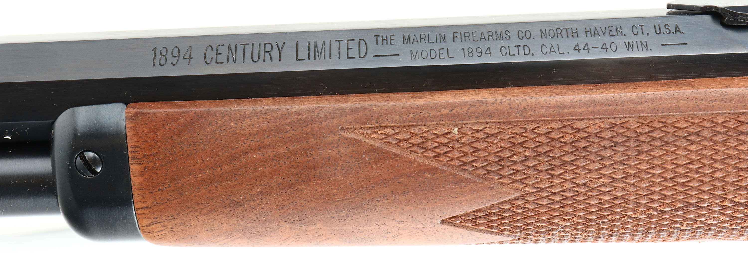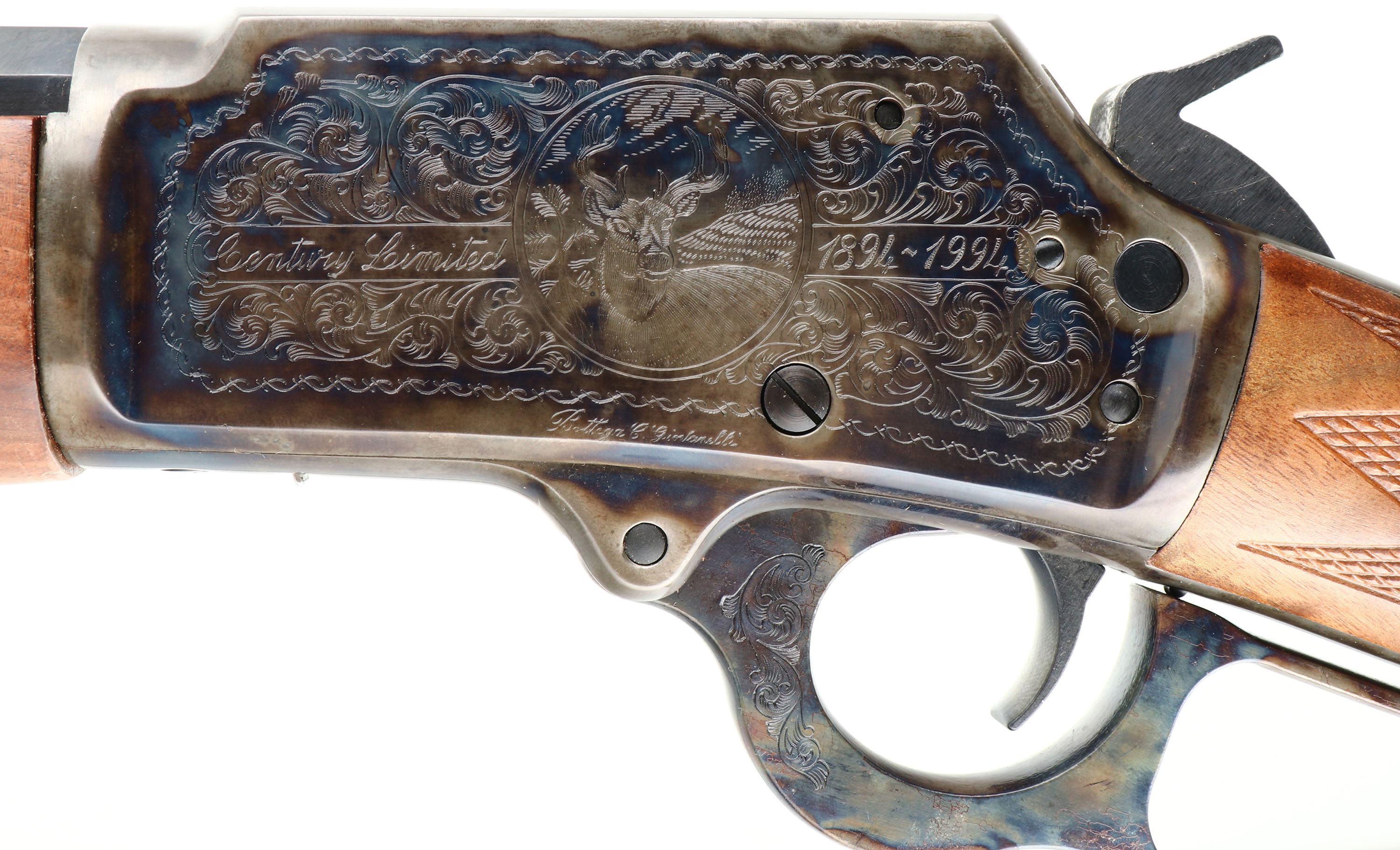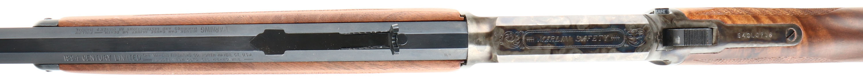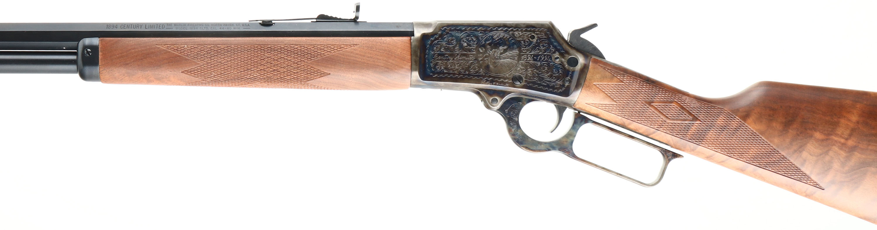 NEW BOXED, Marlin, 1894 Century Limited, 100 Year Anniversary (1894CNLTD). CAL: .44-40, MFG: 1994, SN: 94CL0716, Lever Action Rifle, 24'' Octagon barrel. Full Mag. Both sides of the case-hardened receiver & lever feature foliate engraving. The left side of the receiver has ''Century Limited 1894-1994'', an engraved buck, & signature of engraver ''Bottega C. Giovanelli'' at the bottom. The right side has the Marlin horse back rider engraved. The upper tang is marked with the serial number. The top of the receiver has foliate engraving & is marked ''MARLIN SAFETY''. The stocks are two-piece checkered walnut with an oiled finish, capped forearm, straight grip & comb, & a crescent brass buttplate. The buttstock has the ''Marlin Bullseye'' in the belly. The metal blue finish rates 100% overall. The receiver displays vivid case-colors. Bore is mint. Barrel carries factory buckhorn rear & front blade sights. Comes in original matching box, with packaging & paperwork. NOS. A fantastic commemorative rifle. FFL Req. - Value: 1000 to 2000