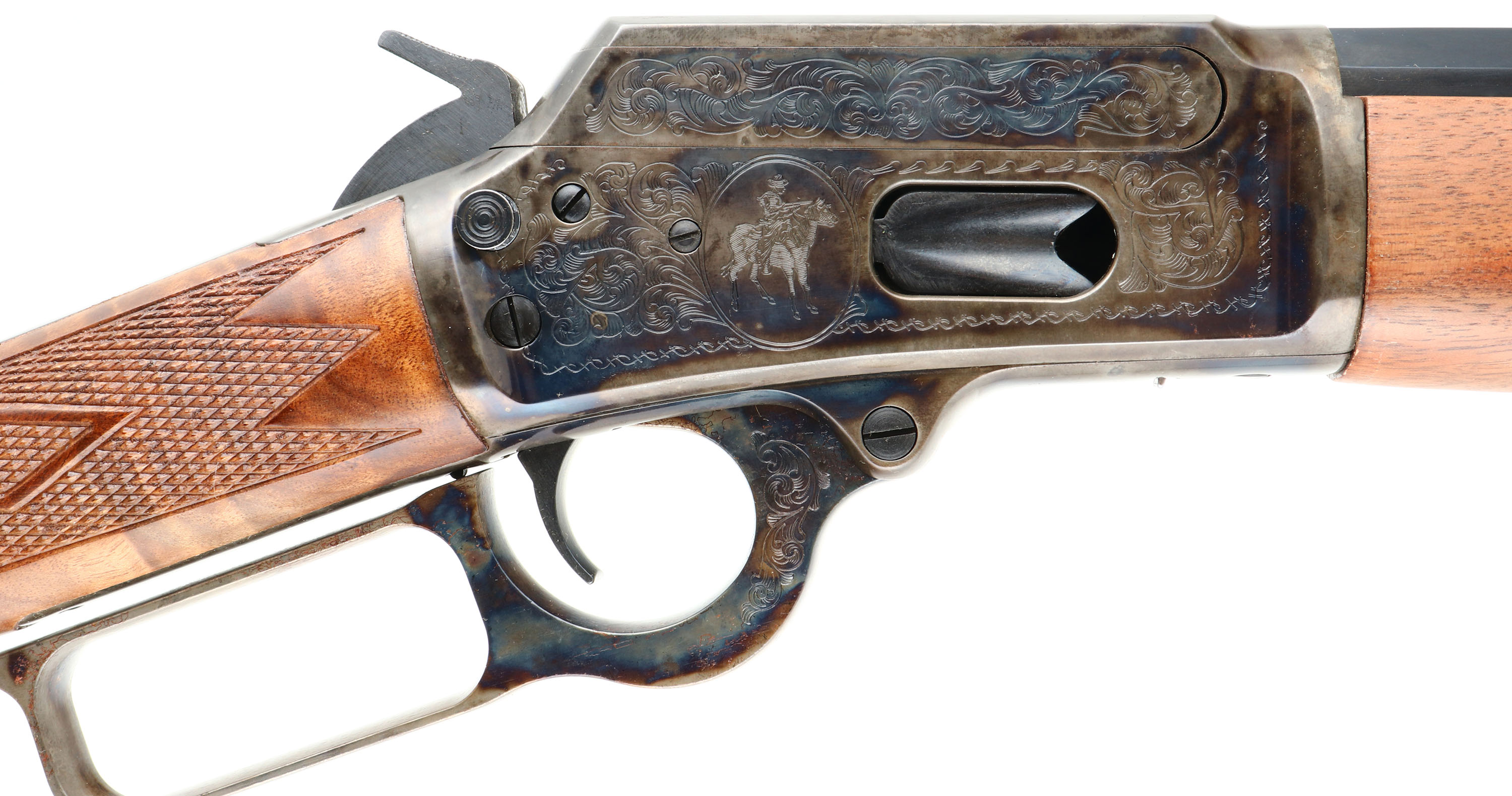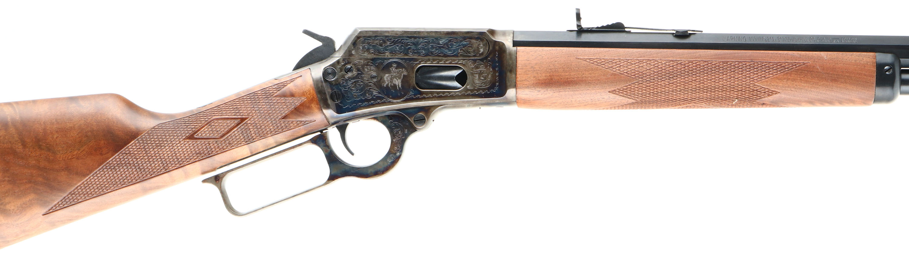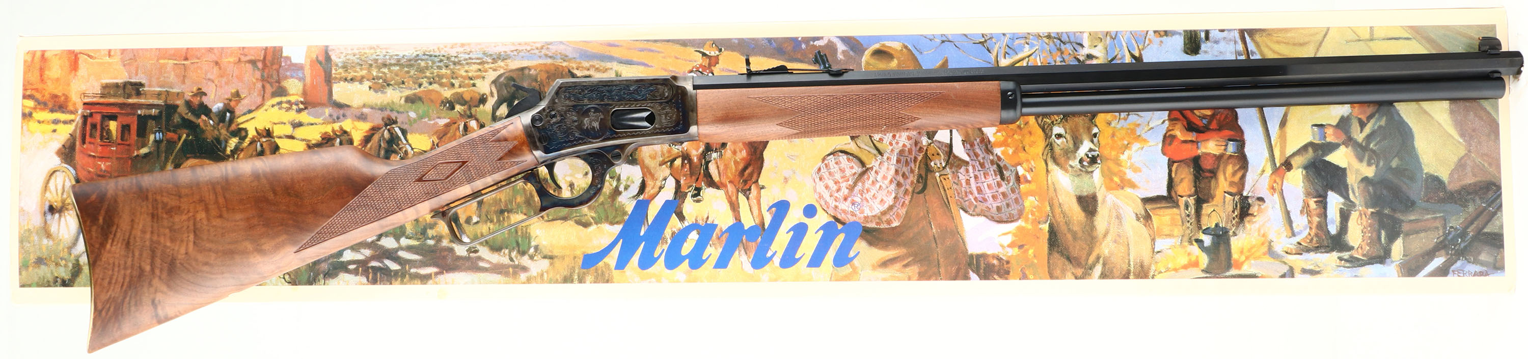 NEW BOXED, Marlin, 1894 Century Limited, 100 Year Anniversary (1894CNLTD). CAL: .44-40, MFG: 1994, SN: 94CL0716, Lever Action Rifle, 24'' Octagon barrel. Full Mag. Both sides of the case-hardened receiver & lever feature foliate engraving. The left side of the receiver has ''Century Limited 1894-1994'', an engraved buck, & signature of engraver ''Bottega C. Giovanelli'' at the bottom. The right side has the Marlin horse back rider engraved. The upper tang is marked with the serial number. The top of the receiver has foliate engraving & is marked ''MARLIN SAFETY''. The stocks are two-piece checkered walnut with an oiled finish, capped forearm, straight grip & comb, & a crescent brass buttplate. The buttstock has the ''Marlin Bullseye'' in the belly. The metal blue finish rates 100% overall. The receiver displays vivid case-colors. Bore is mint. Barrel carries factory buckhorn rear & front blade sights. Comes in original matching box, with packaging & paperwork. NOS. A fantastic commemorative rifle. FFL Req. - Value: 1000 to 2000