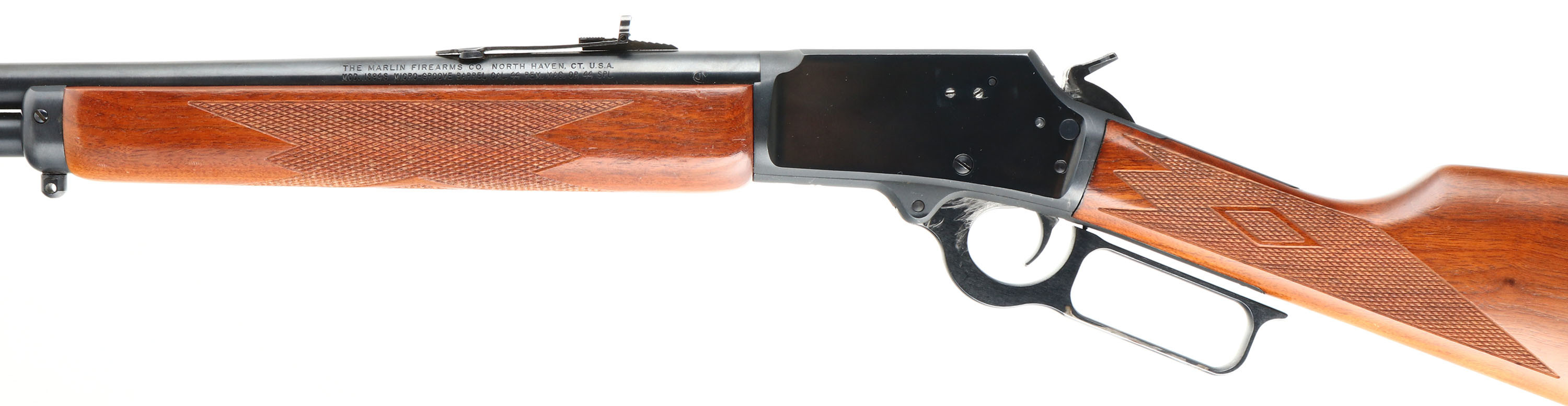 BOXED Marlin, Model 1894S, CAL: 44 Rem Mag, MFG: modern, SN: 06044992, Lever Action Rifle, 20 1/4'' barrel, Full Mag. The original checkered & straight grip wood stocks are excellent, with some minor handling marks to the original finish. The metal blue finish rates 95% overall, with some speckling spots. Bore is excellent. The barrel carries the original adjustable rear & ramp elevated hooded front sights. Receiver is factory tapped & drilled for potential scope mounts. Stock carries a Marlin solid buttpad, missing rear sling stud. Factory trademark bullseye in belly of the stock. An excellent lever action hunting rifle. FFL Req. - Value: 600 to 1000