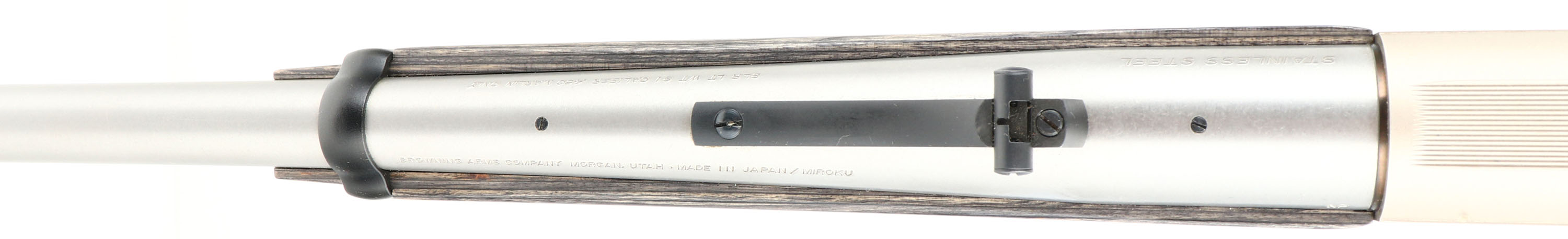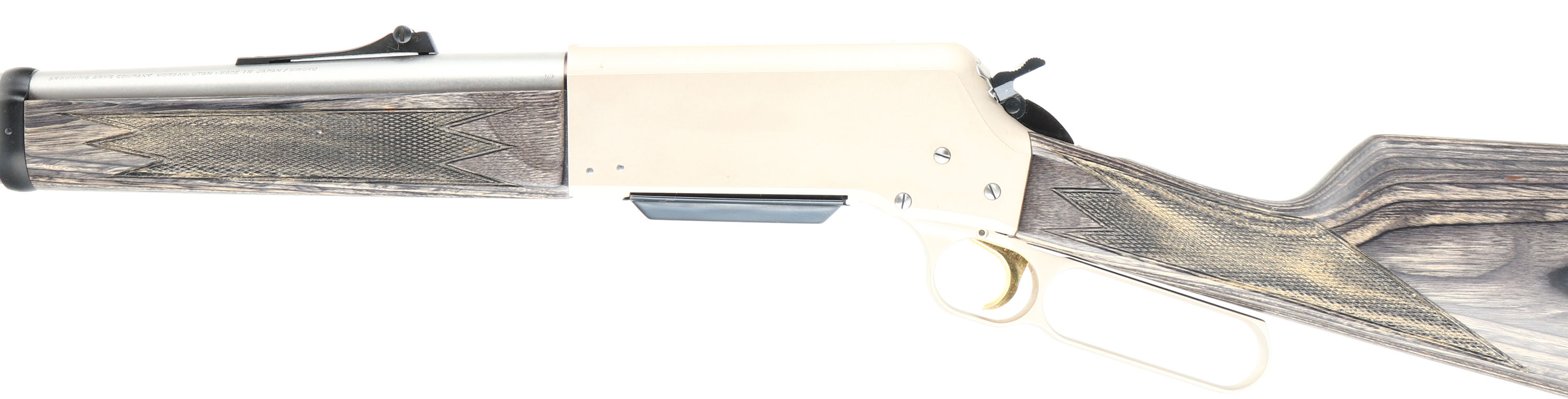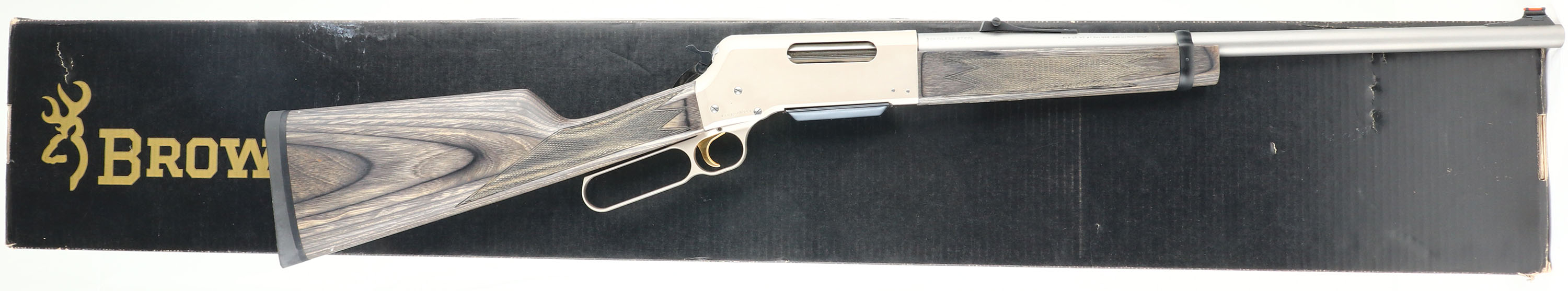 Boxed & NEW Browning, Model BLR 81 Lightweight, Marked .450 Marlin, Cal., MFG. Modern, SN: 01812ZW341, Lever Action Rifle, 20'' round barrel, Detachable 4 round box mag. Original factory checkered gray laminated wood stocks are excellent, with mint original finish. The original stainless steel barrel & satin gray receiver finishes are 100%. Bore is mint. Factory rear & fiber optic front sights. Original black solid recoil pad. Gold Trigger. Rifle comes in correct SN matching box, with packaging & booklet. Essentially a NIB Browning lever. FFL Req - Value: 600 to 1000