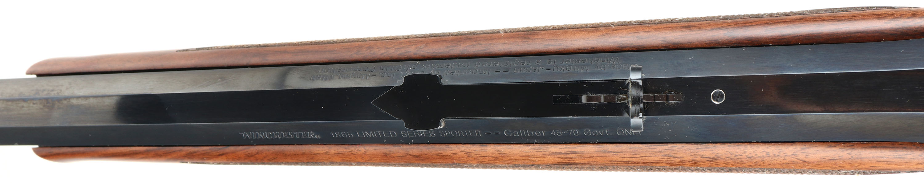 BOXED Winchester, Model 1885 Limited Series Sporter, CAL: 45-70 Govt Only, MFG: Modern, SN: 99179MP85J, Lever Action Single Shot Rifle, 24'' Octagon barrel. The factory checkered & straight grip walnut stocks are near mints. The original deep high polish metal blue finish rates 99% overall. Bore is excellent. The rifle is fitted with adj. rear sight & gold beaded blade front sight. Buttstock carries an original solid recoil pad. Sling studs. Comes in the original box, with outer sleeve, lock, owner's manual & paperwork. FFL Req. - Value: 1000 to 2000
