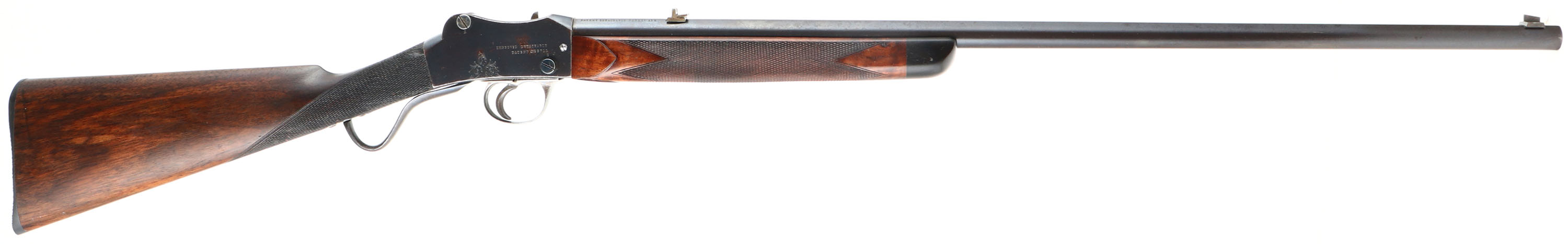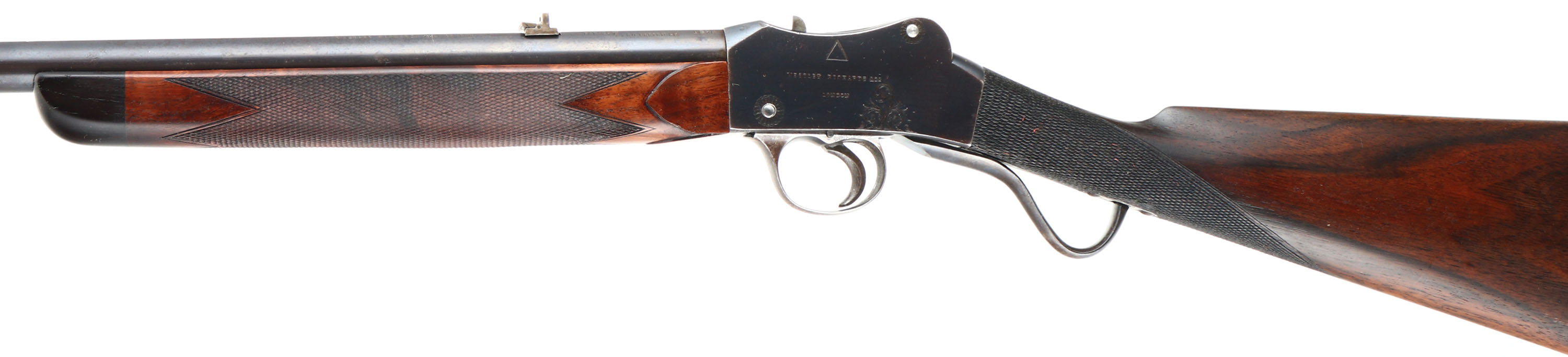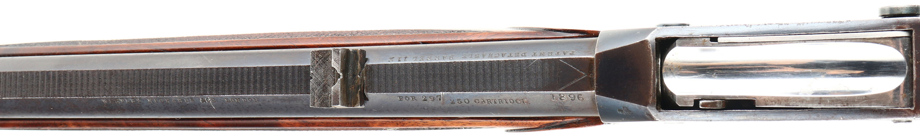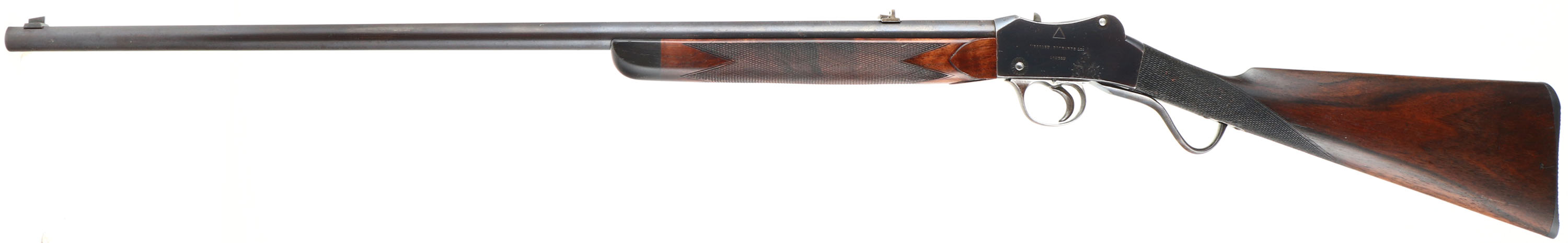 Westley Richards & Co., Sherwood Miniature ''Rook'' Rifle, CAL: 297/250 Rook, MFG: 1880's -1910, SN: 1896, Lever Action Breech Loading Rifle, 26 3/8'' barrel. This example is a small lightweight takedown rifle which used an improved Martini action chambered in the small ''Rook'' caliber. It makes an ideal rifle for small game hunting & target shooting. This unique British sporting firearm features a Detachable Barrel/Action patent. The left side of the barrel is marked ''WESTLEY RICHARDS & CO LONDON'', ''FOR 297/250 CARTRIDGE'', followed by ''1896''. The right side of the barrel is marked ''PATENT DETACHABLE BARREL 112''. The left side of receiver is marked ''WESTLEY RICHARDS & CO LONDON'' & the right side is marked ''IMPROVED DETACHABLE PATENT NO. 97111''. The original checkered straight grip wood stock with ebony forend tip is excellent, having been professionally refinished. There are minor contusions & handling marks to the finish. The original metal blue finish rates 90% overall, with intermittent spotting & speckling toned to a brown patina. The receiver displays ornamental scroll & accent engraving. Bore is good & bright, with intermittent pitting amongst proud rifling. The matted rib holds a two-tier folding leaf rear sight & blade front sight. Stock carries a checkered plastic buttplate, with squirrel vignette. Comes with (45) loaded rounds of .297/250 Rook, (53) unprimed brass cartridges & a 3 Die Set 297/250 Rook.* Antique, No FFL Req. - Value: 2000 to 3000