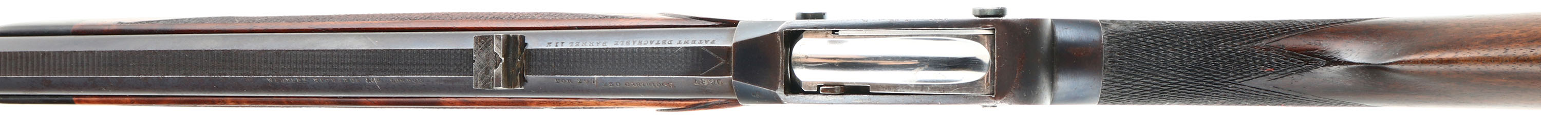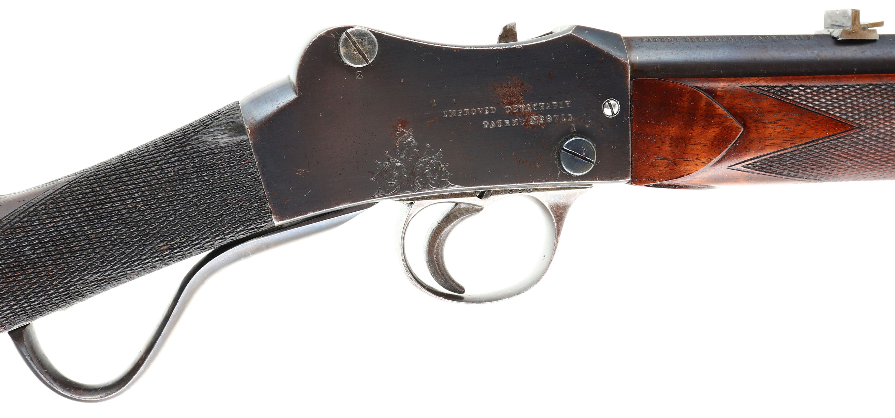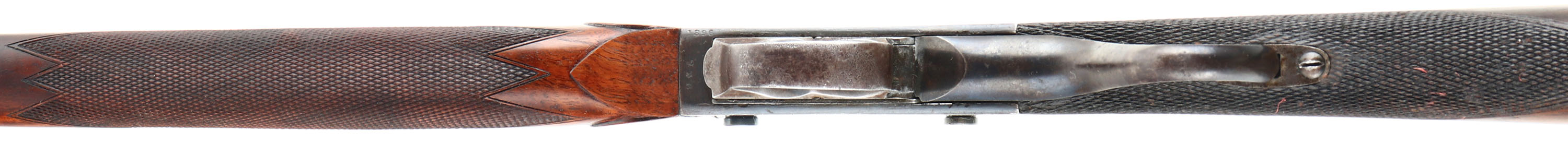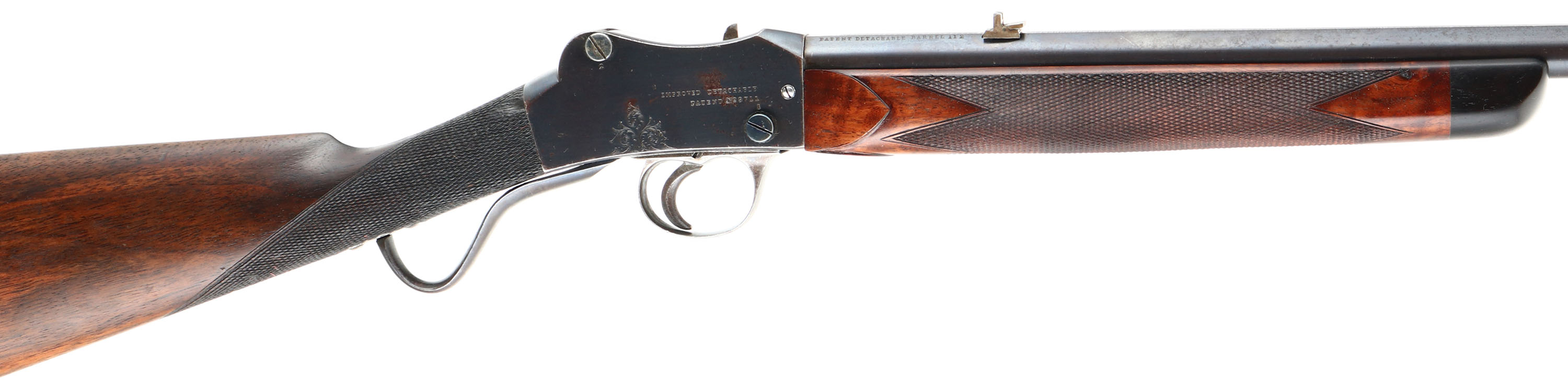 Westley Richards & Co., Sherwood Miniature ''Rook'' Rifle, CAL: 297/250 Rook, MFG: 1880's -1910, SN: 1896, Lever Action Breech Loading Rifle, 26 3/8'' barrel. This example is a small lightweight takedown rifle which used an improved Martini action chambered in the small ''Rook'' caliber. It makes an ideal rifle for small game hunting & target shooting. This unique British sporting firearm features a Detachable Barrel/Action patent. The left side of the barrel is marked ''WESTLEY RICHARDS & CO LONDON'', ''FOR 297/250 CARTRIDGE'', followed by ''1896''. The right side of the barrel is marked ''PATENT DETACHABLE BARREL 112''. The left side of receiver is marked ''WESTLEY RICHARDS & CO LONDON'' & the right side is marked ''IMPROVED DETACHABLE PATENT NO. 97111''. The original checkered straight grip wood stock with ebony forend tip is excellent, having been professionally refinished. There are minor contusions & handling marks to the finish. The original metal blue finish rates 90% overall, with intermittent spotting & speckling toned to a brown patina. The receiver displays ornamental scroll & accent engraving. Bore is good & bright, with intermittent pitting amongst proud rifling. The matted rib holds a two-tier folding leaf rear sight & blade front sight. Stock carries a checkered plastic buttplate, with squirrel vignette. Comes with (45) loaded rounds of .297/250 Rook, (53) unprimed brass cartridges & a 3 Die Set 297/250 Rook.* Antique, No FFL Req. - Value: 2000 to 3000