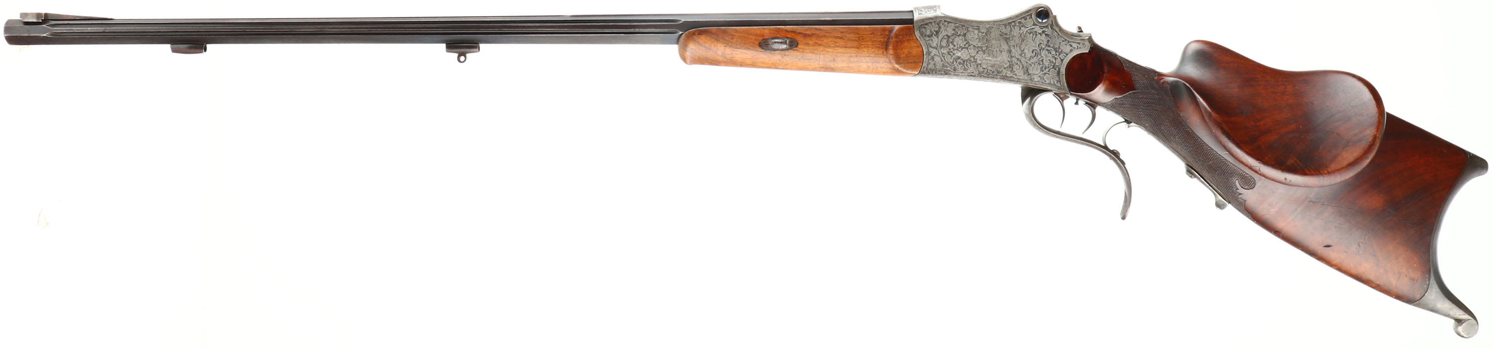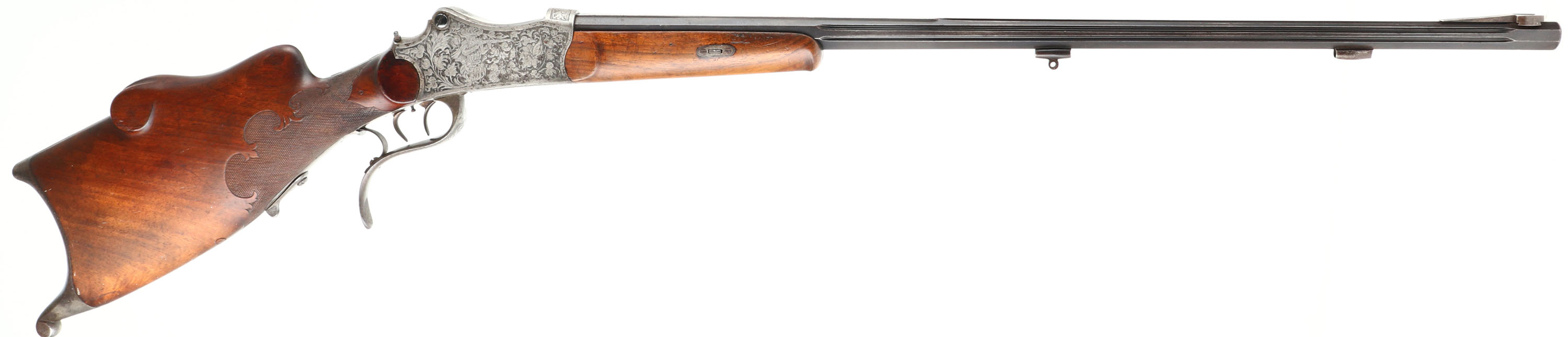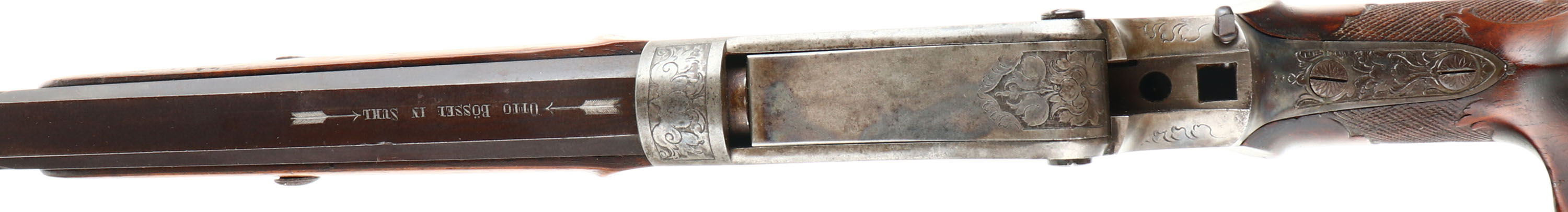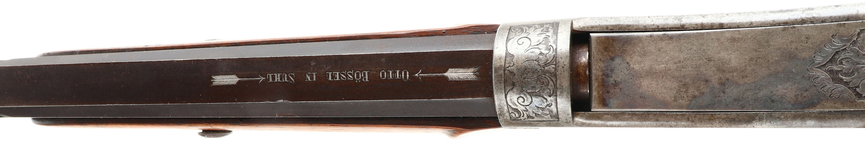 Otto Bossel, German Schuetzen Rifle, CAL: 8x14x46R, MFG: N/A, SN: NSN, Breech Loading Lever Action Rifle, Martini Action, 28'' fluted barrel. The top of the barrel flat is marked '' (Arrow) OTTO BOSSEL IN SUHL (Arrow)''. The factory checkered & carved walnut stock with high comb & flowing cheekpiece is excellent. The rifle is fitted with a plain schnabel tip forend that's been sanded & refinished. There are contusions, scrapes & dings to the finish. A small lever at the end of the bottom tang releases the stock from the receiver. The receiver & lever are fully engraved with floral scroll. The left side has a vignette of a sportsman cheering with a cup & the right side has a sportsman shooting a rifle. The metal finish on the fluted barrel has toned to a brown patina & the receiver is case-hardened, retaining faint case-colors in protected areas. Bore is excellent, with roughness amongst strong rifling. No rear sight, barrel has blank front sight provision. Stock has a large Schuetzen prong style buttplate with accent engraving. The receiver is missing the hammer/firing mechanism. No cleaning rod. With a few parts and some effort, this beautiful piece could be restored to a fully functioning Schuetzen rifle.* FFL or C&R Req. - Value: 1000 to 2000