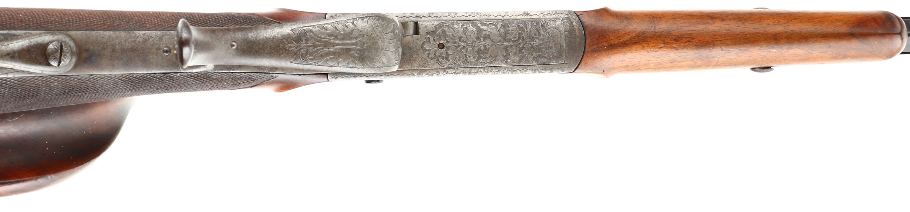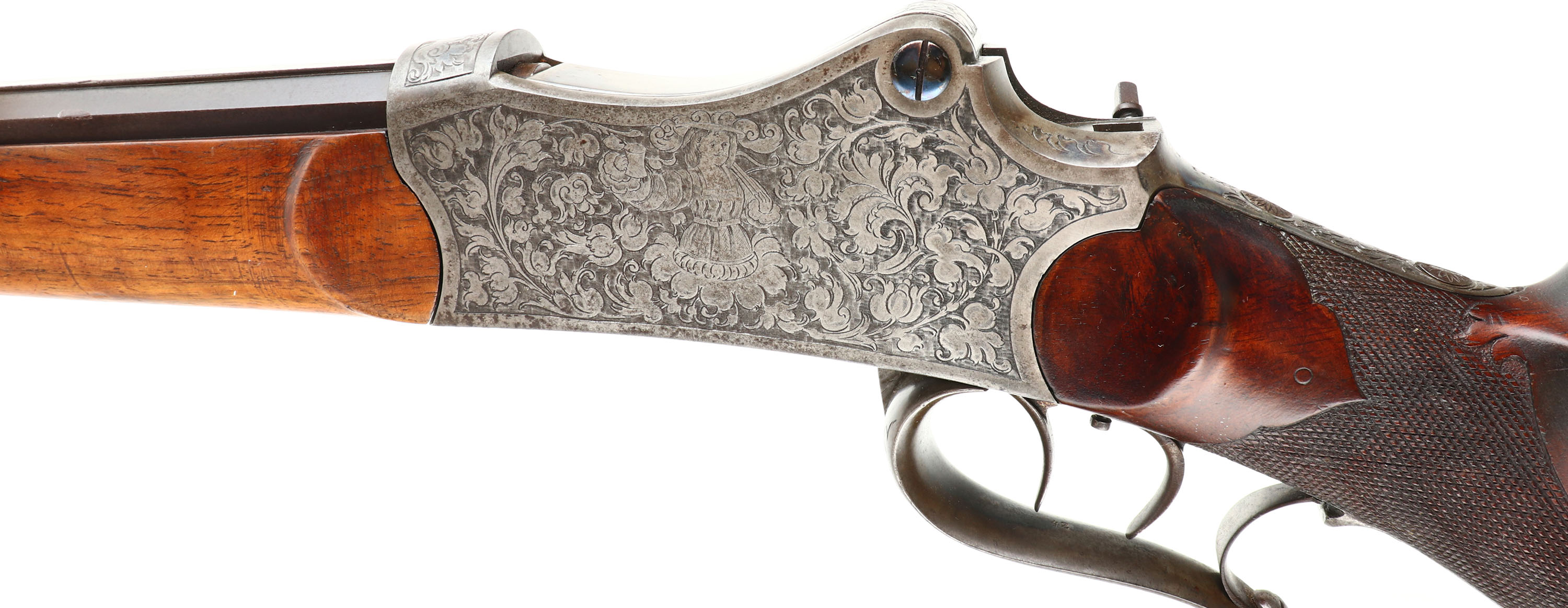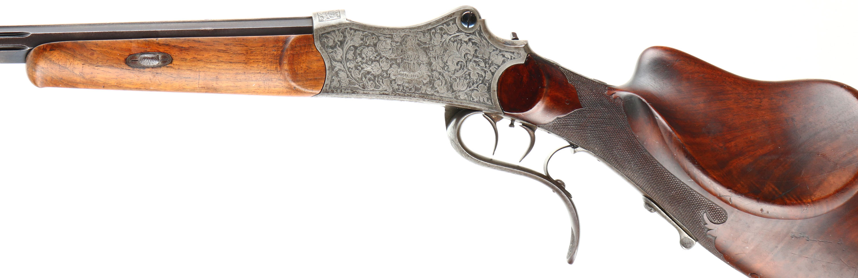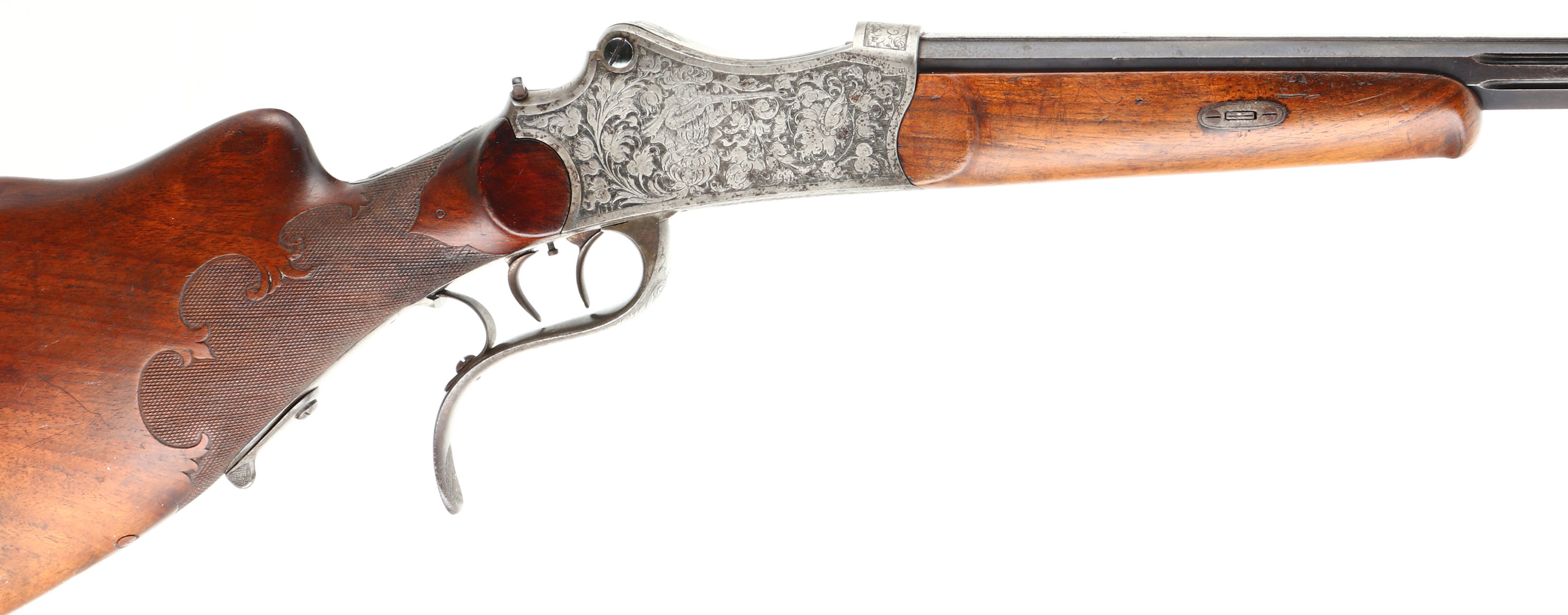 Otto Bossel, German Schuetzen Rifle, CAL: 8x14x46R, MFG: N/A, SN: NSN, Breech Loading Lever Action Rifle, Martini Action, 28'' fluted barrel. The top of the barrel flat is marked '' (Arrow) OTTO BOSSEL IN SUHL (Arrow)''. The factory checkered & carved walnut stock with high comb & flowing cheekpiece is excellent. The rifle is fitted with a plain schnabel tip forend that's been sanded & refinished. There are contusions, scrapes & dings to the finish. A small lever at the end of the bottom tang releases the stock from the receiver. The receiver & lever are fully engraved with floral scroll. The left side has a vignette of a sportsman cheering with a cup & the right side has a sportsman shooting a rifle. The metal finish on the fluted barrel has toned to a brown patina & the receiver is case-hardened, retaining faint case-colors in protected areas. Bore is excellent, with roughness amongst strong rifling. No rear sight, barrel has blank front sight provision. Stock has a large Schuetzen prong style buttplate with accent engraving. The receiver is missing the hammer/firing mechanism. No cleaning rod. With a few parts and some effort, this beautiful piece could be restored to a fully functioning Schuetzen rifle.* FFL or C&R Req. - Value: 1000 to 2000