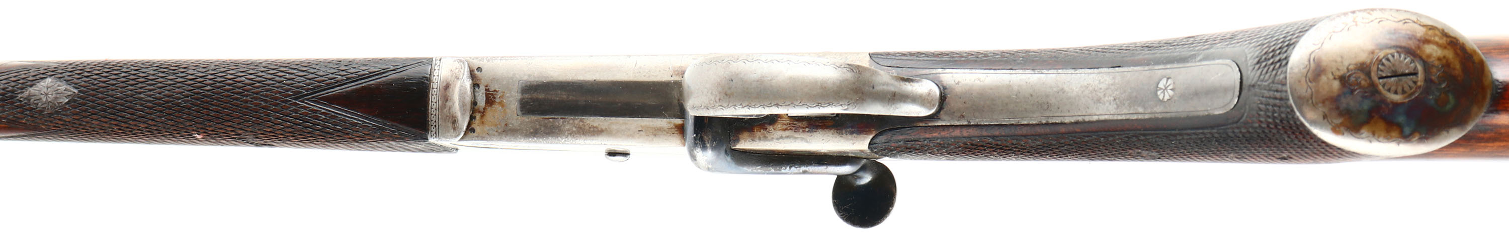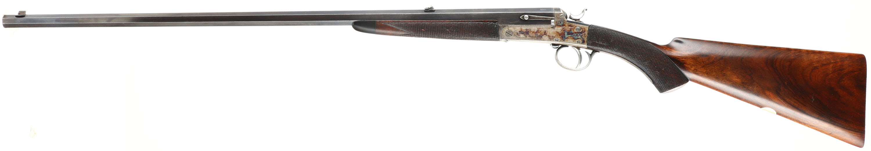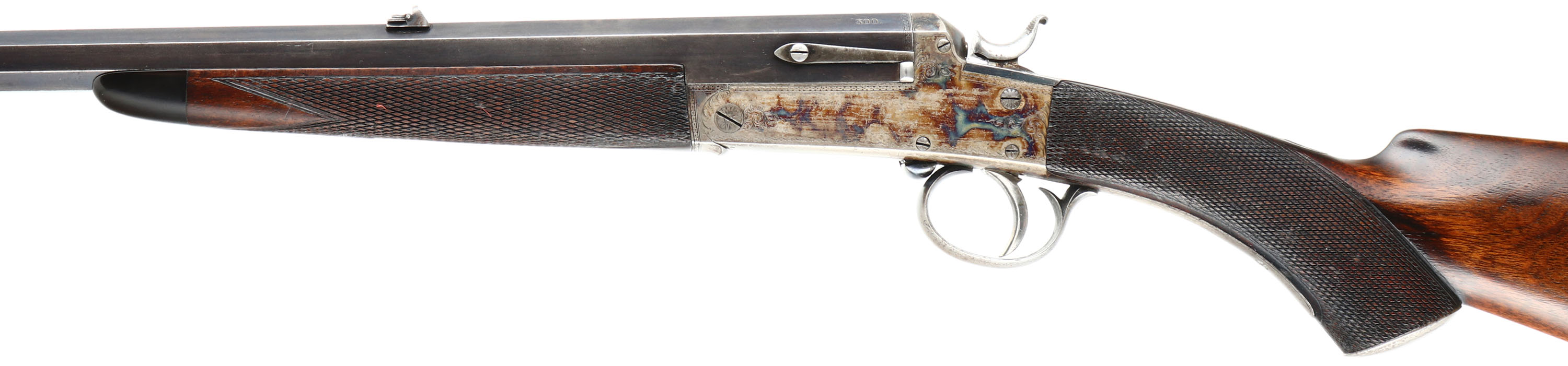 Peter Small, Rook Rifle, CAL: .300 Rook, MFG: N/A, SN: 66236, Side Lever Break Action Single Shot Rifle, 26'' octagon barrel, Partially Matted. The barrel flat is marked ''P.SMALL.28 PILGRIM ST NEW CASTLE ON TYNE''. The original checkered & capped pistol grip stocks, with ebony forend tip, are excellent, having been professionally restored. There is a blank oval nameplate on the belly. There are minor contusions & handling marks to the excellent finish. The original metal blue finish on the barrel rates 85%, with the edges showing loss. The case-hardened receiver & pistol grip cap still display vivid case-colors, while other areas have faded to metal gray. Fantastic scroll & accent hand engraving found on receiver back of barrel, trigger guard, pistol grip & small medallion inlaid into forend. Bore is excellent, but with light intermittent spotting amongst strong rifling. The barrel holds a 3-tier folding leaf rear sight & a blade front sight. Manufactured without a buttplate, but with serrated buttend. Comes with a full box of .300 Rook 90gr Ld FL PT ammunition.* FFL or C&R Req. - Value: 2000 to 3000