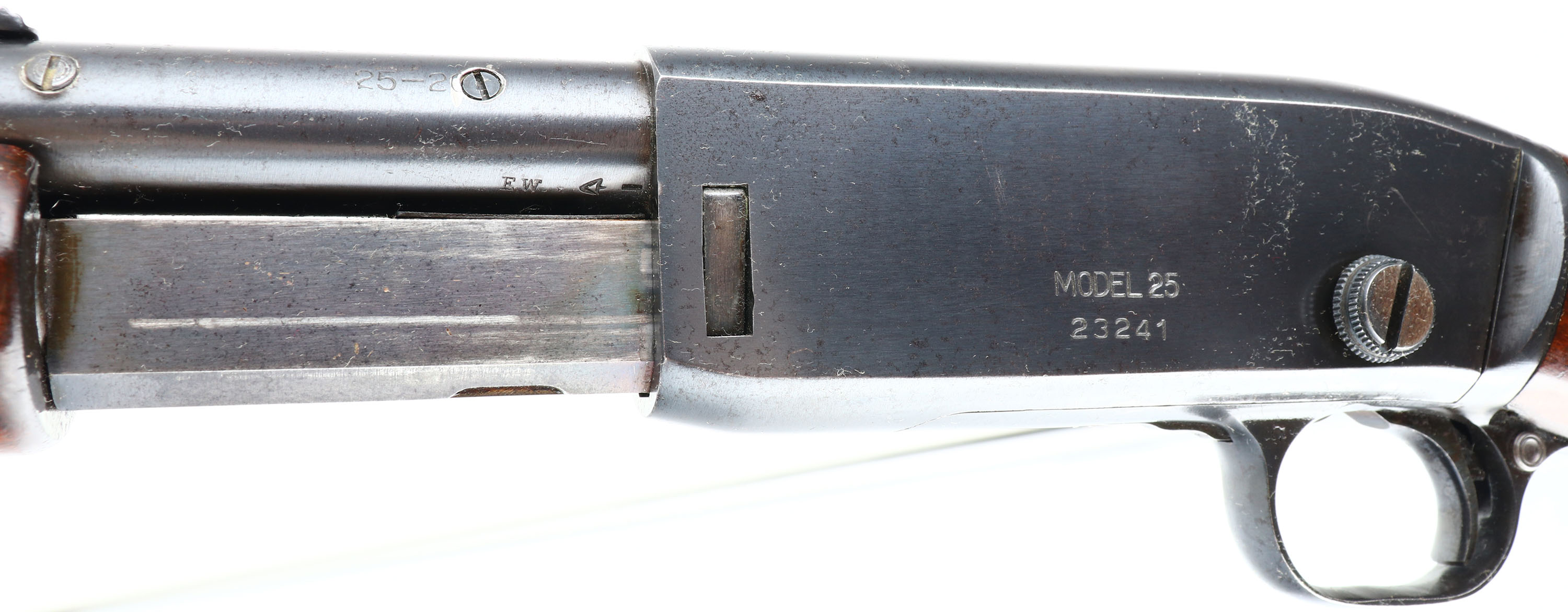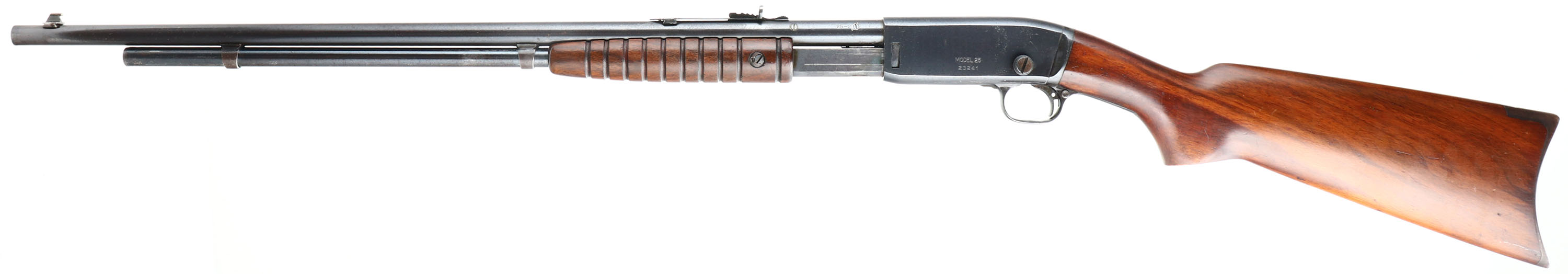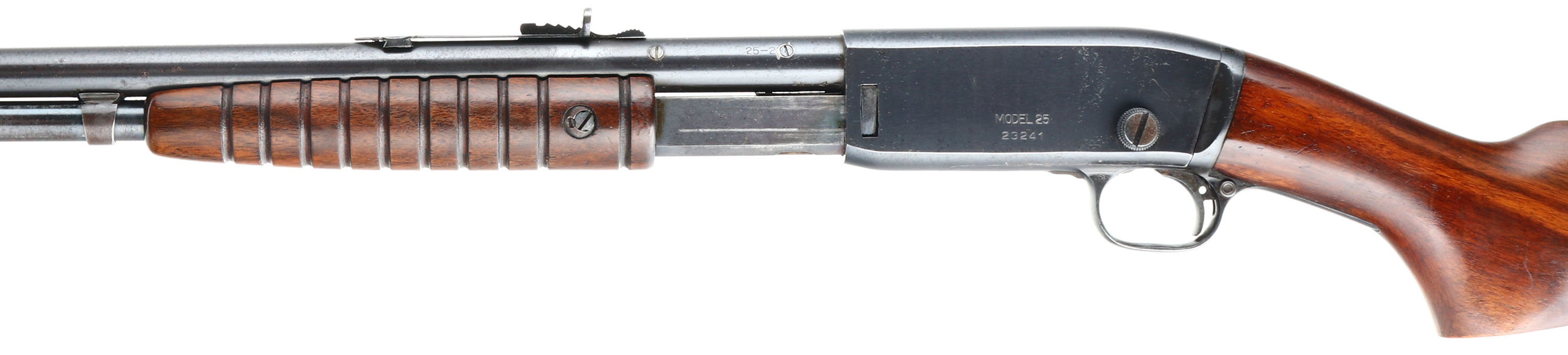 Remington, Model 25, marked 25-20, MFG: 1923-36, SN: 23241, Pump Action Take-down Rifle, 24'' round barrel. The original flat pistol grip wood stocks are excellent & solid. The finish is excellent, but with minor wear, scuffs & minor handling marks. The original metal blue finish rates 95% overall. Bore is excellent. Barrel carries an adjustable rear & small blade front sights. Remington stamped crescent metal buttplate. The barrel has two screw filled holes at the receiver end from possible scope mounting. These smaller caliber & light weight pumps were popular for small game & varmint hunting & most saw heavy use. Less than 32,000 Mod 25 rifles were produced in the two caliber, 32-20 & 25-20. An overall excellent condition & collectible rifle. FFL or C&R Req. - Value: 1000 to 2000