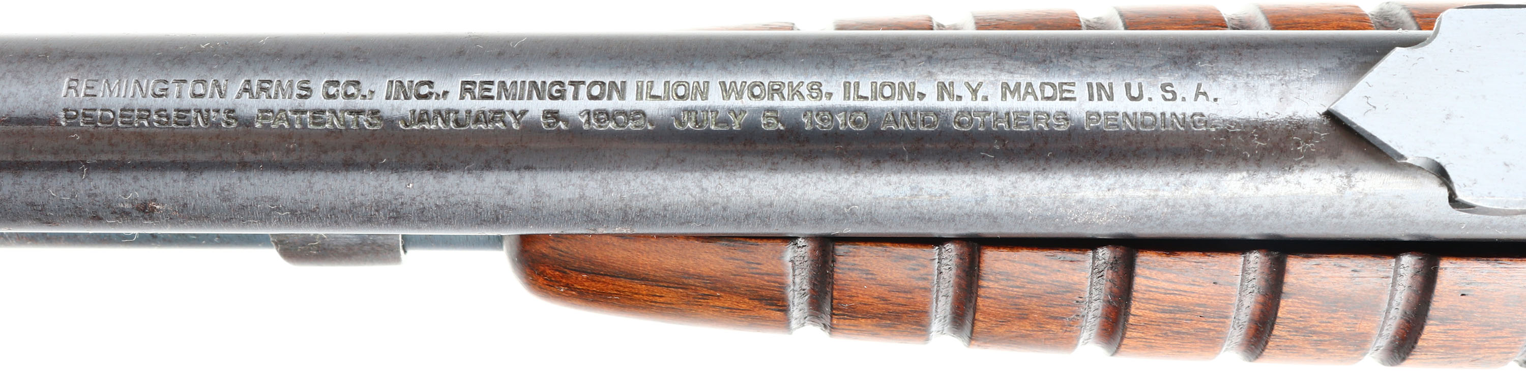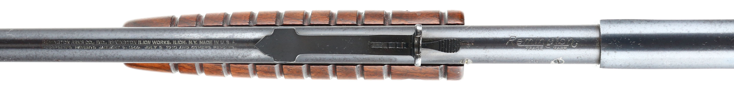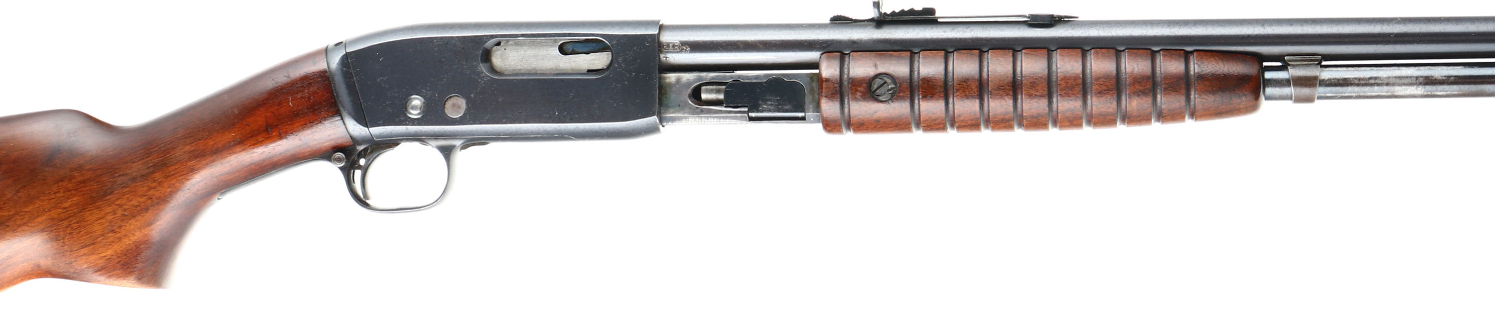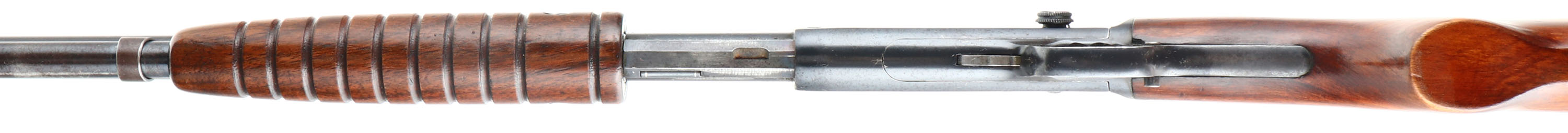 Remington, Model 25, marked 25-20, MFG: 1923-36, SN: 23241, Pump Action Take-down Rifle, 24'' round barrel. The original flat pistol grip wood stocks are excellent & solid. The finish is excellent, but with minor wear, scuffs & minor handling marks. The original metal blue finish rates 95% overall. Bore is excellent. Barrel carries an adjustable rear & small blade front sights. Remington stamped crescent metal buttplate. The barrel has two screw filled holes at the receiver end from possible scope mounting. These smaller caliber & light weight pumps were popular for small game & varmint hunting & most saw heavy use. Less than 32,000 Mod 25 rifles were produced in the two caliber, 32-20 & 25-20. An overall excellent condition & collectible rifle. FFL or C&R Req. - Value: 1000 to 2000