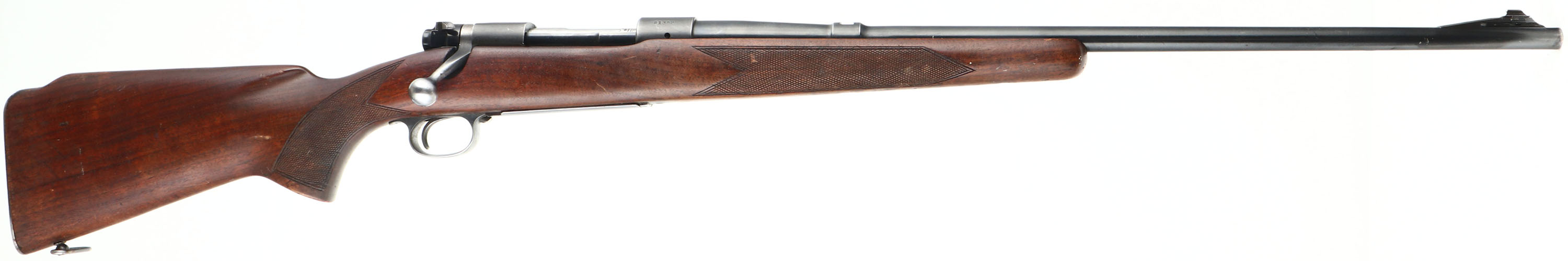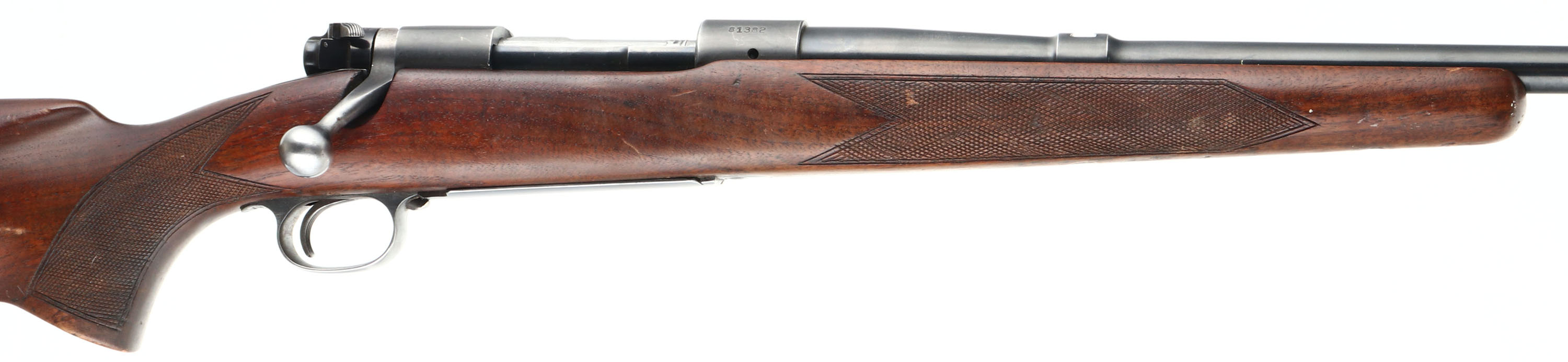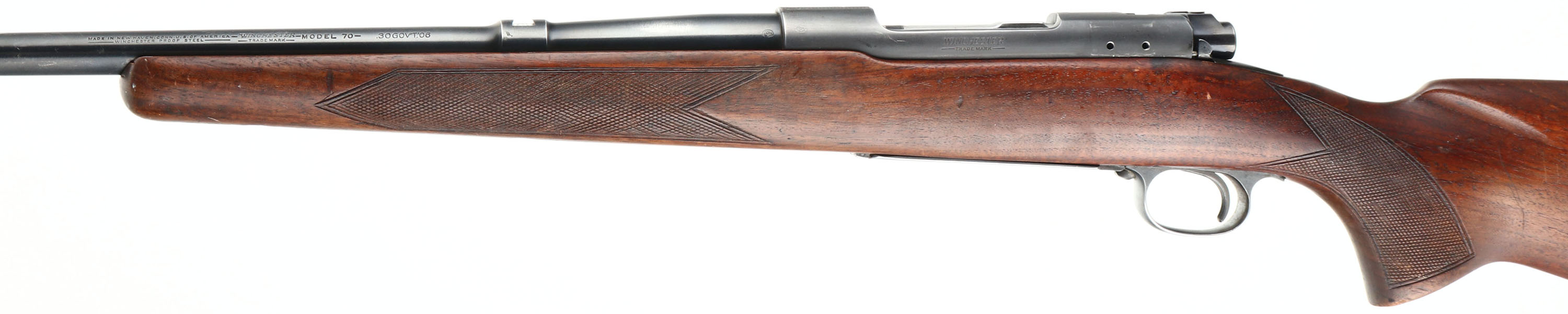 Winchester, Model 70, CAL: 30 GOV'T 06, MFG: 1948, SN: 81382, Bolt Action Rifle, 24'' barrel. The original checkered & flat pistol grip Monte Carlo stock is very good & solid. There is light overall wear, with contusions, scrapes & dings to the original finish. The metal blue finish on the barrel rates 85%. The factory receiver finish rates 95%. Bore is excellent. The receiver is tapped & drilled with (6) open screw holes for scope or receiver sight mounting, (4) on the top & (2) on the left rear side. The barrel has a open rear dovetail & a ramp elevated beaded blade front sight. Rear sling loop present, front sling loop missing. Stock carries a checkered metal buttplate with rust spotting. Stock has been shortened, with a 12'' LOP. FFL or C&R Req. - Value: 500 to 900