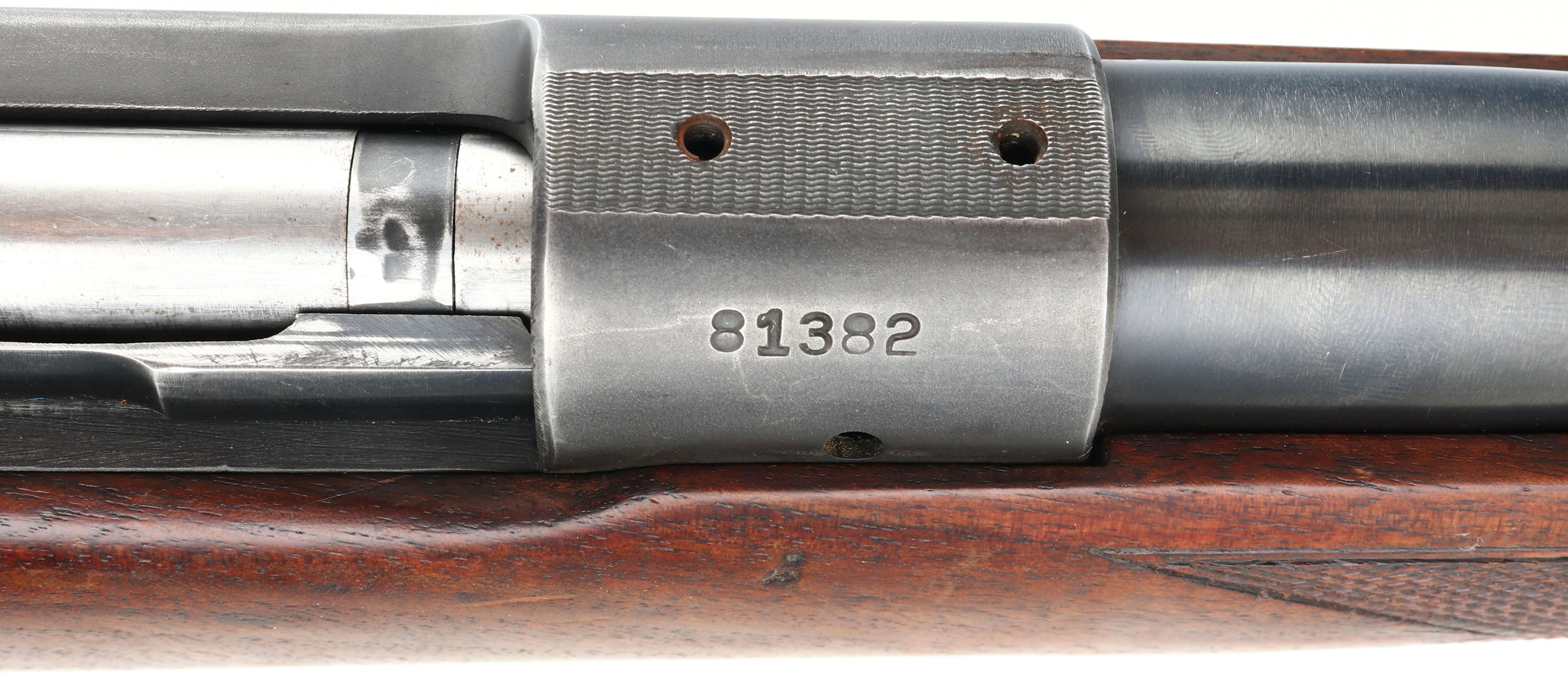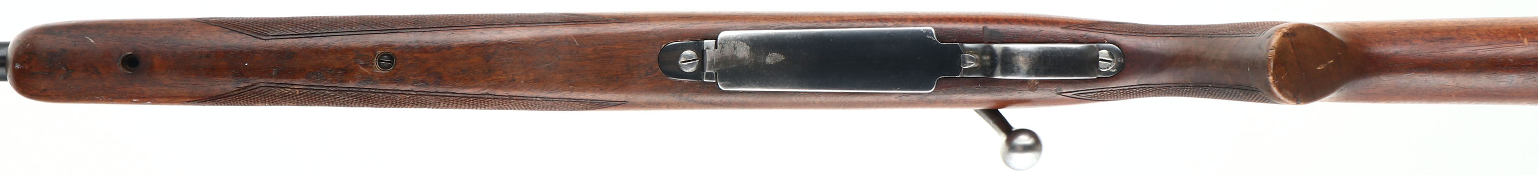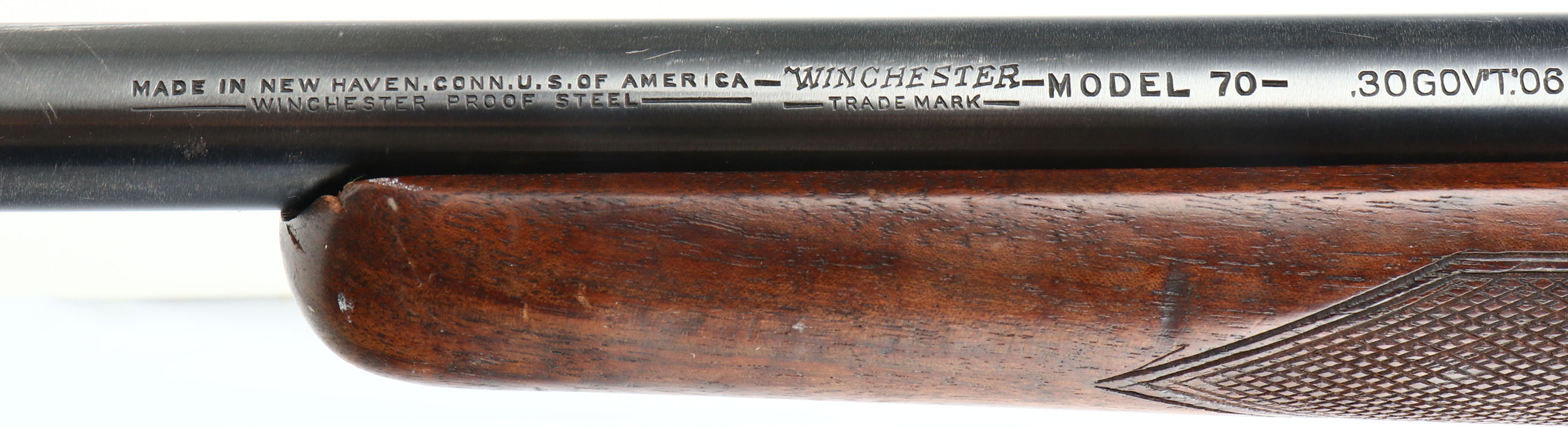 Winchester, Model 70, CAL: 30 GOV'T 06, MFG: 1948, SN: 81382, Bolt Action Rifle, 24'' barrel. The original checkered & flat pistol grip Monte Carlo stock is very good & solid. There is light overall wear, with contusions, scrapes & dings to the original finish. The metal blue finish on the barrel rates 85%. The factory receiver finish rates 95%. Bore is excellent. The receiver is tapped & drilled with (6) open screw holes for scope or receiver sight mounting, (4) on the top & (2) on the left rear side. The barrel has a open rear dovetail & a ramp elevated beaded blade front sight. Rear sling loop present, front sling loop missing. Stock carries a checkered metal buttplate with rust spotting. Stock has been shortened, with a 12'' LOP. FFL or C&R Req. - Value: 500 to 900