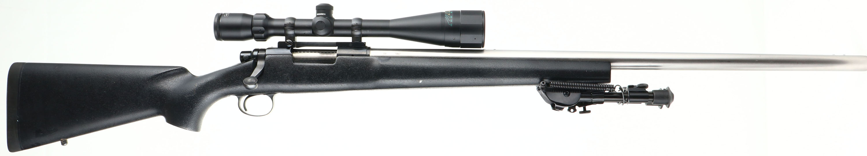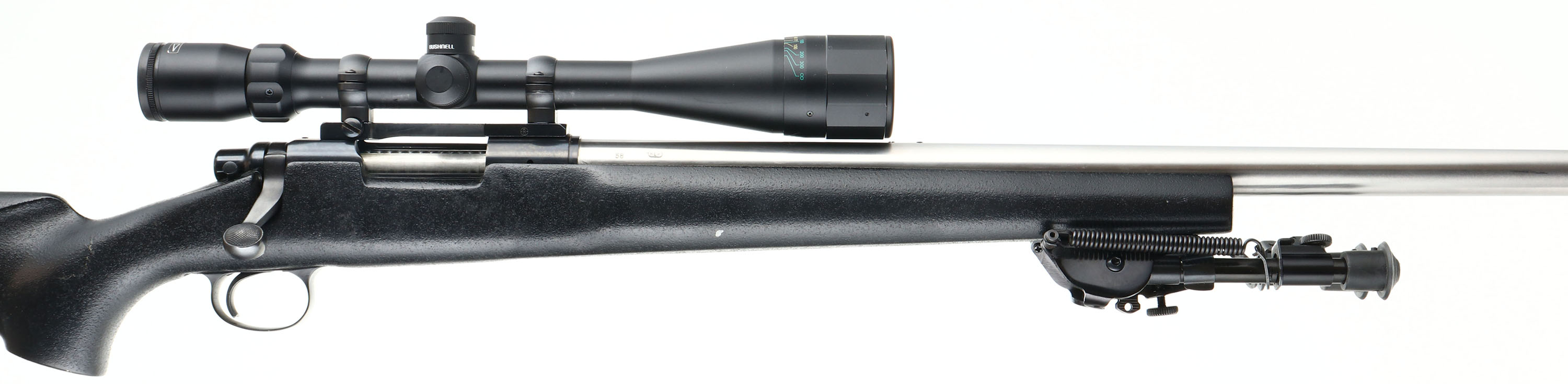 Remington, Model 40-XB KS, CAL: 22-250, MFG: 1987, SN: 055912B, Bolt Action Single Shot Rifle, 27 1/4'' barrel. Built by Remington Custom Shop, first year production. The original raised cheek & flat pistol grip Kevlar stock, Aramid fiber finish, is excellent. There are a few handling marks to the finish. The bright finished stainless steel barrel is excellent. It comes tapped & drilled with filler screws for sight mounting, but come without sights from the factory. The metal blue finish on the receiver rates 98%. Bore is minty. The receiver carries a Bushnell Weatherproof 6-18x40 scope, held by a Redfield base. Stock carries a Remington solid recoil pad & an unmarked bi-pod. A must-have rifle for bench or target shooters. FFL Req. - Value: 1600 to 2400