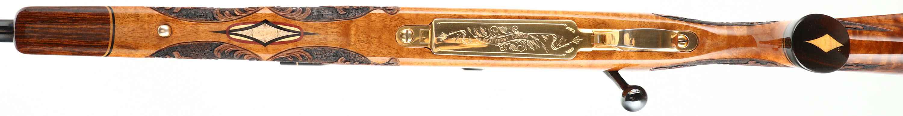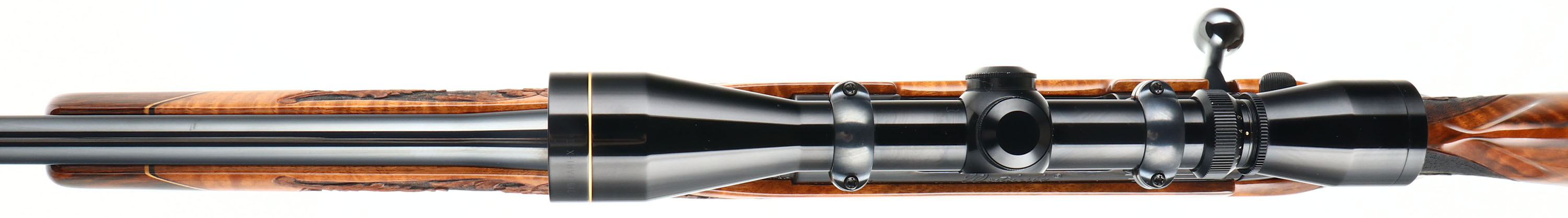 FABULOUS Factory Custom Shop Weatherby Custom Mark V, CAL: 300 Weatherby Mag, MFG: 1972-94, SN: H174525, Bolt Action Rifle, 25'' Tapered barrel, including muzzle break. The stock displays expertly executed & extensive, deep relief scroll leaf carvings & stippled background. The floor plate & inlaid diamond in the bottom of the forearm have beautiful hand accent engraving. The rifle mounted with a very finely figured, cheeked & pistol grip, Monte Carlo stock. The rippled & fiery grain within the walnut stock is fantastic. Stock features 3 layer contrasting rose wood forend tip & grip cap. The stock is nicely inlaid with four multi wood diamond/oval designs, with the one on the underside of the forend also containing the gold metal inscription plate accented with hand engraving. The original high gloss finish is excellent with only a couple of very minor handling marks. The original high luster metal blue finish is 99%. Bore is nearly mint. Rifle carries a Leupold 3x9 Vari-XIIc Scope, no open sight provisions. Buttstock carries a Weatherby, ventilated, brown rubber recoil pad. Jeweled bolt. Sling studs. This fabulous custom shop Weatherby is an example of their finest hand craftsmanship & is highly collectible as a true work of art. FFL Req. - Value: 4000 to 6500