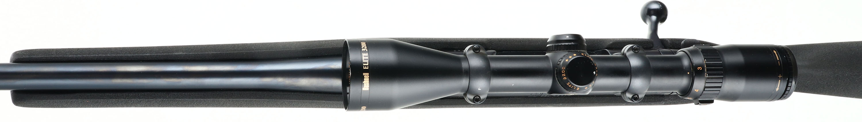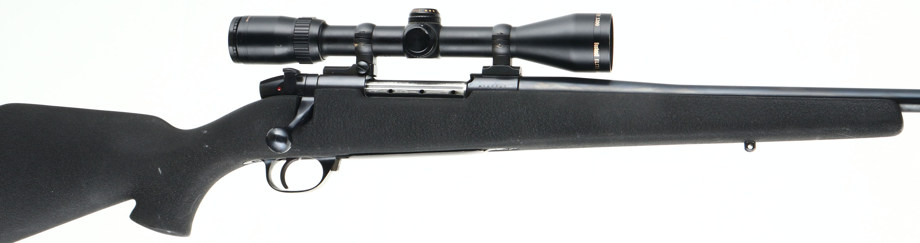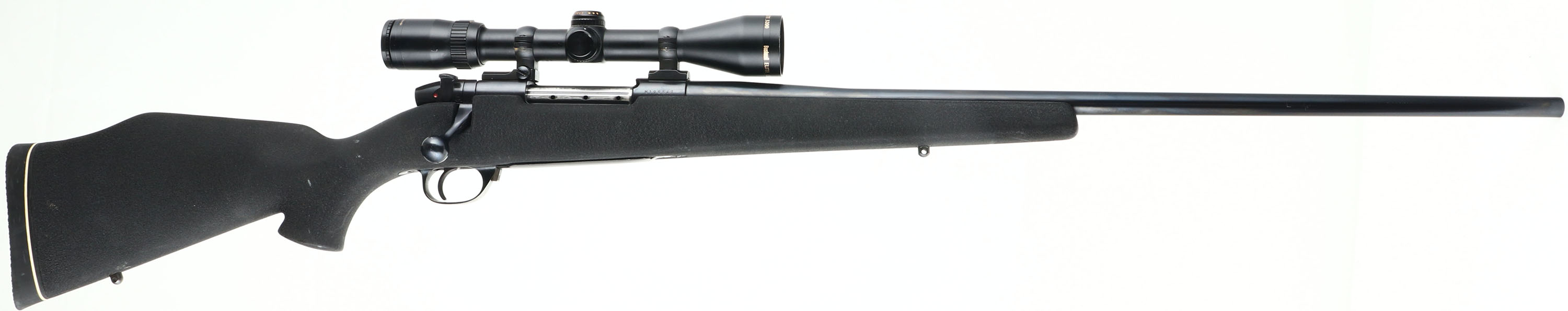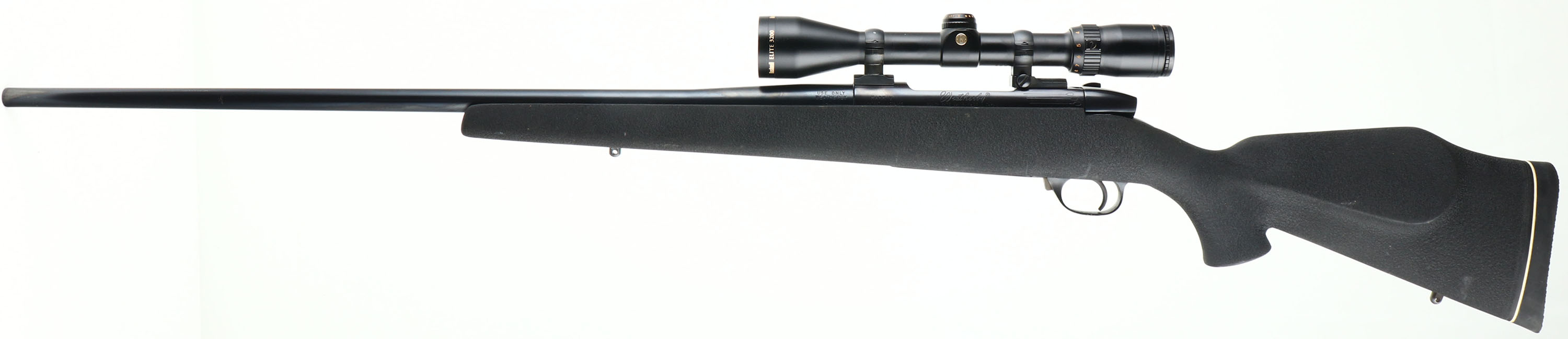 Weatherby, Mark V, marked 240 W.M. Cal., MFG. Modern SN: H196547, Bolt Action Rifle, 25 1/2'' tapered round barrel. The original cheeked & flat pistol grip, Monte Carlo synthetic stock is excellent, with very few minor rubs. The original metal blue finish rates 99%. Bore is excellent. The receiver carries a Bushnell Elite 3200 scope, while the barrel has no provisions for open sights. Sling studs. Overall excellent. FFL Req. - Value: 1000 to 2000