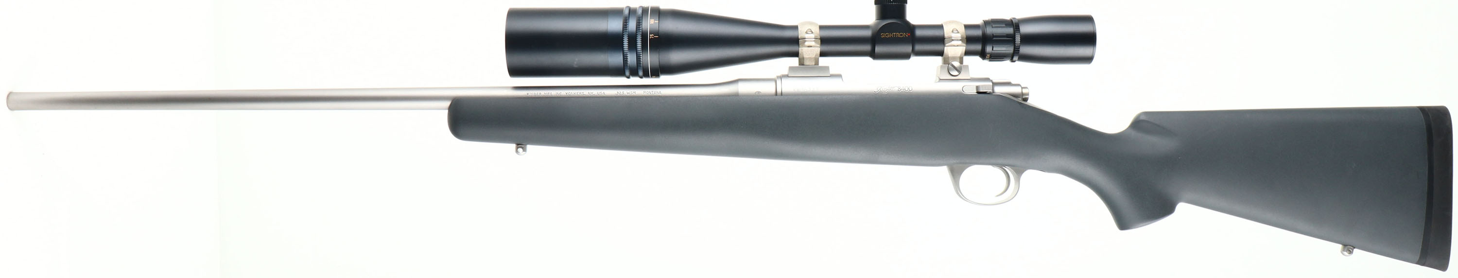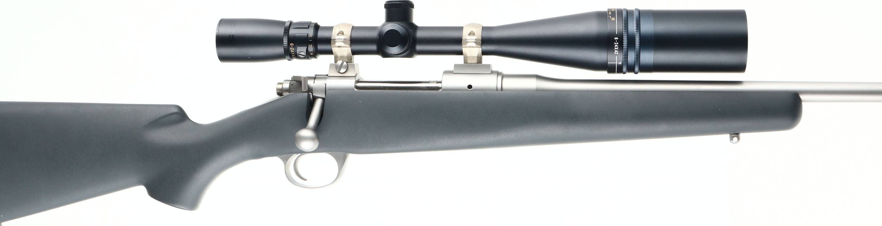 Kimber, Model 8400 Montana, CAL: 325 WSM, MFG: Modern, SN: KW06747, Bolt Action Rifle, 23 3/4'' barrel. The synthetic grey stock is excellent. The satin silver finish on the barrel & receiver is excellent, rating 99%. Bore is excellent. No open sight provisions. The rifle is fitted with a Sightron SII 6-24x42MD scope. Sling studs. Stock carries a Kimber solid recoil pad. Top load internal magazine capable of holding 4 rounds. A high quality modern hunting rifle, ready for the woods. FFL Req. - Value: 900 to 1600