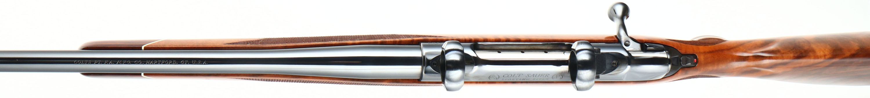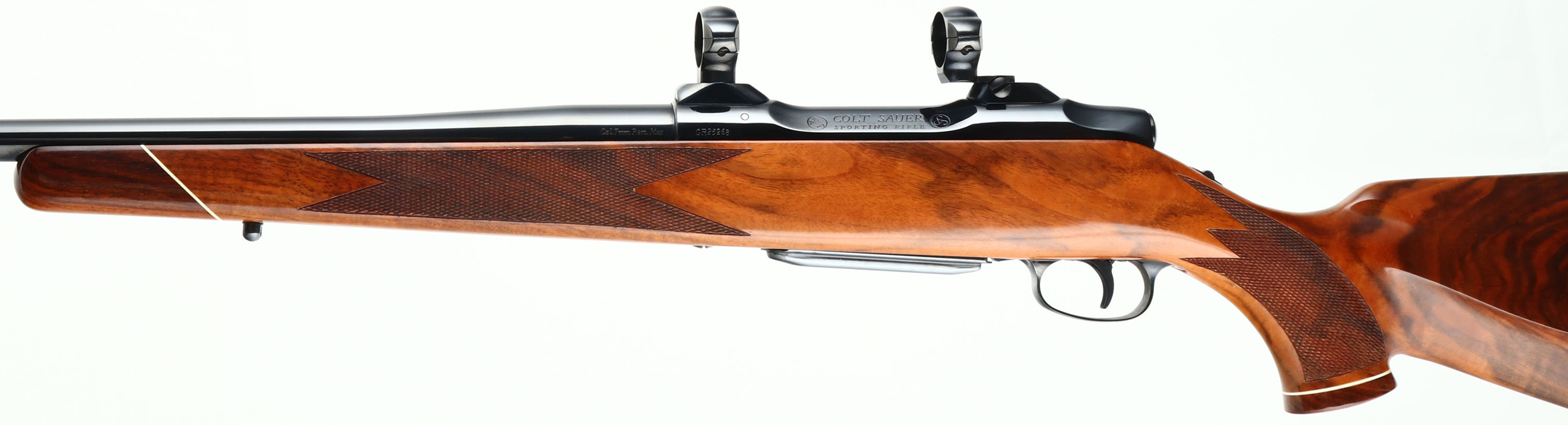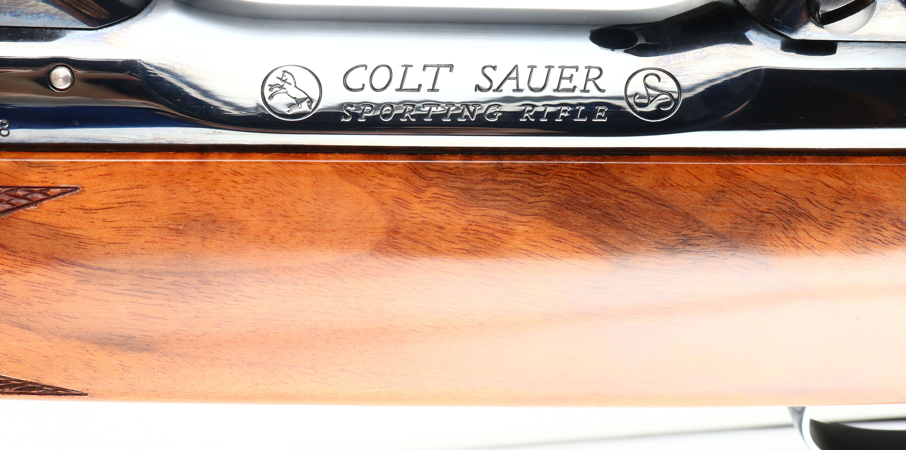 J.P Sauer & Sohn, Colt Sauer Sporting Rifle, CAL: 7mm REM MAG, MFG: 1983-84 (Produced 1971-84), SN: CR25268, Bolt Action Rifle, 23 1/2'' barrel. This rifle was marketed with a single word ''Incomparable''. Produced in W. Germany by J.P. Sauer & Sohn, these high-quality bolt-action rifles were built primarily for the American hunting market & shared specifications of USA-Colt. The rifles were introduced in 1971, saw a 14-year run & faded away in July of '84. The design was unique to the time. To increase operating speed, a Colt Sauers bolt locks up without rotating by utilizing three internally-cammed locking lugs. It is fed by a hefty steel single-stack magazine with the brand & caliber neatly engraved on the face of the follower. Colt Sauers are fitted with high grade American walnut stock with 18-line hand checkering & a high-gloss lacquer finish. A rosewood forend & grip cap add to the asthetic. The original checkered, capped & beaded cheek Monte Carlo style stock is excellent. The factory high-gloss finish is excellent. The deep blue metal finish rates 99% overall. Bore is excellent. The receiver is tapped & drilled, holding a pair of Redfield scope rings & bases. No open sight provisions. Sling studs present. Stock carries a Colt Sauer ventilated recoil pad. Original internally marked mag reads ''Colt Sauer 7mm Rem Mag''. These were not rifles made to be dragged through deer swamps or left in the barn. Rather, they were a balance between exceptional hunting performance & the artwork of fine gun builders. High condition, all original examples like this one have become quite collectible & command high values. FFL Req. - Value: 2500 to 4500