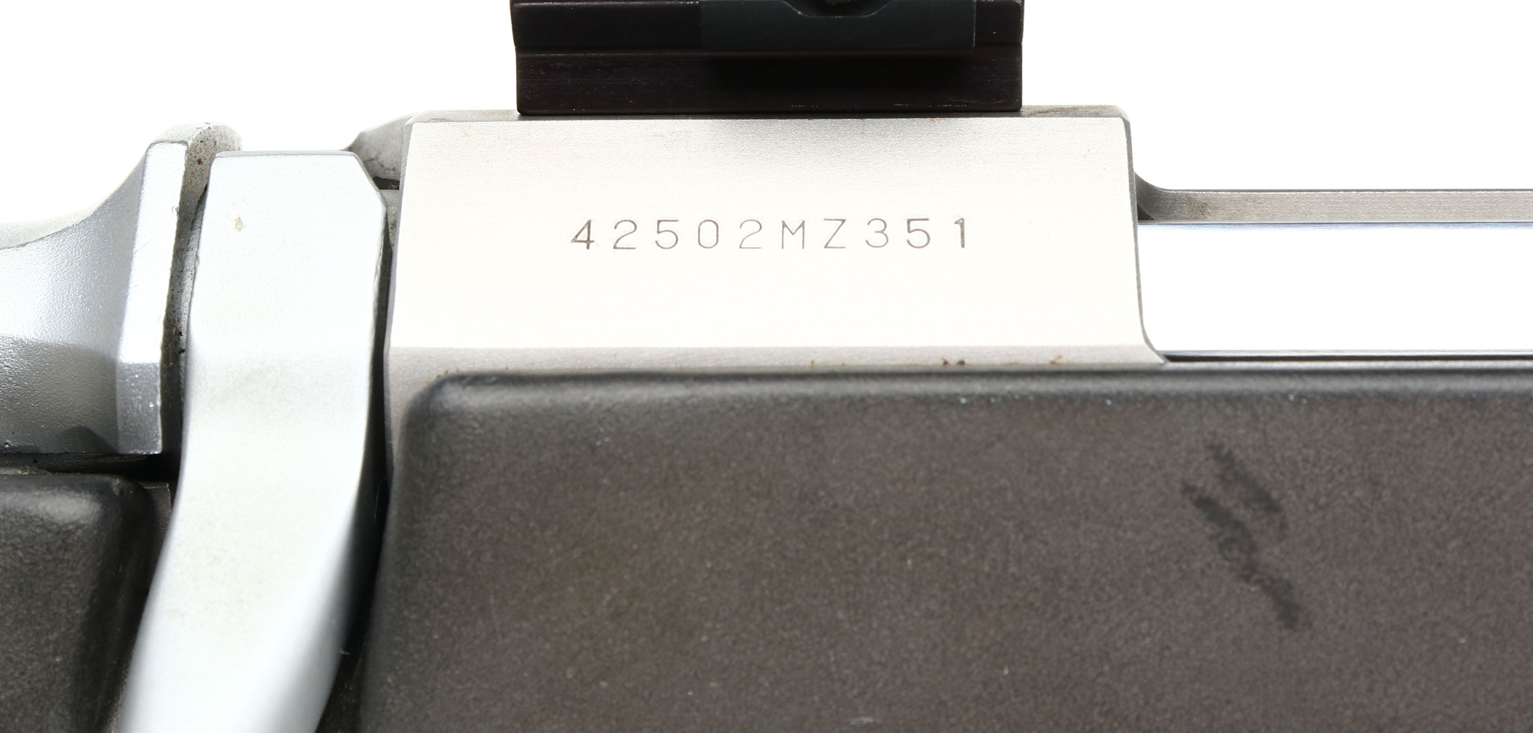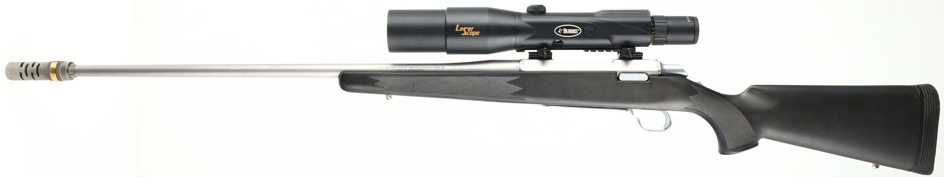 Browning, A- Bolt, CAL: 300 Rem Ultra Mag, MFG: Modern, SN: 42502MZ351, Bolt Action Rifle, 26'' barrel (27 3/4'' w/ muzzle break). The synthetic, checkered & flat pistol grip stock is excellent. There are light handling marks from light use. The stainless steel finish rates 98% overall. Bore is excellent. The receiver carries a Burris Laser Scope 4x-12x. These scopes (when new) retail for around $1000. (Note: If used for hunting, these integrated laser rangefinder scopes are not legal in some states, because of the advantage they provide.) No open sight provisions. Stock carries a LimbSaver solid recoil pad. Sling studs. A ready-to-go hunting rifle, with a fantastic scope. FFL Req. - Value: 1000 to 1500