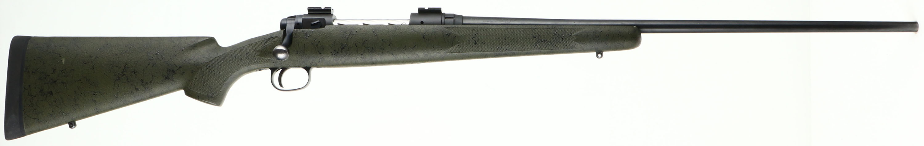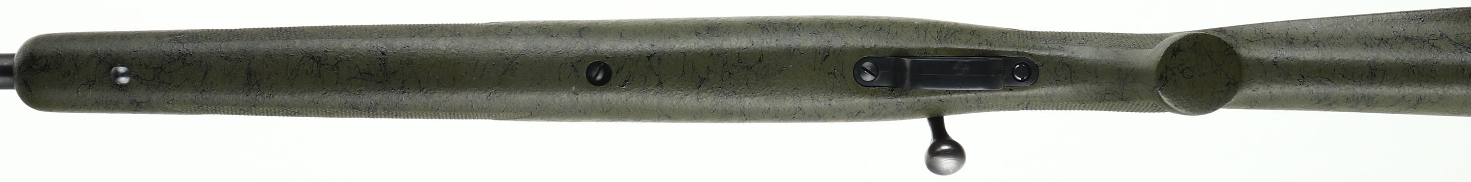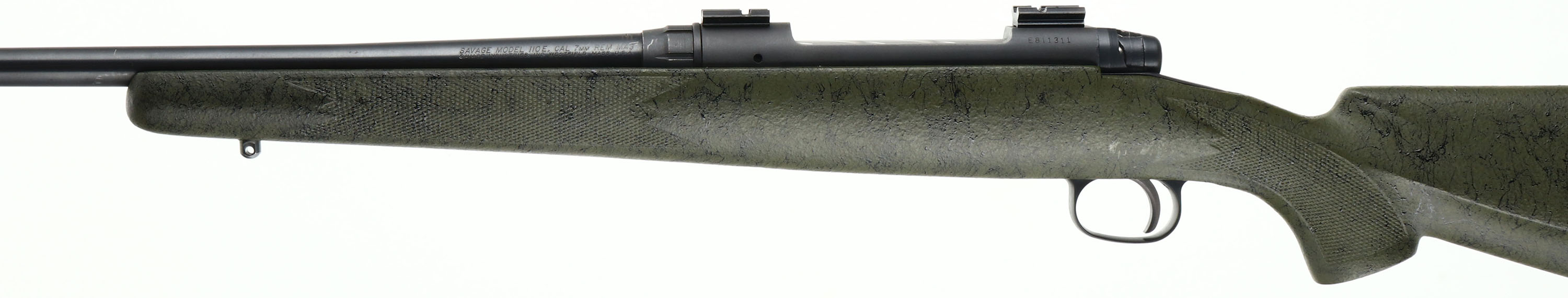 Savage, Model 110E, CAL: 7mm Rem Mag, MFG: Modern, SN: E811311, Bolt Action Rifle, 24'' Tapered barrel. The original & unique green, & black speckled, checkered & flat pistol grip synthetic stock is basically mint. The original metal blue finish rates 99%. Bore is excellent. The receiver holds two scope mounting blocks & no open sight provisions on the barrel. Stock carries a solid recoil pad. Twist pattern bolt. Sling studs. An almost new condition rugged & all-weather hunting rifle. FFL Req. - Value: 400 to 650