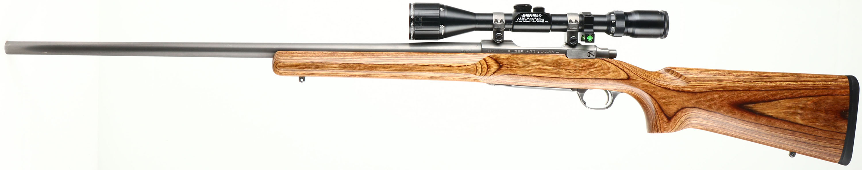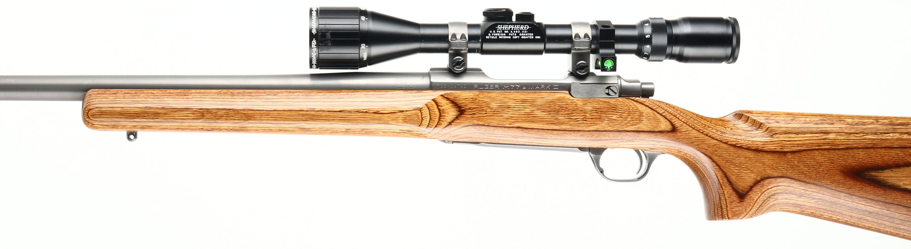 Custom Rifle, Ruger M77 Mark II, CAL: .308 WIN, MFG: Modern, SN: 785-29793, Bolt Action Rifle, 26'' barrel. The original laminated flat pistol grip wood stock, with wide base beavertail forend is excellent. There are minor handling marks to the finish. The factory satin gray finish rates 97%. Bore is excellent. The receiver holds a Shepherd 3x10 scope, with a Vortex level. No open sight provisions. Stock carries a factory Ruger solid recoil pad. Sling studs. Comes with a set of Hornady Custom-Grade New Dimension Dies .308 WIN caliber. FFL or C&R. - Value: 800 to 1200