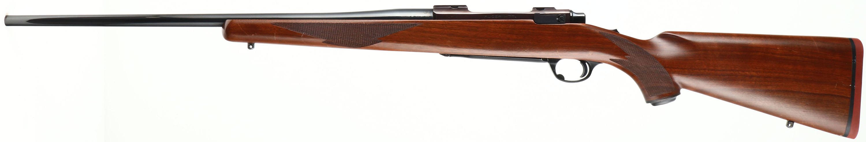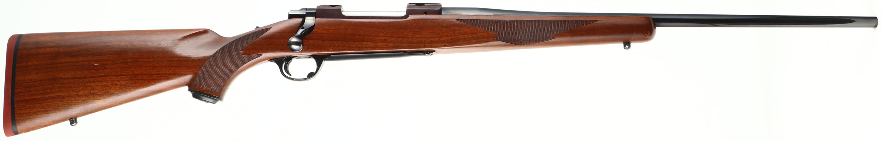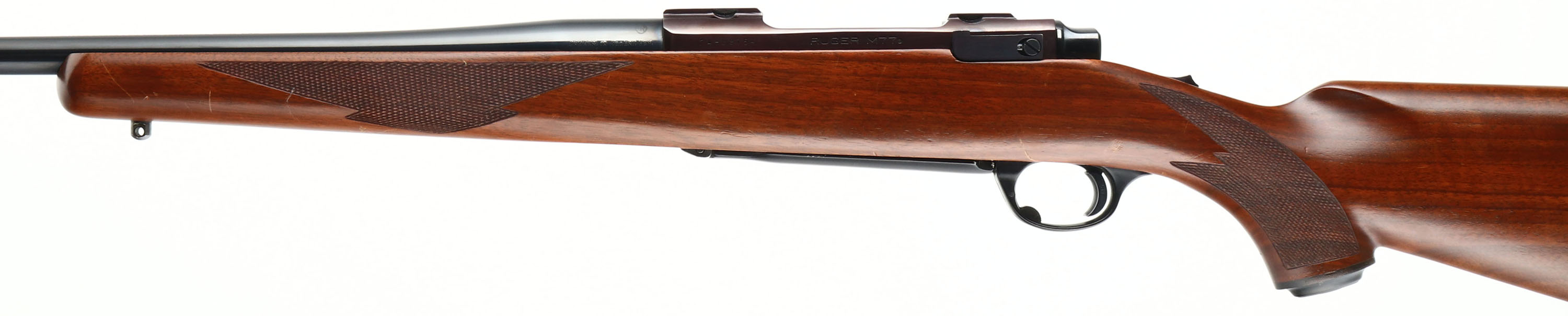 UNCOMMON, Ruger, Model M77, RARE CAL MARKING: 280 Rem or 7mm Exp. Rem, MFG: 1981, SN: 74-89154, Bolt Action Rifle, 22'' barrel. The original checkered & capped pistol grip wood stock is excellent. There are some minor scrapes & dings to the original finish. The original metal blue finish rates 98% overall. The receiver finish has typically toned plum. Bore is excellent. No open sight provisions. The receiver has integrated scope ring slots. Sling studs. Stock has factory Ruger solid recoil pad. Uncommon dual caliber marked barrel. The .280 Remington cartridge is also known as 7mm-06 & 7mm Express Remington. Remington renamed the .280 cartridge in late 1978 to 7mm-06 Remington, but just before the end of the year they renamed it again to 7mm Express in an attempt to increase sales. This change resulted in people confusing 7mm-06 with the 7mm Remington Magnum, and Remington changed the name back to .280 in 1981. With the ammo manufactured under several names, after Remington flip-flopped on the name, Ruger wanted the owner to know ammo marked either way was ok to use, hence the dual caliber marking. FFL Req. - Value: 700 to 1200