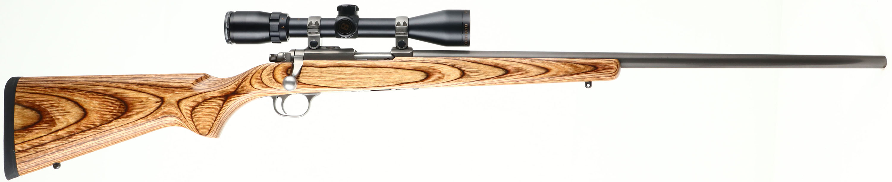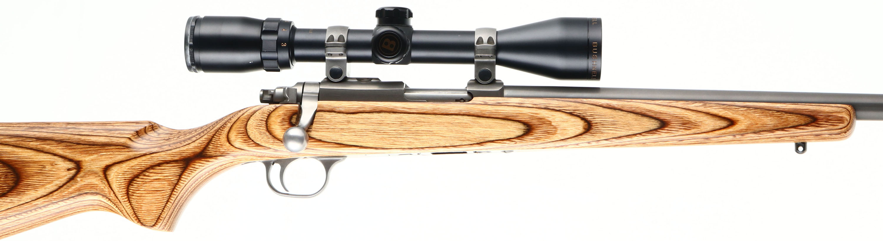 Ruger, All-Weather 77/22, CAL: 22LR, MFG: 2000, SN: 702-41478, Bolt Action Rifle, 24'' barrel. The laminated flat pistol grip stock is excellent. There are a few handling marks & dings to the clear coat finish. The matte gray ''All Weather'' finish on the barrel & receiver is excellent, rating 99% overall. Bore is excellent & minty. The receiver holds a Bushnell Banner 3-9x40 Wide Angle scope. No open sight provisions. Stock carries a factory Ruger solid black rubber recoil pad. Sling studs. FFL Req. - Value: 600 to 1000