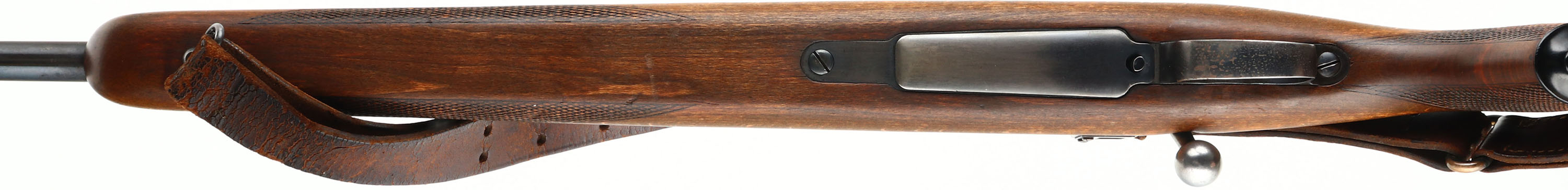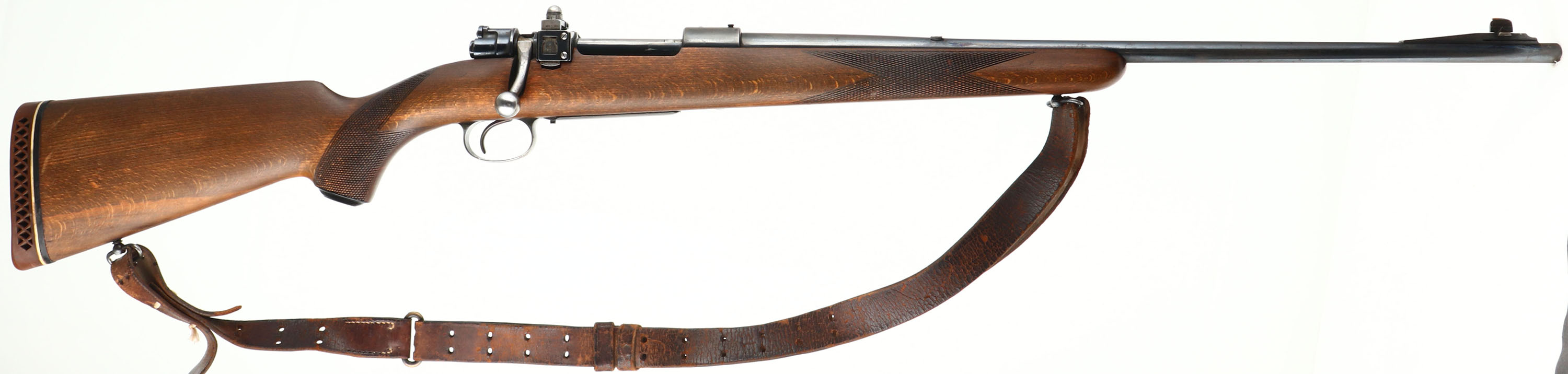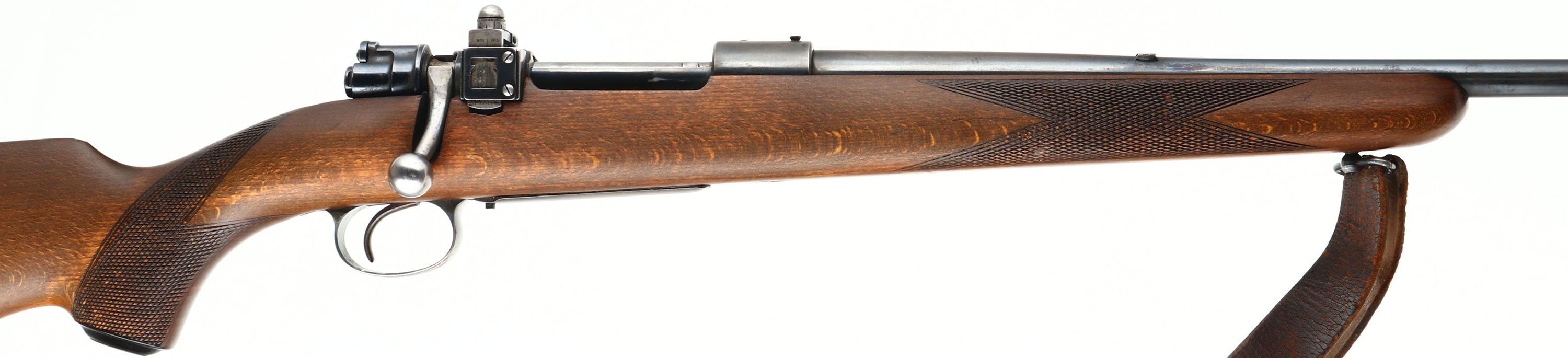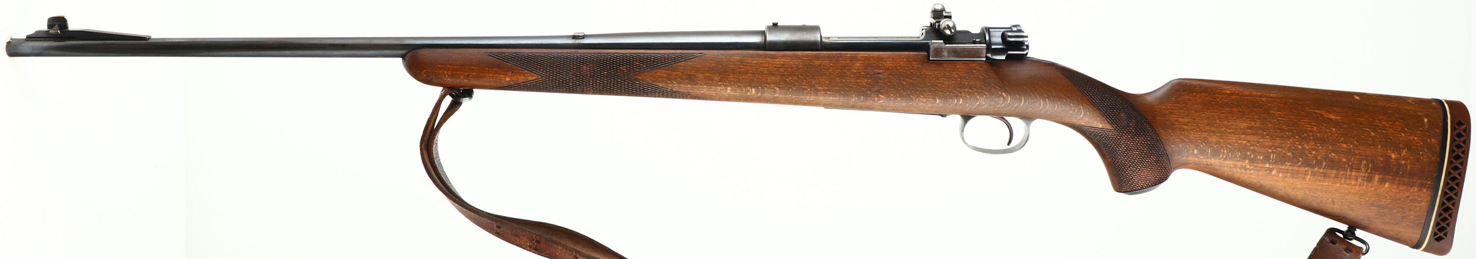 Husqvarna, Repeating Rifle 640, CAL: 30-06, MFG: 1951, SN: 116576, Bolt Action Rifle, 23 5/8'' barrel. The checkered & capped flat pistol grip wood stock is very good & solid. There is a 2'' crack off the back of the receiver & a small 1'' grain crack coming off the back of the trigger guard, otherwise in great condition. The metal blue finishes are a combination of original blue & added blue finishes rating 85% overall. Bore is excellent. The receiver has a side mounted Redfield adjustable rear sight & its also tapped & drilled, with (4) screw filled holes. The barrel has a blank filled rear dovetail & a ramp elevated blade front sight. Stock carries a Pachmayr ventilated recoil pad. Comes with leather sling. A utilitarian hunting rifle built on one of the most durable actions ever made. FFL or C&R Req - Value: 300 to 500